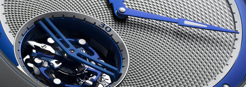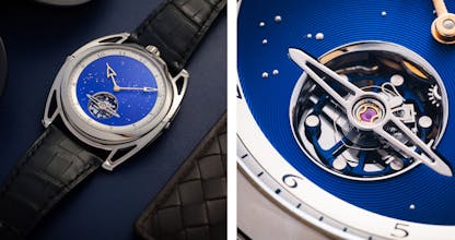 But this limited edition of 10 pieces is more than just a precision instrument; it’s a beauty. Each example includes a fire-blued grade five titanium hour ring and matching blued hands at center. The silvered dial is an example of authentic rose-lathe (i.e., reductive) guilloche in a dynamic “grain d’orge” or “barley corn” pattern. The case back of the XP Tourbillon is embellished with a miniature of the solar system’s planetary alignment on the night of November 19, 2011, the evening of De Bethune’s landmark “Aiguille d’Or” overall win at that year’s GPHG.