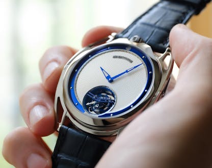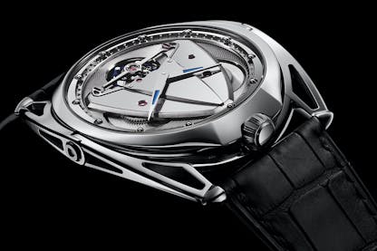 Be mindful that Audemars Piguet’s Royal Oak “Extra Thin” – the famed “Jumbo” – is a comparatively zaftig 8.1mm, and the extent of De Bethune’s achievement becomes apparent. The XP’s titanium case remains 43mm, and the signature spring-loaded “floating” lugs are retained. For that matter, all of the brand-defining technology from “triple pare-chute” shock protection to the proprietary balance and hairspring to the six-day power reserve are retained. The DB28XP offers more by means of less.