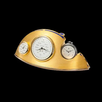 Strehler’s candidate piece for the LV Watch Prize is his Tischkalendar. The name is straightforward – it means, simply, “desk calendar” although the Tischkalendar is one of the most elaborate desk calendars ever made. It consists of a pocket watch, which docks with a cradle containing a perpetual calendar mechanism. Strehler describes its basic functions: “A pocket-watch displaying the time is inserted into the desk calendar unit which is, in fact, a perpetual calendar. Once the owner goes away from his desk, he takes the pocket watch with him. The desk calendar stops. Once the owner returns to his desk after some days or weeks, he inserts the pocket watch into the desk calendar. The desk calendar knows how long the owner was absent and sets the date right. It has a mechanical memory.”