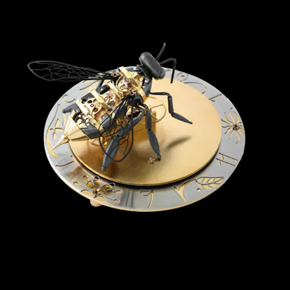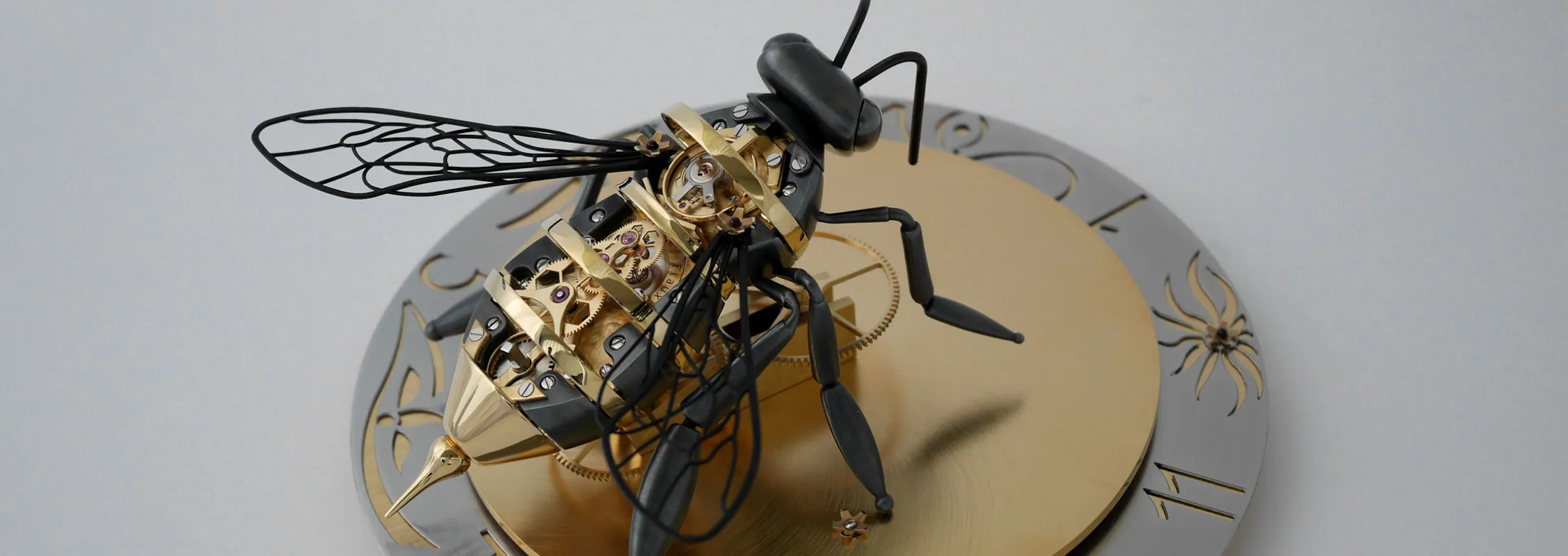 His candidate project for the LV Watch Prize is, continuing the theme of mechanical members of the order Hymenoptera, called L’Abeille (“The Bee”). L’Abeille consists of a clock mechanism, in the shape of a bee with a quite menacing looking stinger – the body of the bee contains the mainspring, going train, escapement, balance and balance spring, and is key-wound, like an old-fashioned pocket watch. You wind the Bee and then place it on its base, where it rotates around a fixed central wheel – come to think of it, in the same way that a tourbillon cage rotates around a fixed fourth wheel. The body of the Bee rotates once every twelve hours, with the stinger acting as the hour hand. I suppose that the clock is actually a kind of tourbillon, albeit a twelve-hour tourbillon.