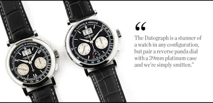 Last, and certainly not least, the Lange Datograph enters the ring as our last peak-level stealthy watch for any occasion. The Datograph is a stunner of a watch in any configuration, but pair a reverse panda dial with a 39mm platinum case and we’re simply smitten. Like most Lange watches, you’ll spend as much time drooling over its backside as you will its dial, as the innovative and beautifully hand-wound caliber L951.1 is on full display through its sapphire caseback. A hand-engraved balance cock, beveled German silver bridges, and gold chatons for its jewels all play a small role in setting the caliber apart from the pack. On the dial side, if you know Lange, you can spot it a mile away, but regardless of the piece in question, loud and ostentatious isn’t really a part of their lexicon.
