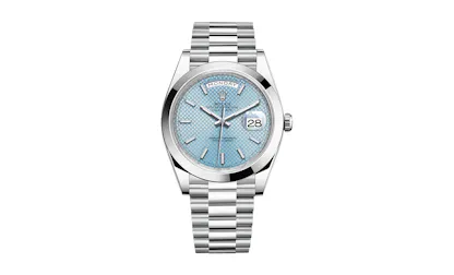 The Rolex Day-Date President in platinum is the quintessential example of stealth wealth in the Rolex catalog. Much like the platinum Rolex Daytona in the current collection, it is fitted with an ice blue sunburst dial that acts as a bit of a tell to those in the know, but otherwise, you’re looking at a simple and understated 36mm dress watch that could just about blend into the background. Though it looks more boardroom than sport/casual, the Day-Date’s combination of a screw-down crown and 100m water resistance means it will easily survive the perils of day-to-day wear. This reference had a fairly lengthy production run that lasted through the ‘00s and ‘10s before being replaced by a 40mm platinum reference in 2019. This reference is, of course, fitted with the classic Rolex President bracelet, complete with its hidden crown clasp.