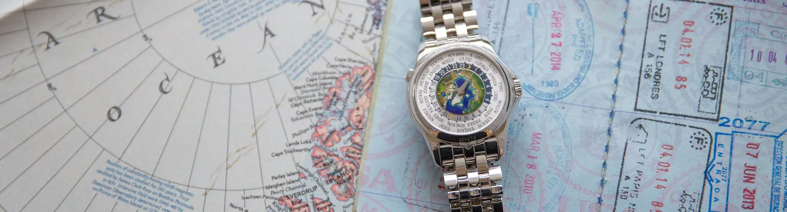 At the more approachable end of the spectrum, Frederique Constant offers one of the coolest bang-for-your-buck world time watches around. Fitted with an in-house manufacture automatic caliber, the piece features a sleek world map dial (available in a range of colors), with a radial guilloche subdial displaying a date indication at 6 o’clock. Its 42mm case wears surprisingly compact–more like a 40mm than a 42–and unlike many world timers in the category all of its setting functions are controlled via its crown. As a minor gripe, the addition of the date subdial means that the three cities at 11, 12, and 13h ahead are harder to read than the rest, but I would by no means consider that to be a dealbreaker in any respect.