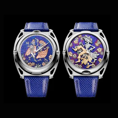 Dubbed the “Cempasúchil II,” this watch tells a spooky story through its two dials. On one side, two Calavera skulls mark the hours and minutes, dancing on a miniature stage. Flip the watch, and a hidden scene with animated Calavera figures springs to life at the press of a button at 12 o’clock.