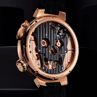 The Louis Vuitton Tambour Carpe Diem, housed in a bold 46.8mm pink-gold Tambour case, is a showcase of the brand’s artistic take on “memento mori,” a classic theme reminding wearers to embrace life with the knowledge of its finite nature. Featuring a skull on the dial and within the movement’s structural bridge, it’s an intricate expression of life’s fleetingness, symbolized by a golden hourglass that tracks the 100-hour power reserve. When fully wound, the hourglass appears “full,” a haunting reminder that time is always slipping away.
