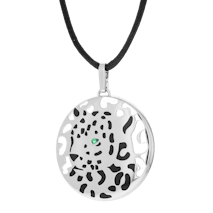 A pre-owned Cartier Love pendant in 18kt white gold and diamond. The necklace features a 17 inch long split cable chain with a lobster clasp and two high polished, interlocking rings stationed at the front. One ring features the signature screw-design evenly spaced around the outside, while the other ring features pave diamonds all the way around the outside. The eighteen (18) round brilliant-cut diamonds have a combined carat weigh of 0.22cts.