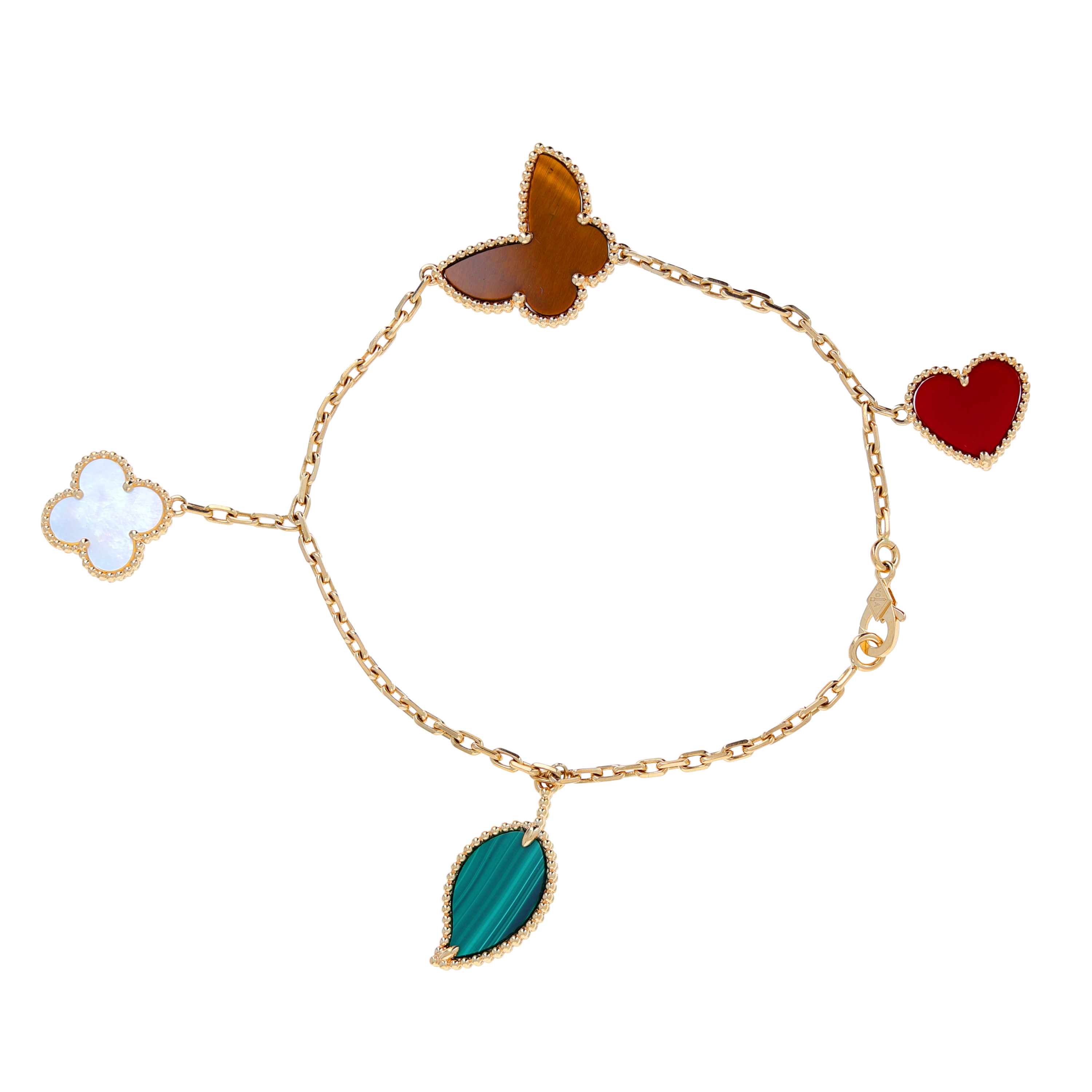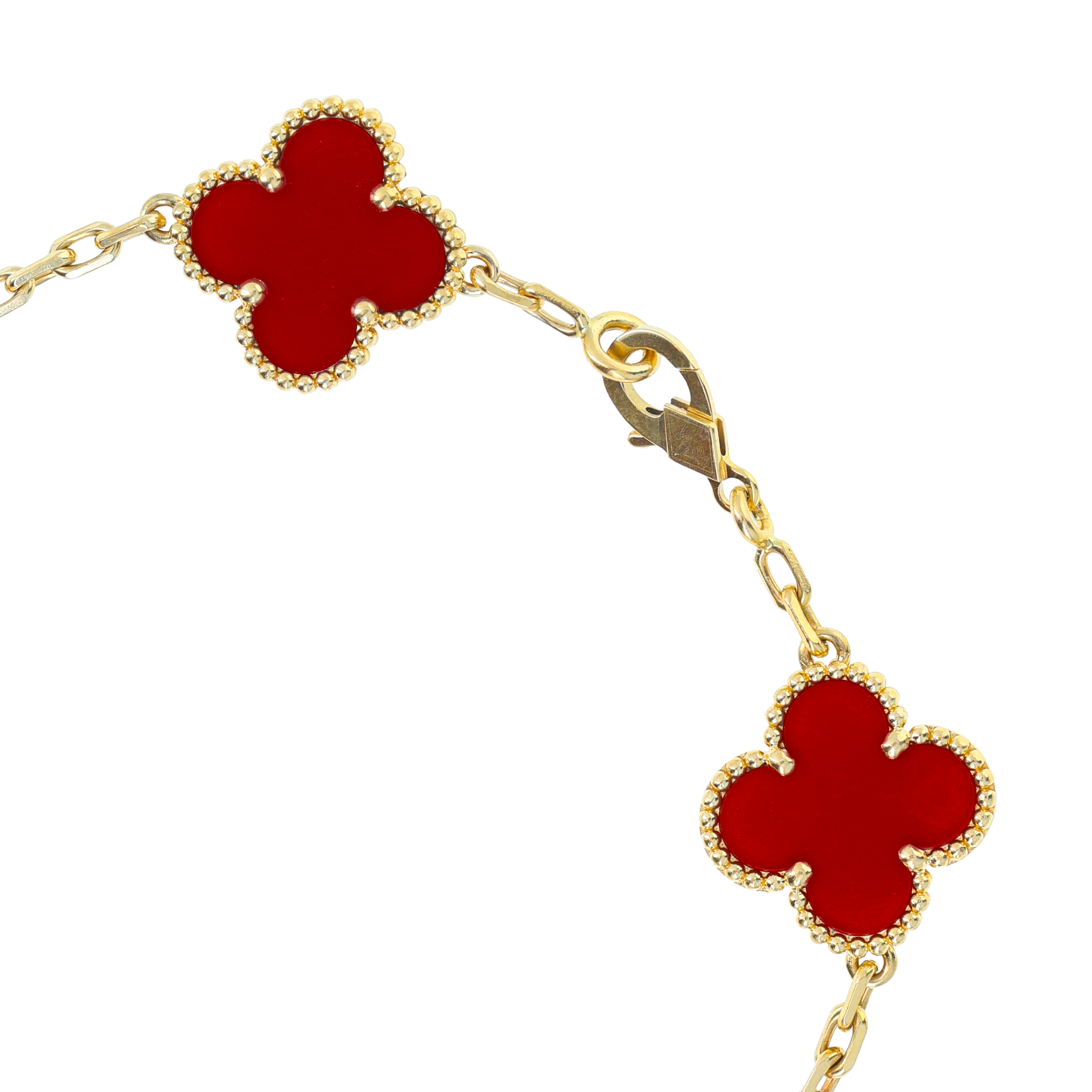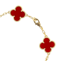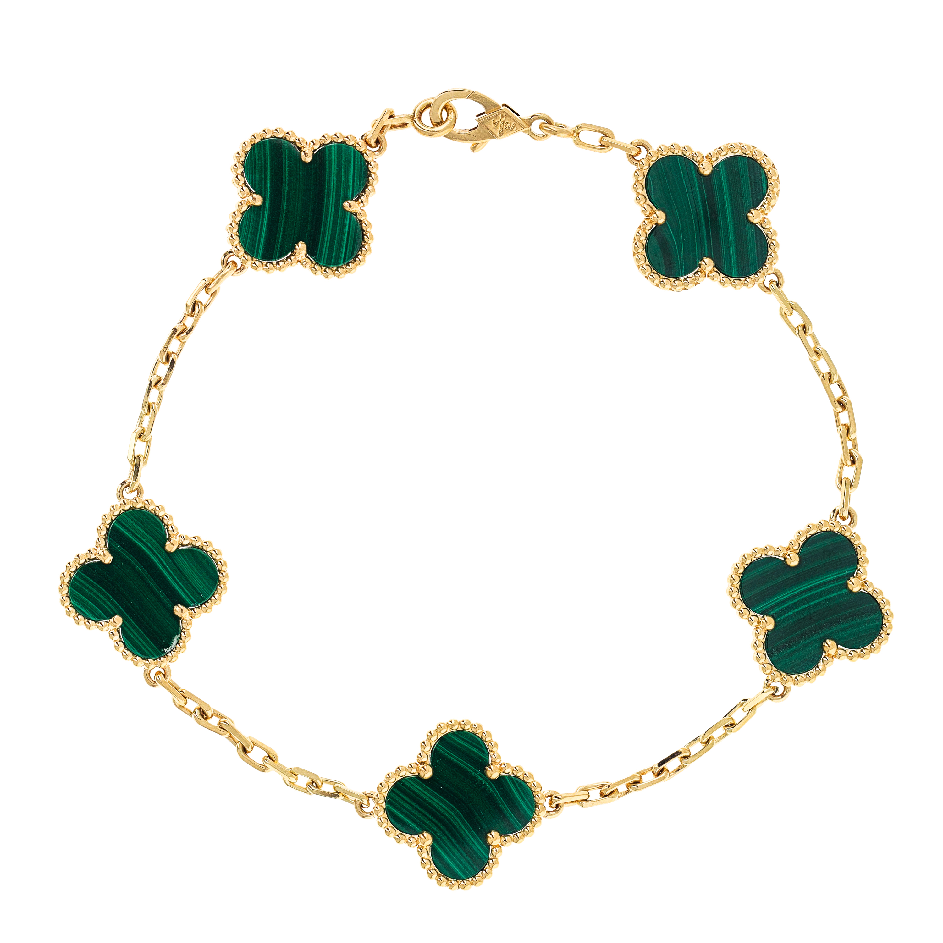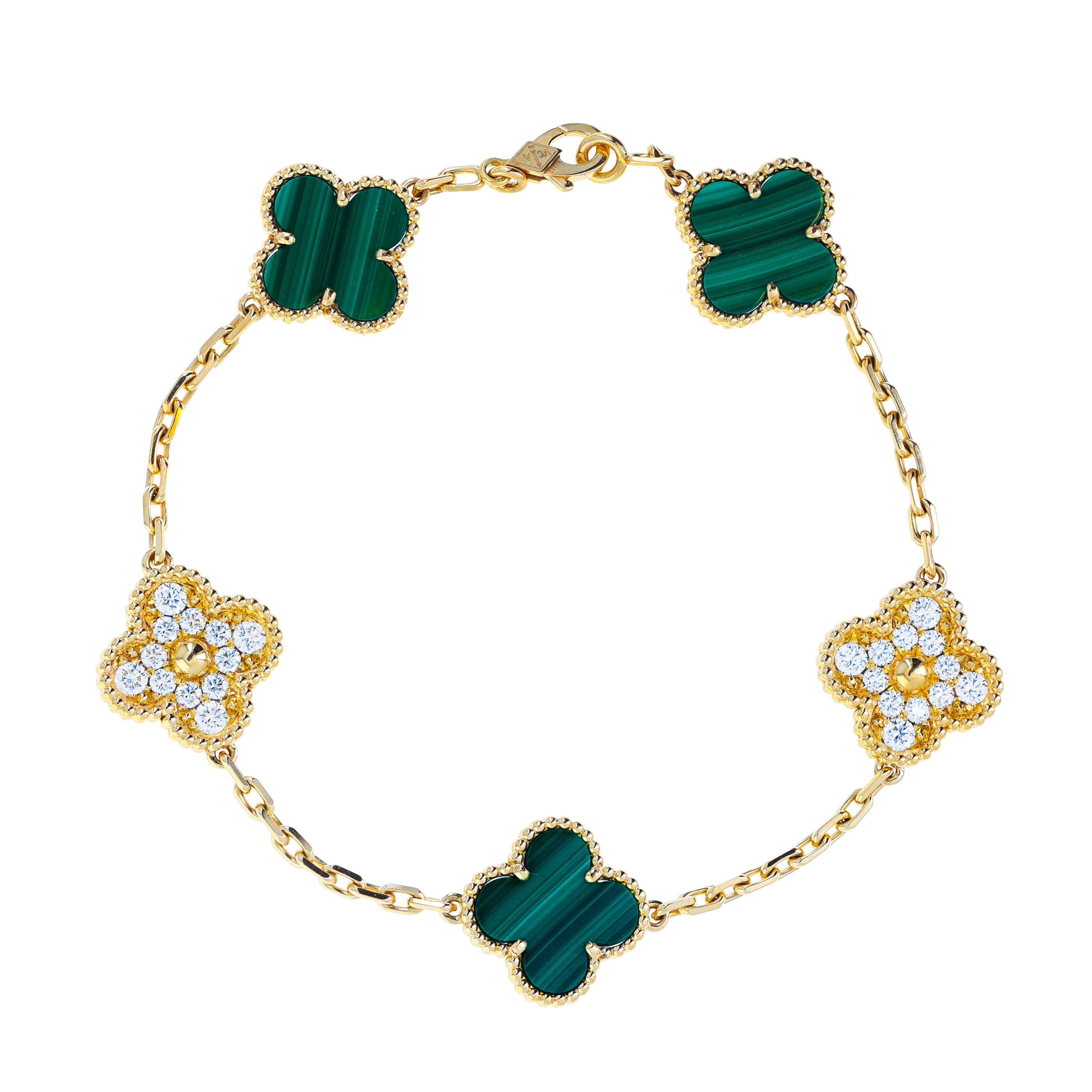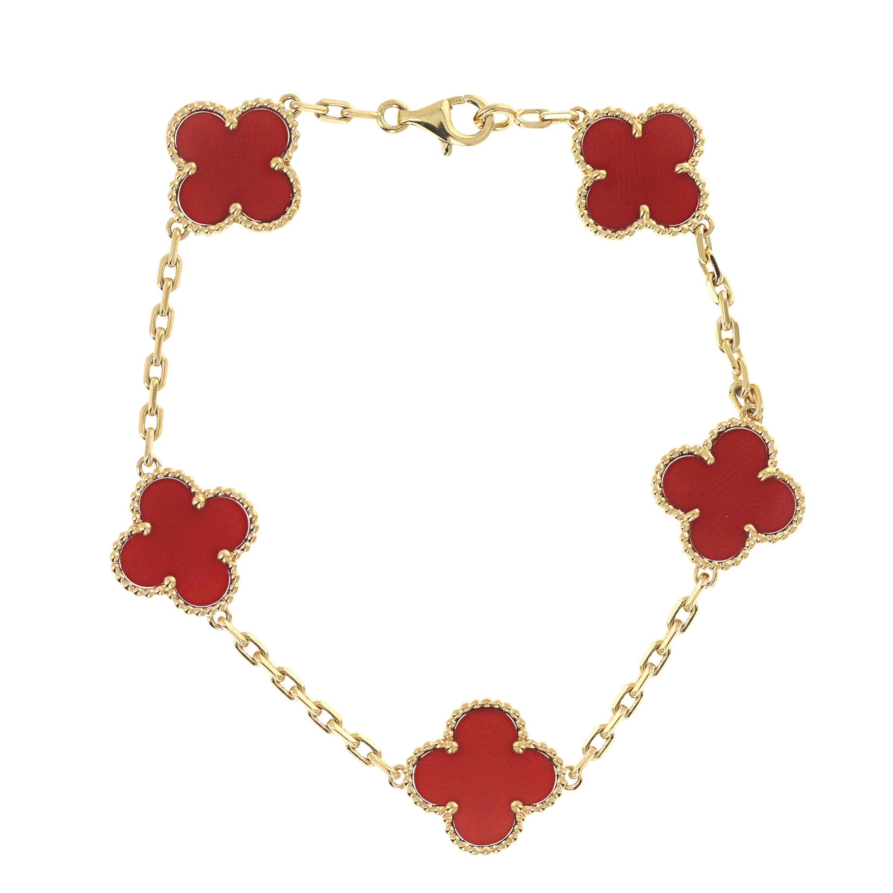 The Alhambra collection is perhaps the most recognizable of all Van Cleef designs. Featuring clover-shaped motifs that symbolize luck, love, and harmony, Alhambra bracelets are crafted in a variety of styles—from single-motif chains to multi-motif versions set in mother-of-pearl, onyx, or carnelian. Our pre-owned Alhambra selection offers access to styles that may no longer be in production..