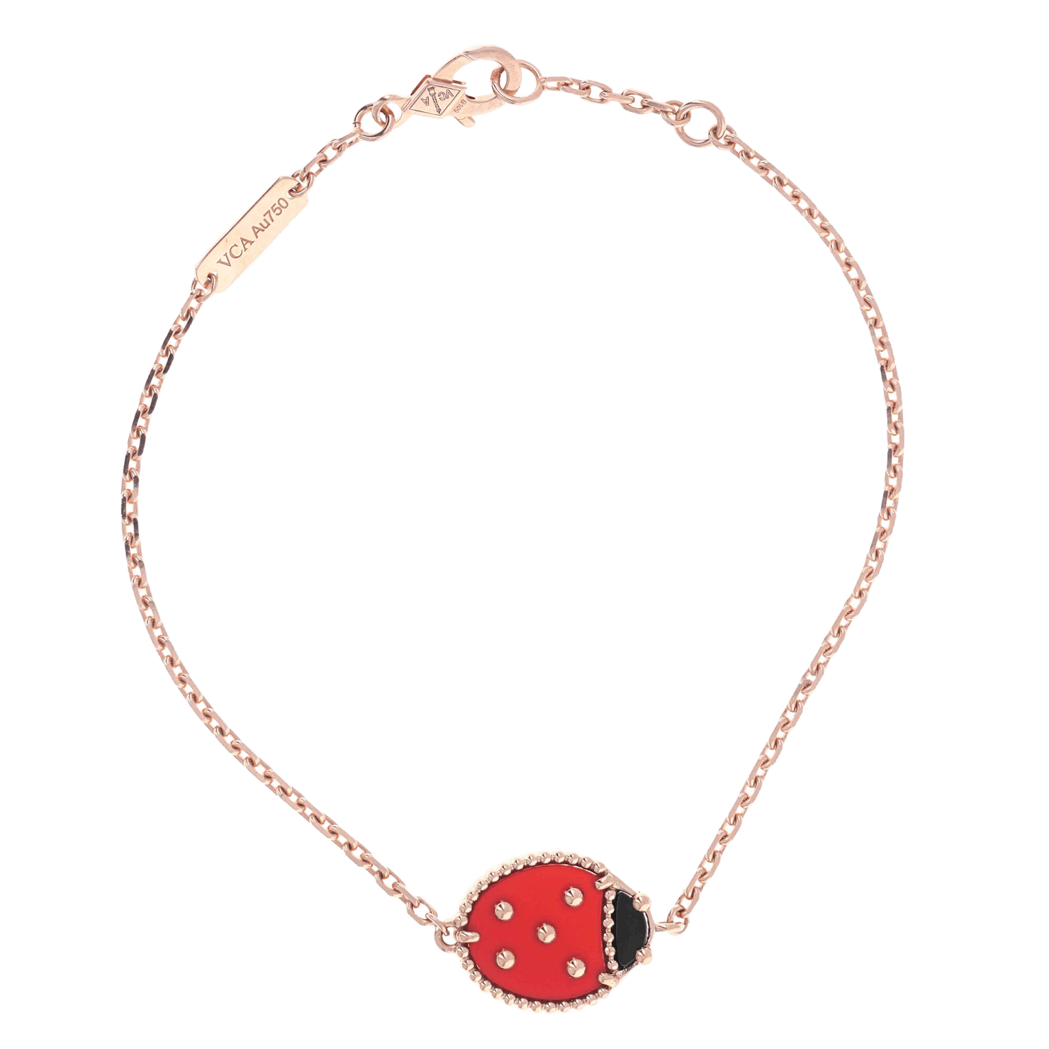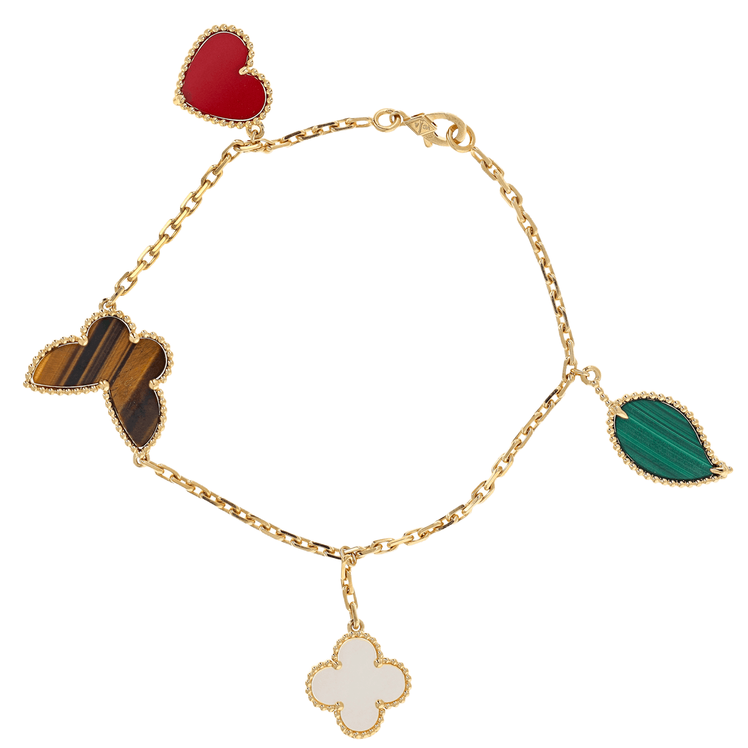 The Frivole collection captures nature in motion with heart-shaped petals and mirrored finishes. The Sweet Butterfly line offers delicate interpretations of one of Van Cleef's favorite themes. Both are available in chain bracelet styles, often accented with diamonds or colored gemstones for added radiance..