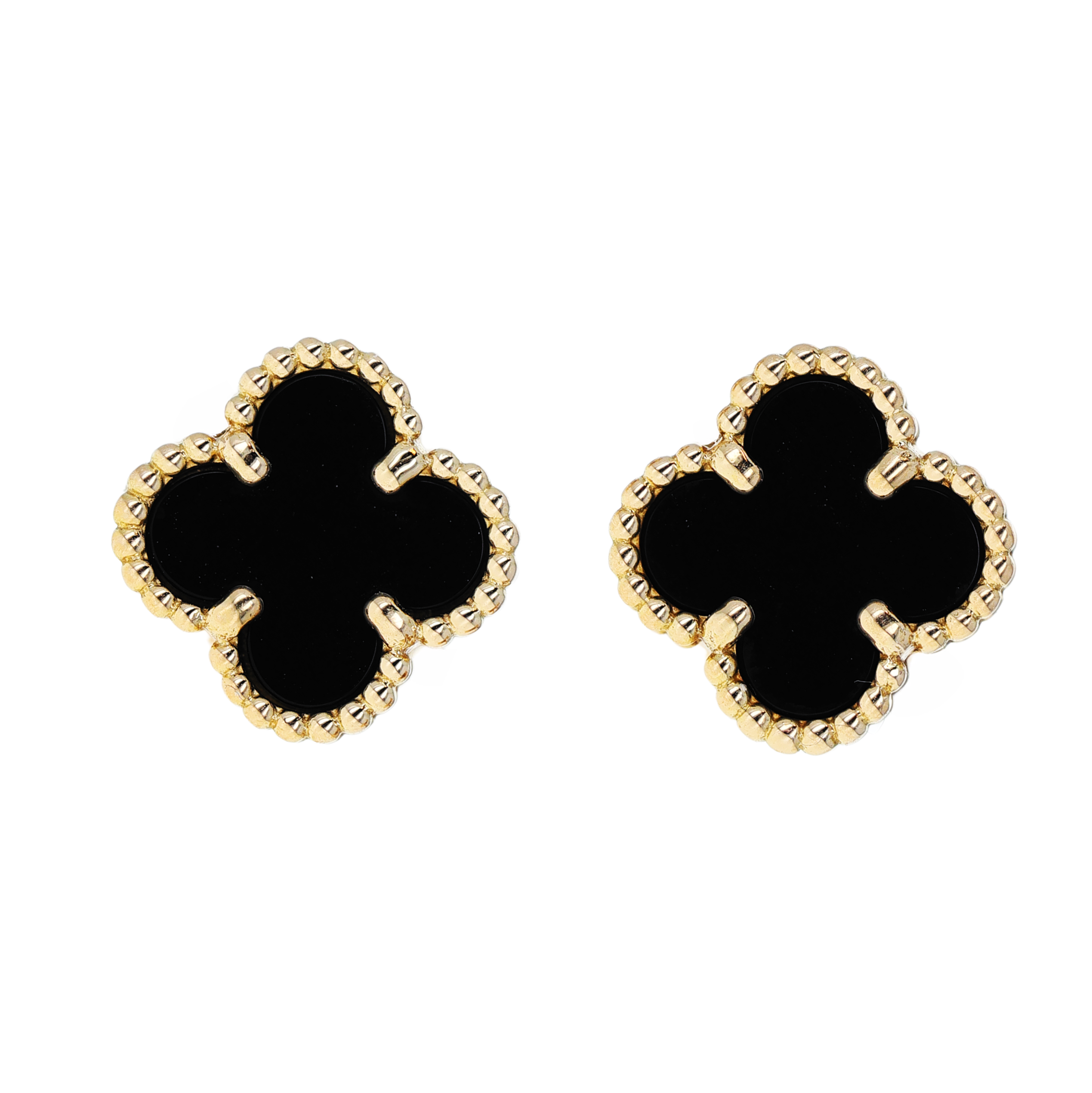 Introduced in 1968, the Alhambra collection remains one of Van Cleef & Arpels' most recognized designs. The quatrefoil shape, inspired by Moroccan architecture and associated with good fortune, is rendered in vibrant materials such as malachite, onyx, carnelian, turquoise, and mother-of-pearl. Our pre-owned assortment includes both Magic Alhambra and Vintage Alhambra earrings, available in yellow, white, or rose gold settings with or without diamond accents.