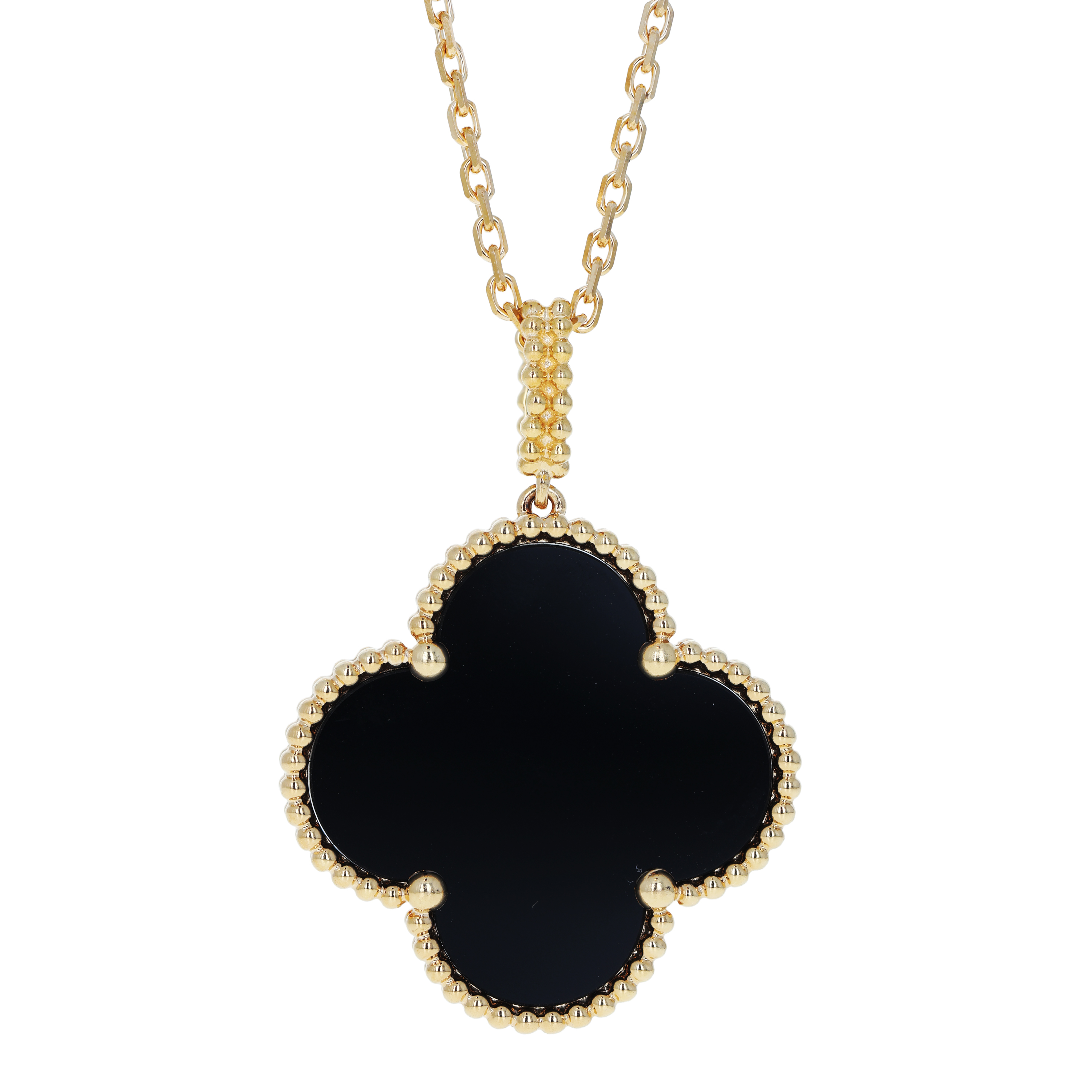 The Van Cleef Alhambra necklace is the brand's most recognizable design, built around the four-leaf clover motif symbolizing luck and protection. Our inventory often includes 10-, 20-, and Magic Alhambra necklaces, Vintage Alhambra pendants, and Sweet Alhambra pieces in materials such as mother-of-pearl, onyx, malachite, carnelian, and other hardstones, set in yellow, white, or rose gold. These vintage Alhambra pendants and necklaces remain highly sought after for everyday wear, layering, and special occasions.