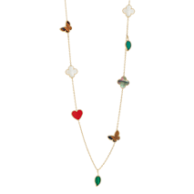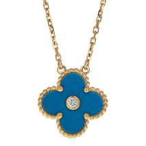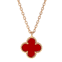 The Van Cleef Alhambra necklace is the brand's most sought-after design, featuring the four-leaf clover motif symbolizing good fortune. Our certified pre-owned inventory includes 10-, 20-, and Magic Alhambra necklaces in materials like mother-of-pearl, malachite, onyx, and carnelian, set in yellow, white, or rose gold. These lucky charms remain in demand for collectors worldwide.