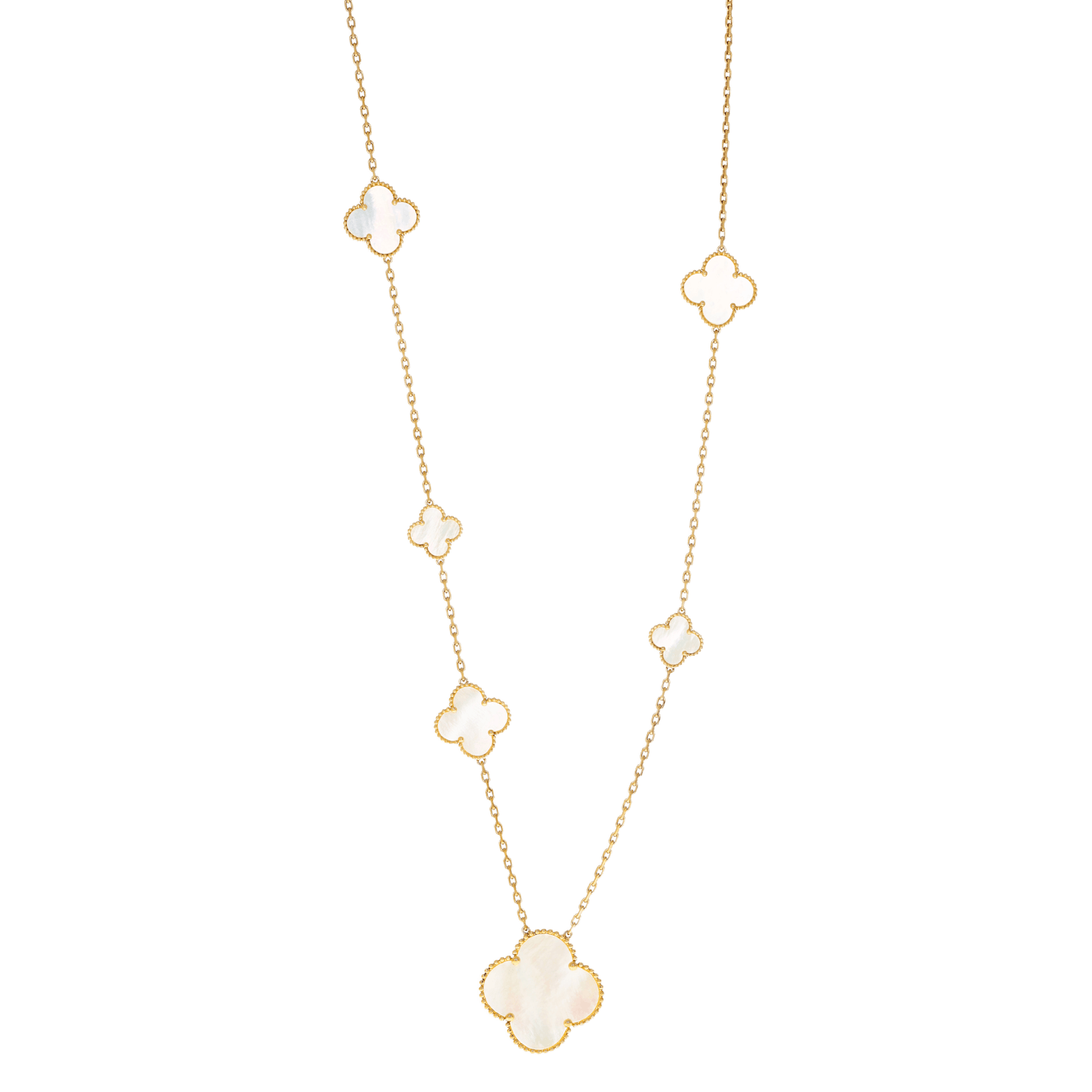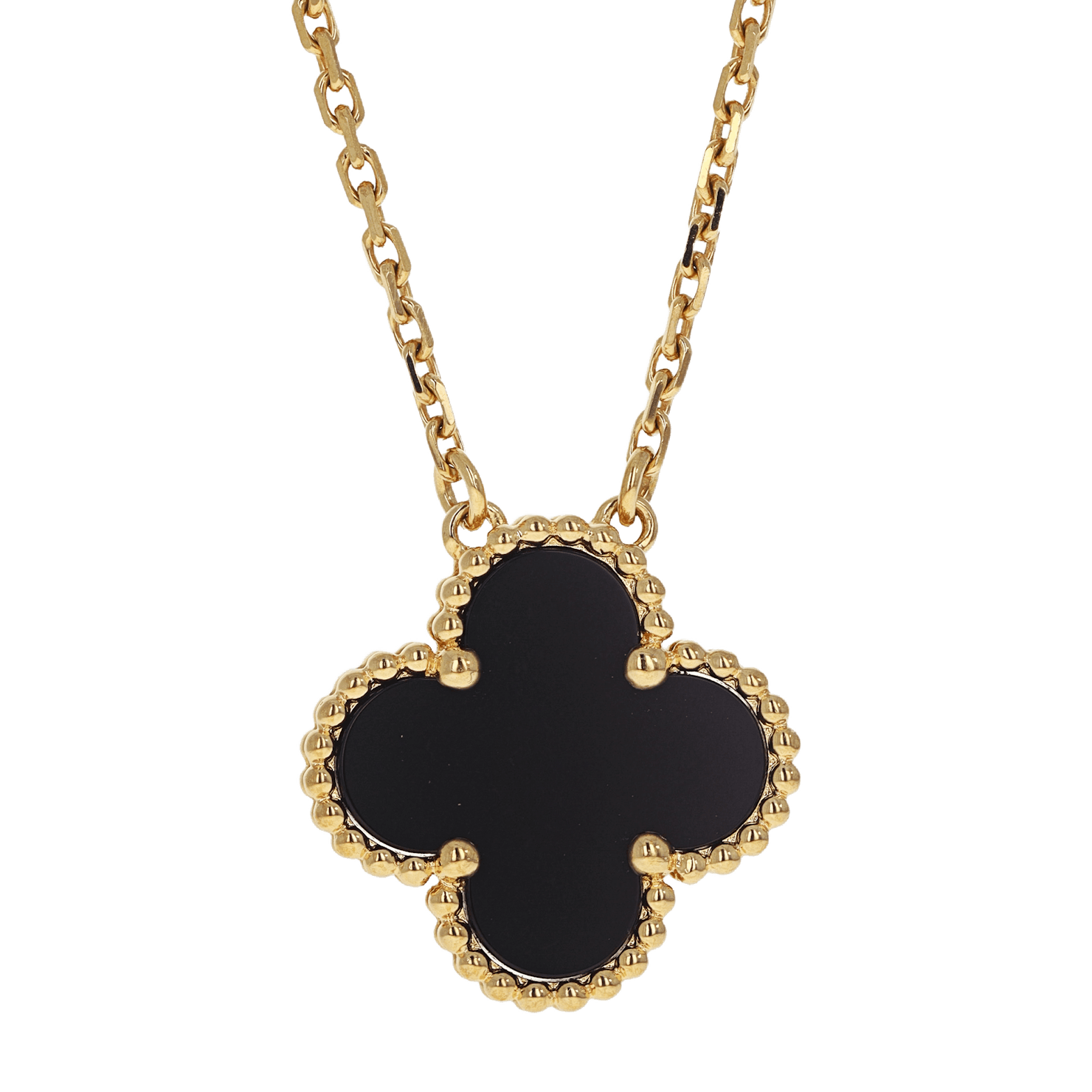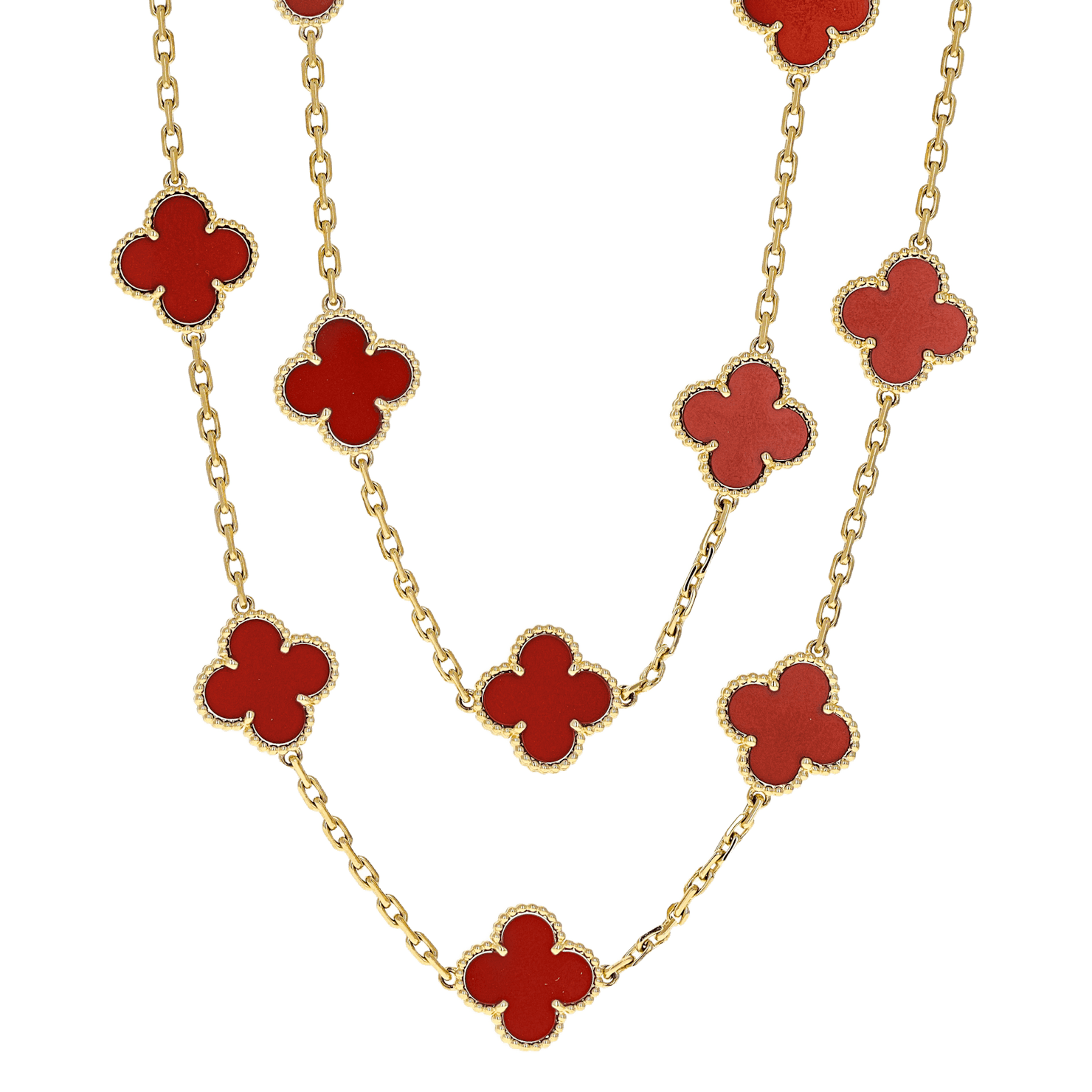 The Van Cleef Alhambra necklace is the brand's most sought-after design, featuring the four-leaf clover motif symbolizing good fortune. Our certified pre-owned inventory includes 10-, 20-, and Magic Alhambra necklaces in materials like mother-of-pearl, malachite, onyx, and carnelian, set in yellow, white, or rose gold. These lucky charms remain in demand for collectors worldwide.
