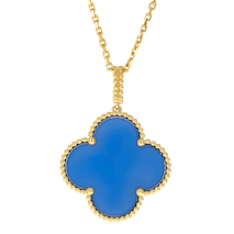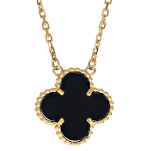 The Van Cleef Alhambra necklace is the brand's most sought-after design, featuring the four-leaf clover motif symbolizing good fortune. Our certified pre-owned inventory includes 10-, 20-, and Magic Alhambra necklaces in materials like mother-of-pearl, malachite, onyx, and carnelian, set in yellow, white, or rose gold. These lucky charms remain in demand for collectors worldwide.