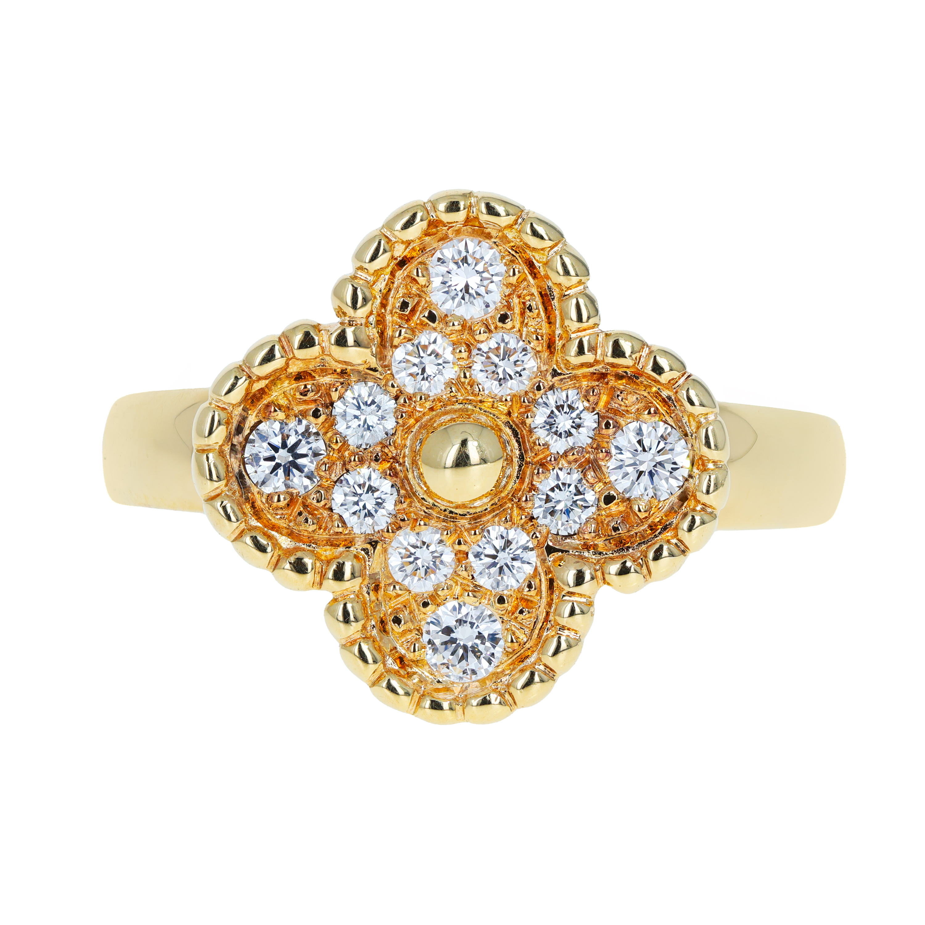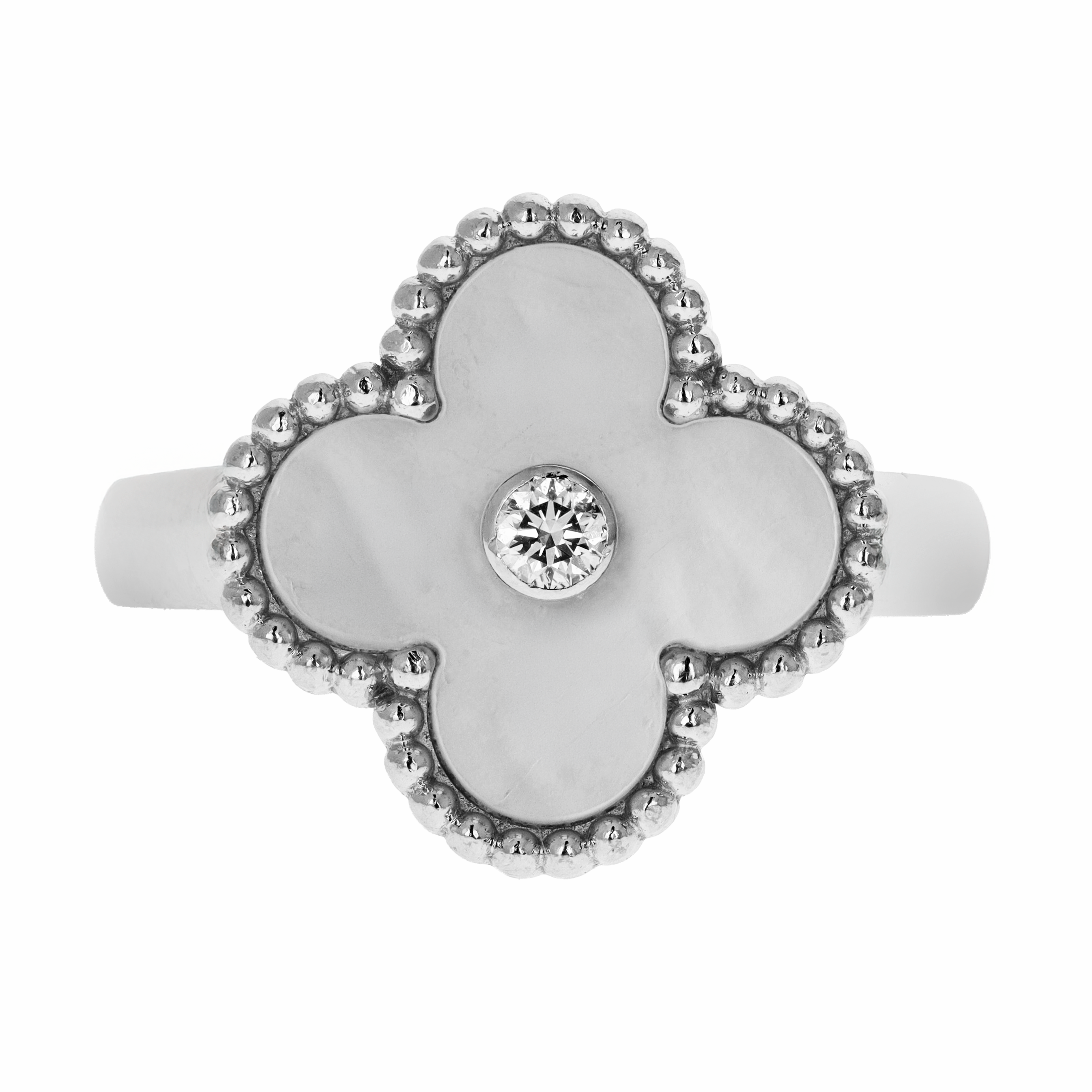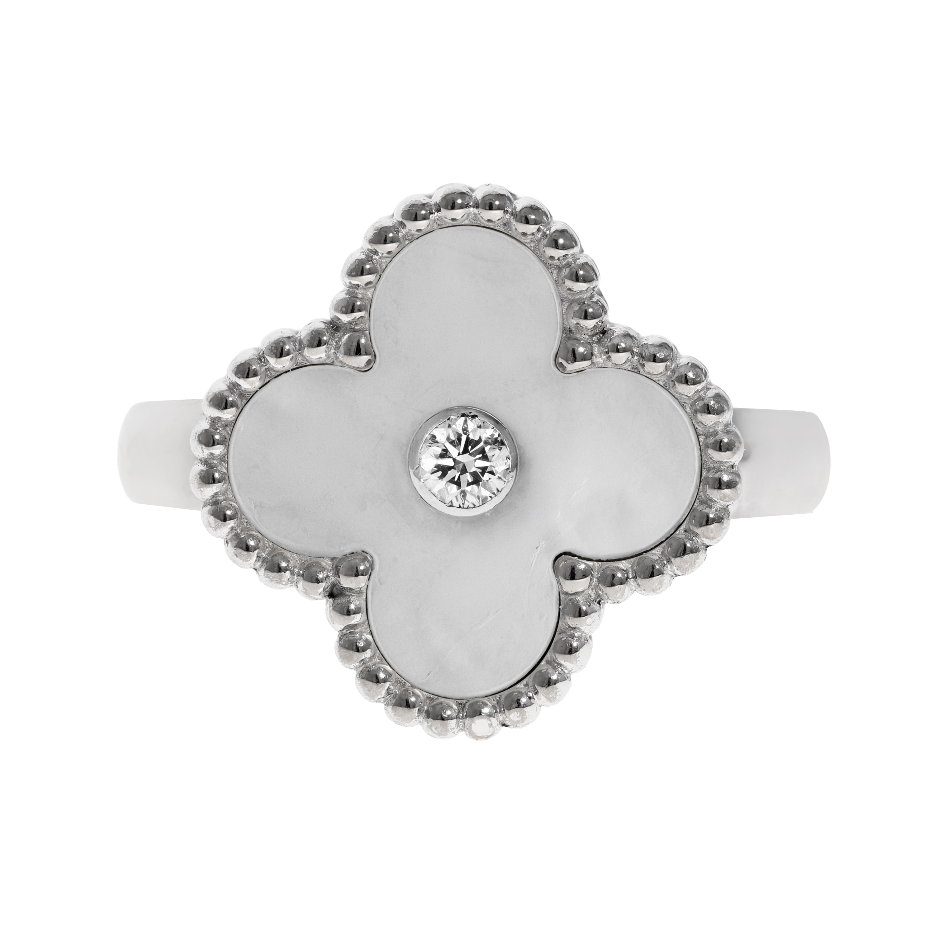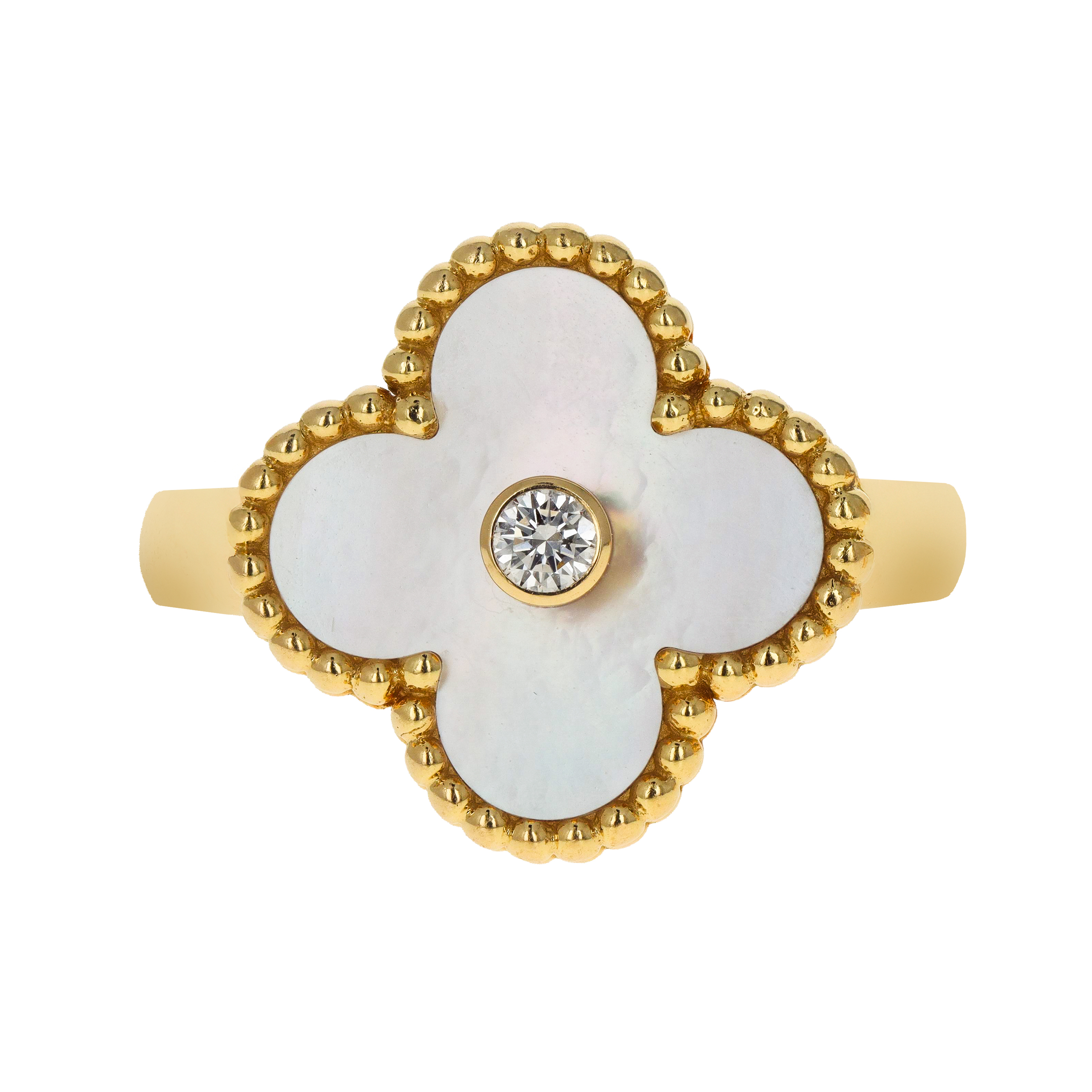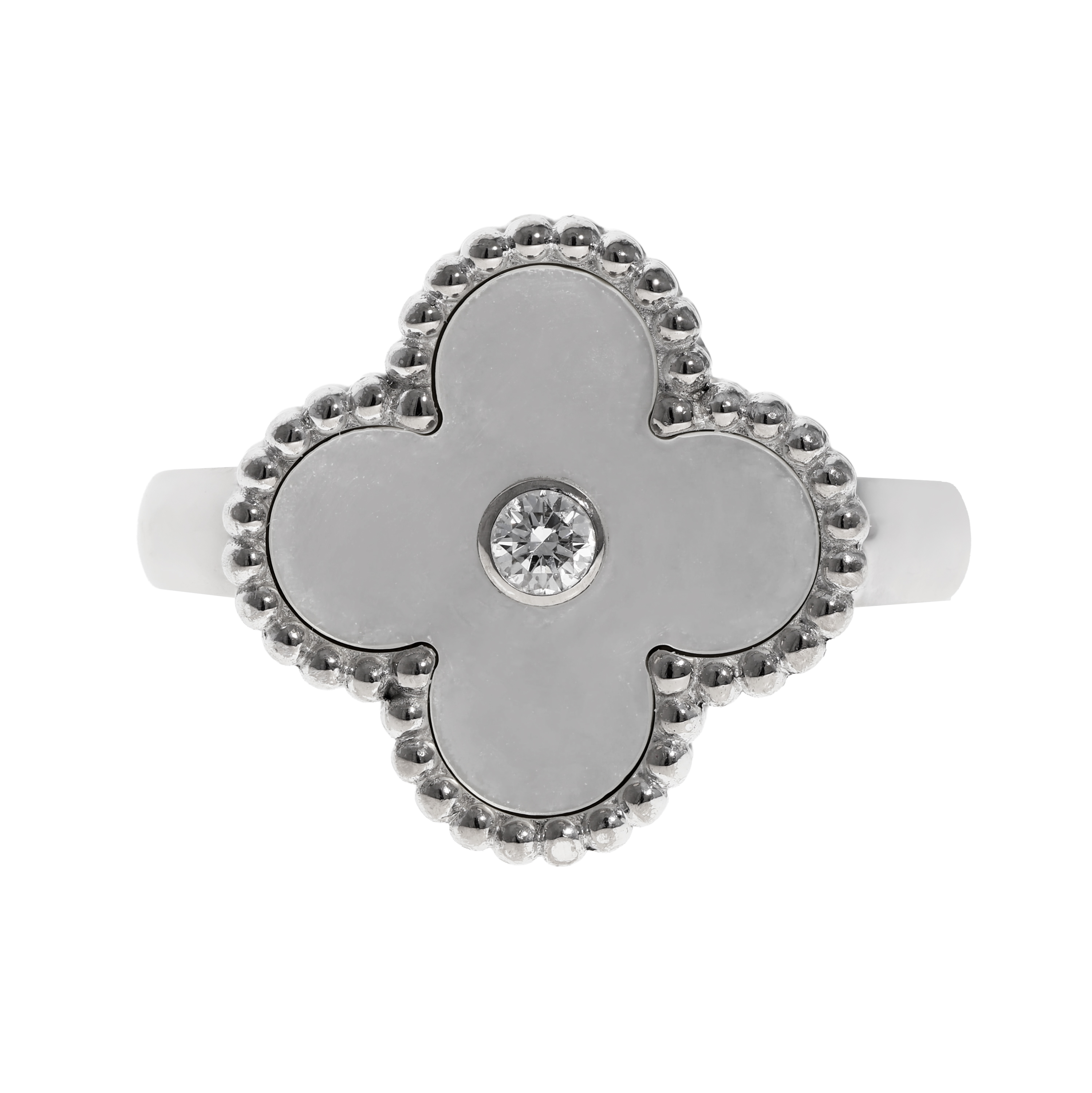 Inspired by the four-leaf clover, the Alhambra motif has become a signature across Van Cleef & Arpels jewelry. In ring form, this design takes the shape of centered or offset clovers in mother-of-pearl, malachite, onyx, carnelian, and turquoise, often framed in gold beading or diamonds. Alhambra rings can be worn alone or layered for an elegant, meaningful stack.
