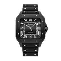 For a stealthier look, the Cartier Santos ADLC Black Coated Model delivers a matte black finish with a sporty edge, while maintaining the classic Santos silhouette. Medium models such as the Cartier Santos Medium Model measure a more versatile 35mm width, often preferred for smaller wrists or more traditional proportions.