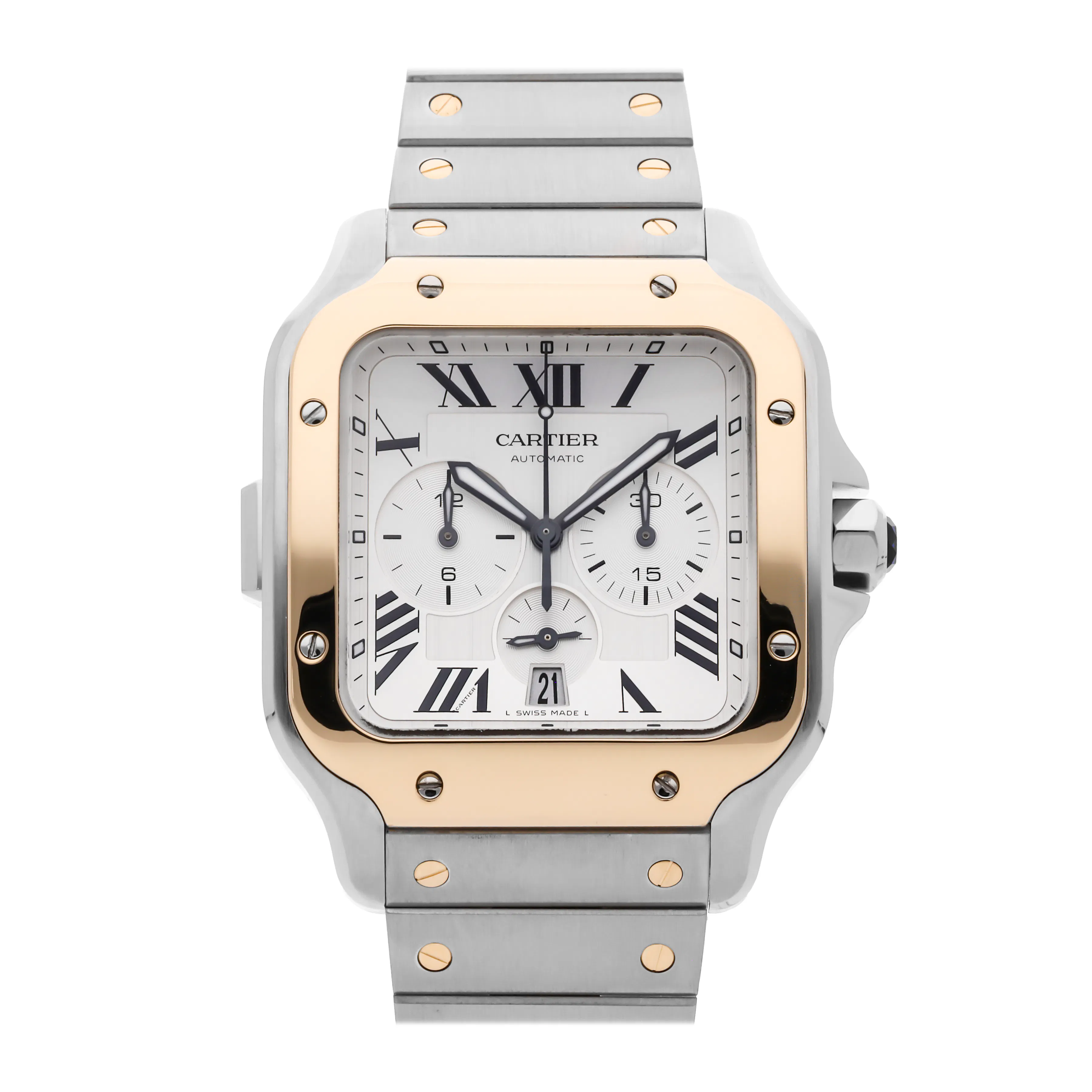 Over the years, the Santos collection has seen a range of complications including date displays, chronographs, and skeletonized movements. Most modern examples feature automatic calibers with exhibition casebacks, blending mechanical appeal with visual transparency. The range of metals — from stainless steel to gold and two-tone — allows collectors to choose a configuration that fits their wardrobe and lifestyle.
