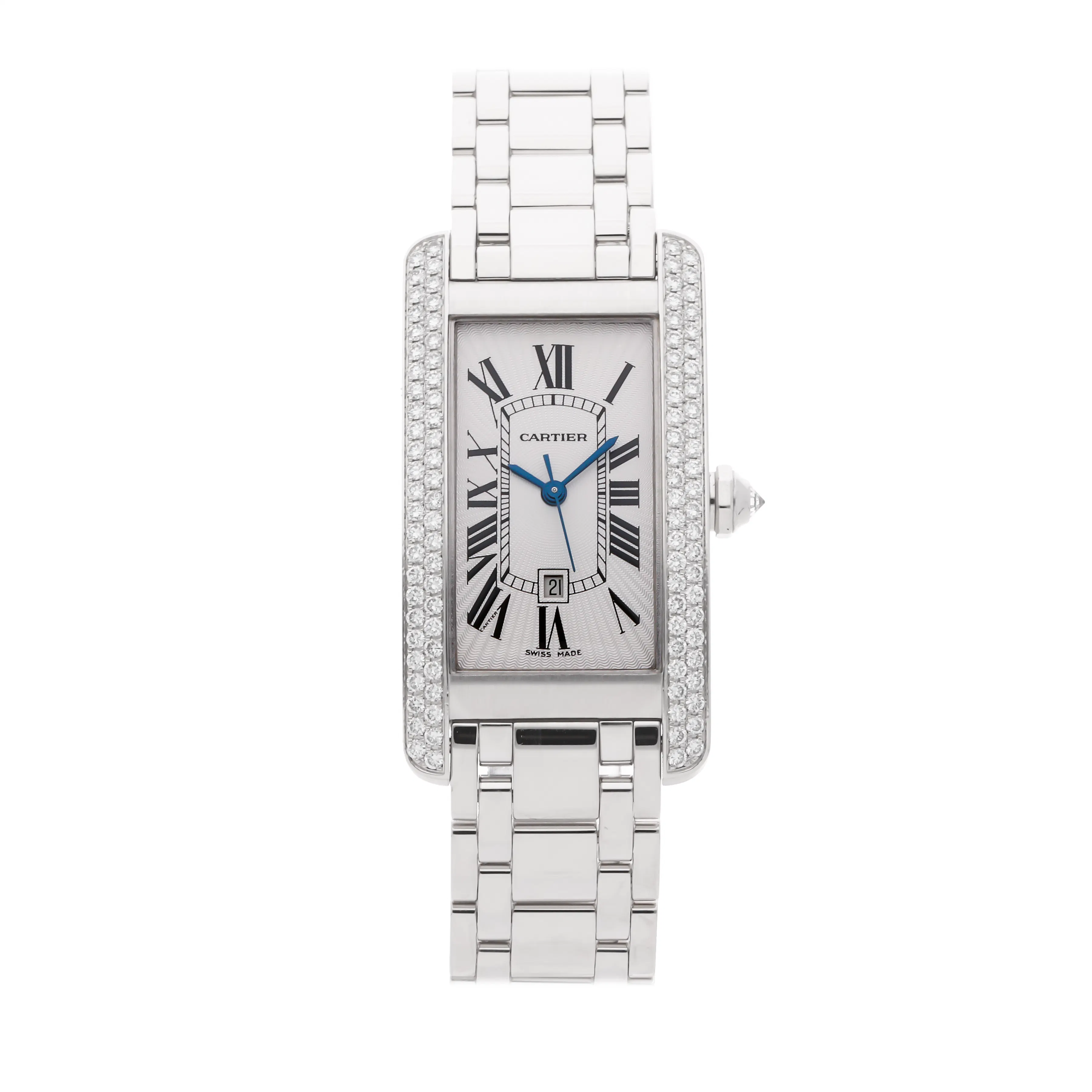 The Tank Américaine, introduced in 1989, elongates the proportions of the Tank Cintrée to create a sleek, curved profile that hugs the wrist. It offers a more modern presence while retaining Cartier's classic codes. Available in steel and precious metals, with both quartz and mechanical movements, the Tank Américaine is a favorite among collectors who prefer a slightly bolder rectangular case with elegant curvature.