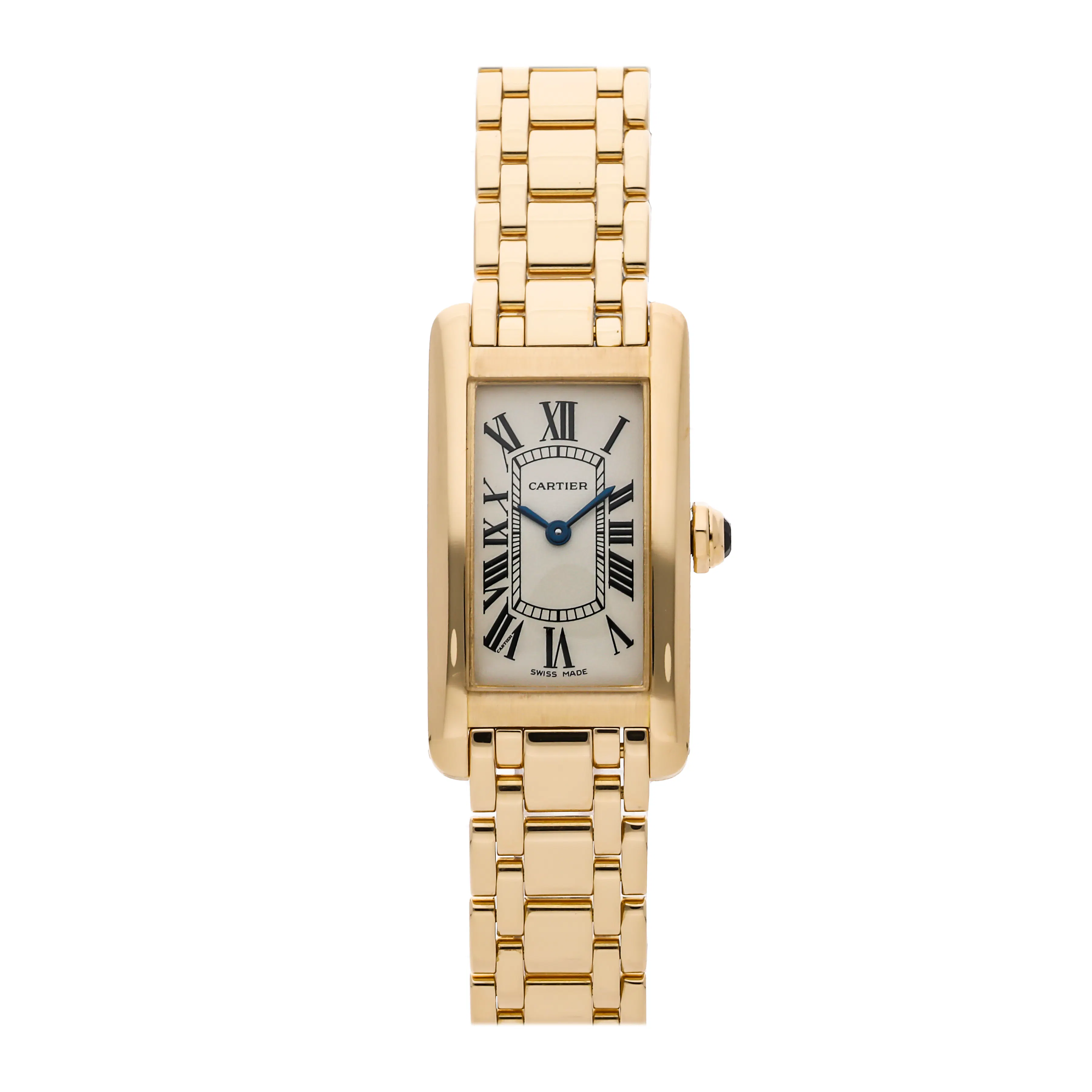 The Tank Américaine, introduced in 1989, elongates the proportions of the Tank Cintrée to create a sleek, curved profile that hugs the wrist. It offers a more modern presence while retaining Cartier's classic codes. Available in steel and precious metals, with both quartz and mechanical movements, the Tank Américaine is a favorite among collectors who prefer a slightly bolder rectangular case with elegant curvature.
