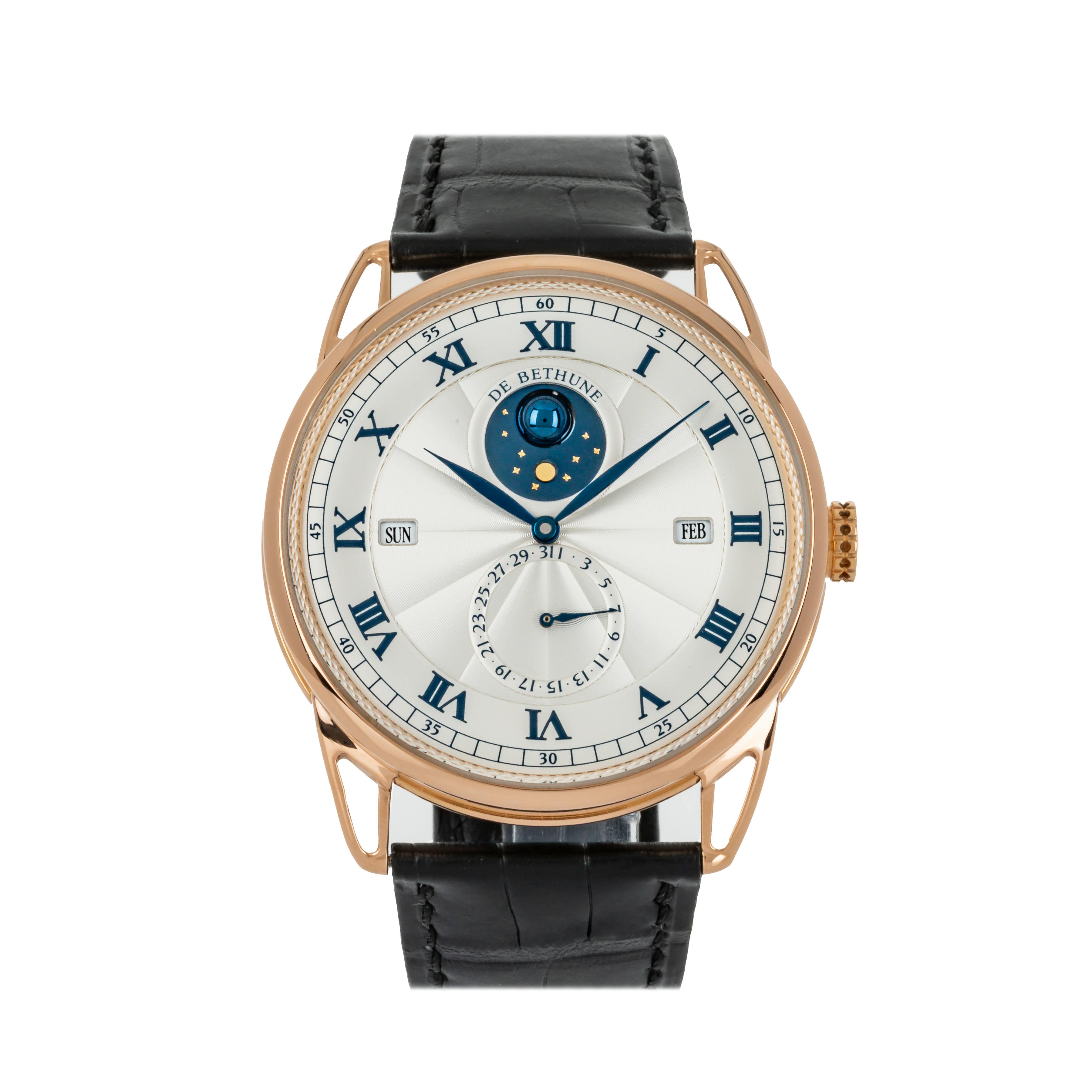 Reference DB25QP offers one of the most refined perpetual calendar layouts in independent watchmaking. Day, date, month, and leap year indications are spread cleanly across the dial, combining traditional calendar logic with De Bethune's aesthetic precision and technical prowess.