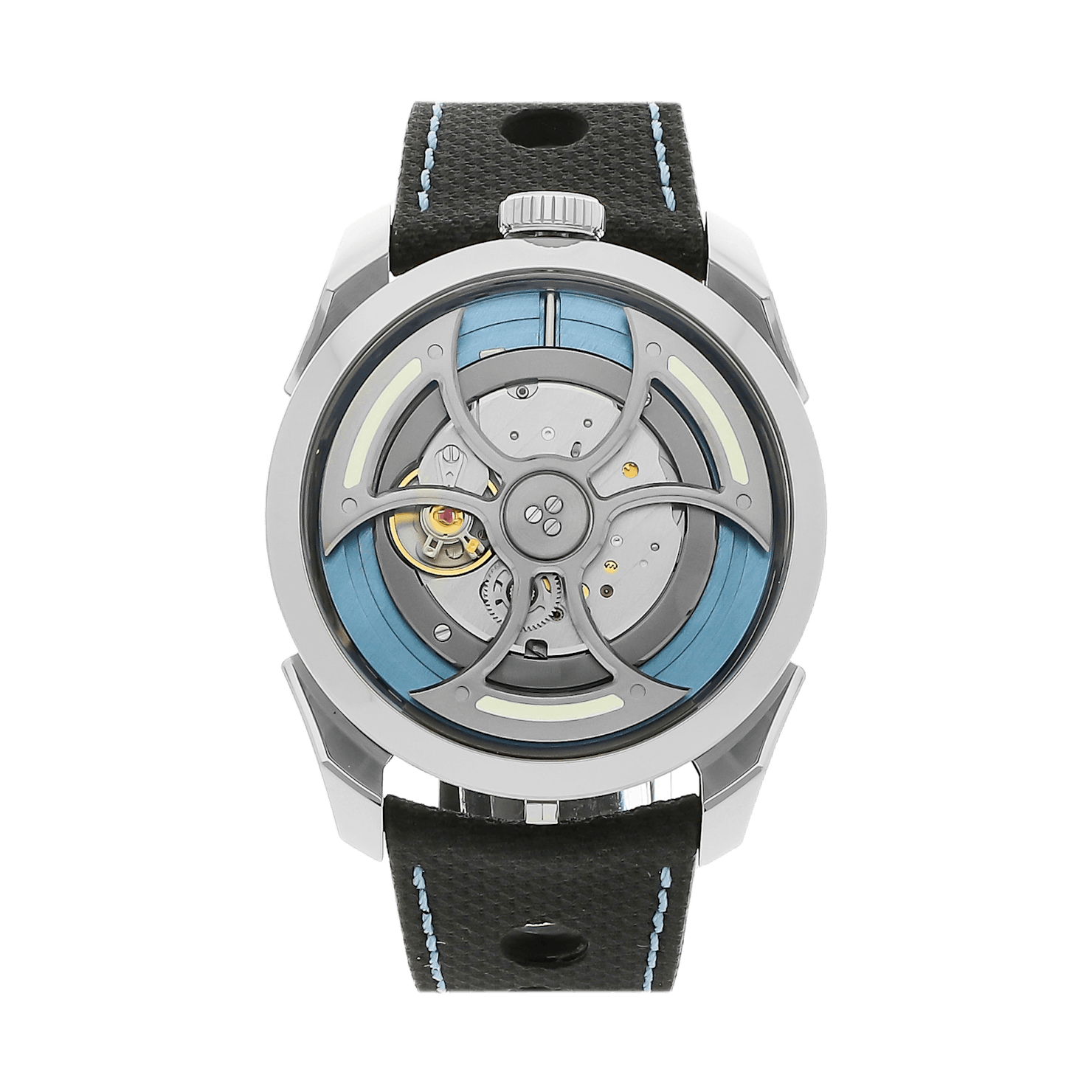 Several colorways have been introduced since the debut of the original M.A.D.1. These include the red-accented M.A.D.1 Red, the electric blue-accented M.A.D.1 Blue, and the stealthy M.A.D.1 Green — each version carrying subtle changes in execution but remaining true to the line's mechanical DNA. Cases are large and sculptural, typically constructed from stainless steel or lightweight alloys, and powered by modified Miyota automatic movements inverted to display the rotor on the dial side.