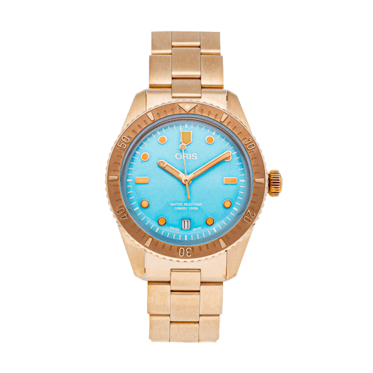 Pre-Owned Oris Divers Sixty-Five 'Cotton Candy' (01733777131550781915) self - winding automatic watch, features a 38mm bronze case surrounding a sky blue dial on a bronze bracelet complete with a folding buckle. Functions include hours, minutes, seconds and date. This watch comes complete with the original box and papers. Majority of time remaining on the factory warranty!