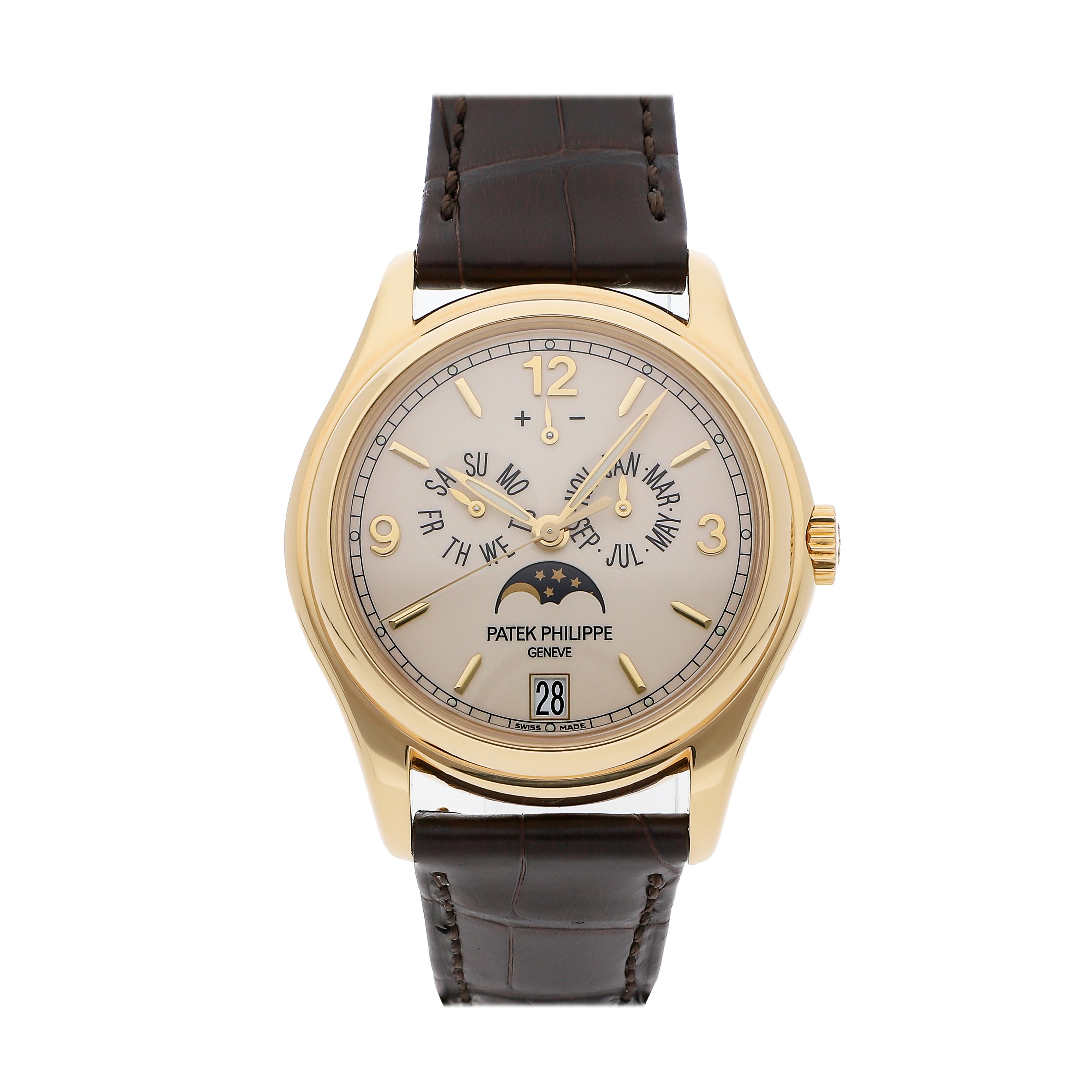 The annual calendar is one of Patek Philippe's most celebrated innovations. The 5396G offers day, date, and month through elegant apertures, accompanied by a moonphase display. With its clean dial and balanced layout, this reference reflects Patek Philippe's mastery of practical complication design.