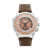 The 5930P features a world time display combined with a flyback chronograph, all housed in a platinum case with a green dial. It's one of the most versatile and complex models in the Complications family — designed with the frequent traveler in mind.