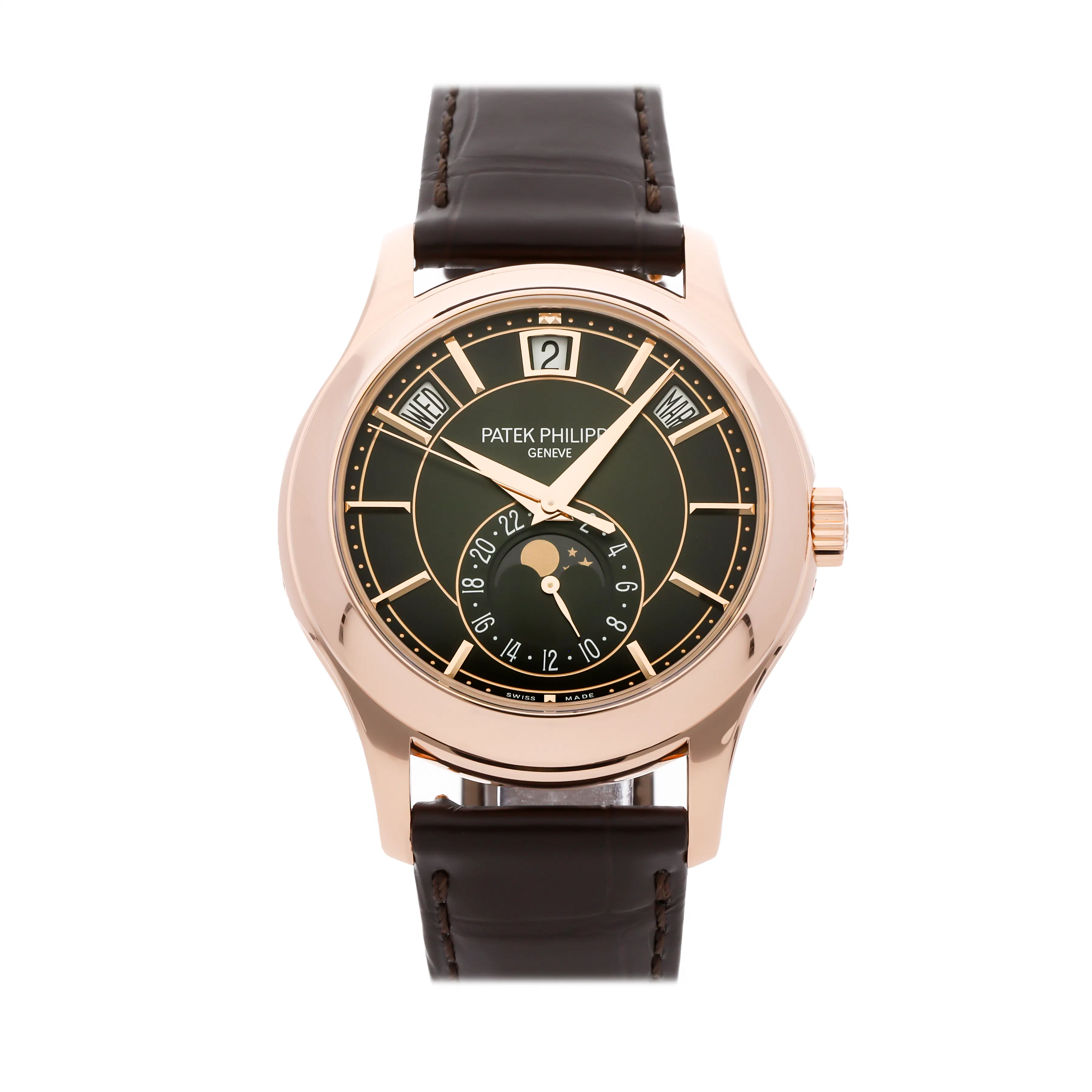 The annual calendar is one of Patek Philippe's most celebrated innovations. The 5396G offers day, date, and month through elegant apertures, accompanied by a moonphase display. With its clean dial and balanced layout, this reference reflects Patek Philippe's mastery of practical complication design.