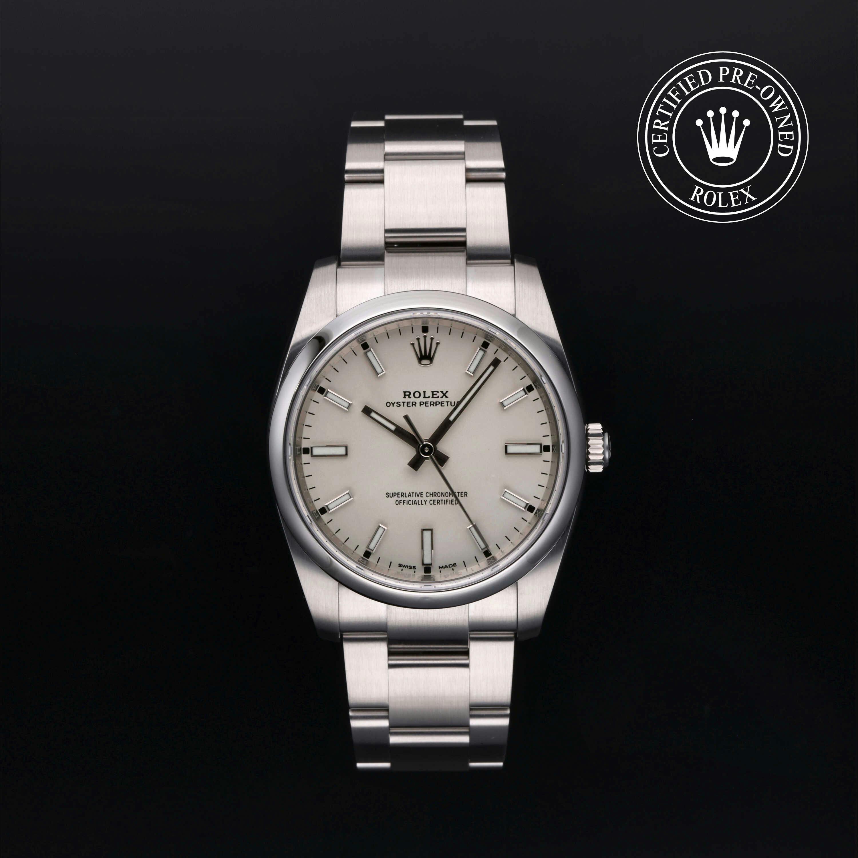 Rolex Certified Pre-Owned Oyster Perpetual (114200) self - winding automatic watch, features a 34mm stainless steel case and domed bezel surrounding a white dial on a stainless steel oyster bracelet. Functions include hours, minutes and seconds. This watch has received Rolex-authorized service and certification. It comes with the original box and papers, and includes a custom Rolex Certified Pre-Owned hang tag, travel pouch and RCPO international warranty card.