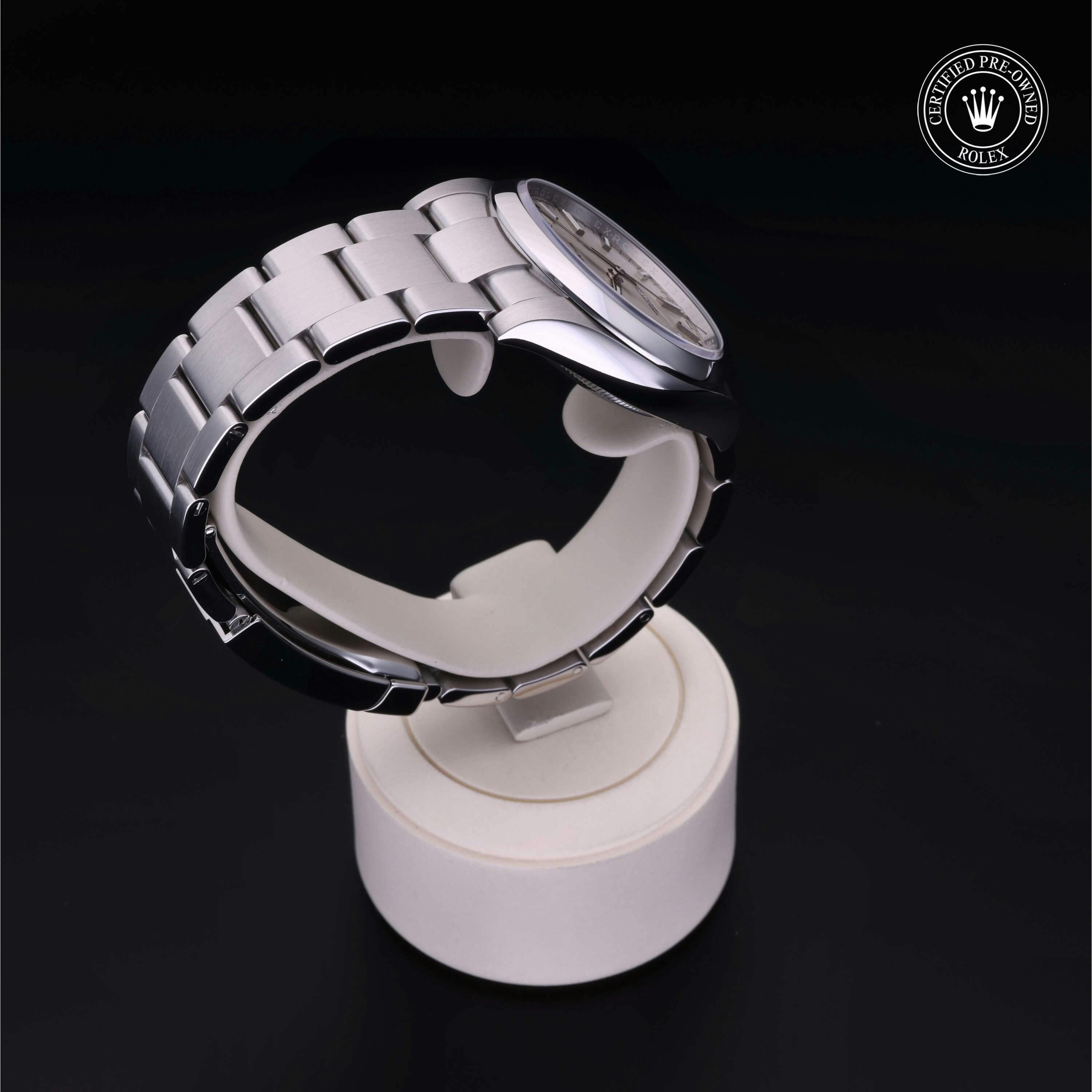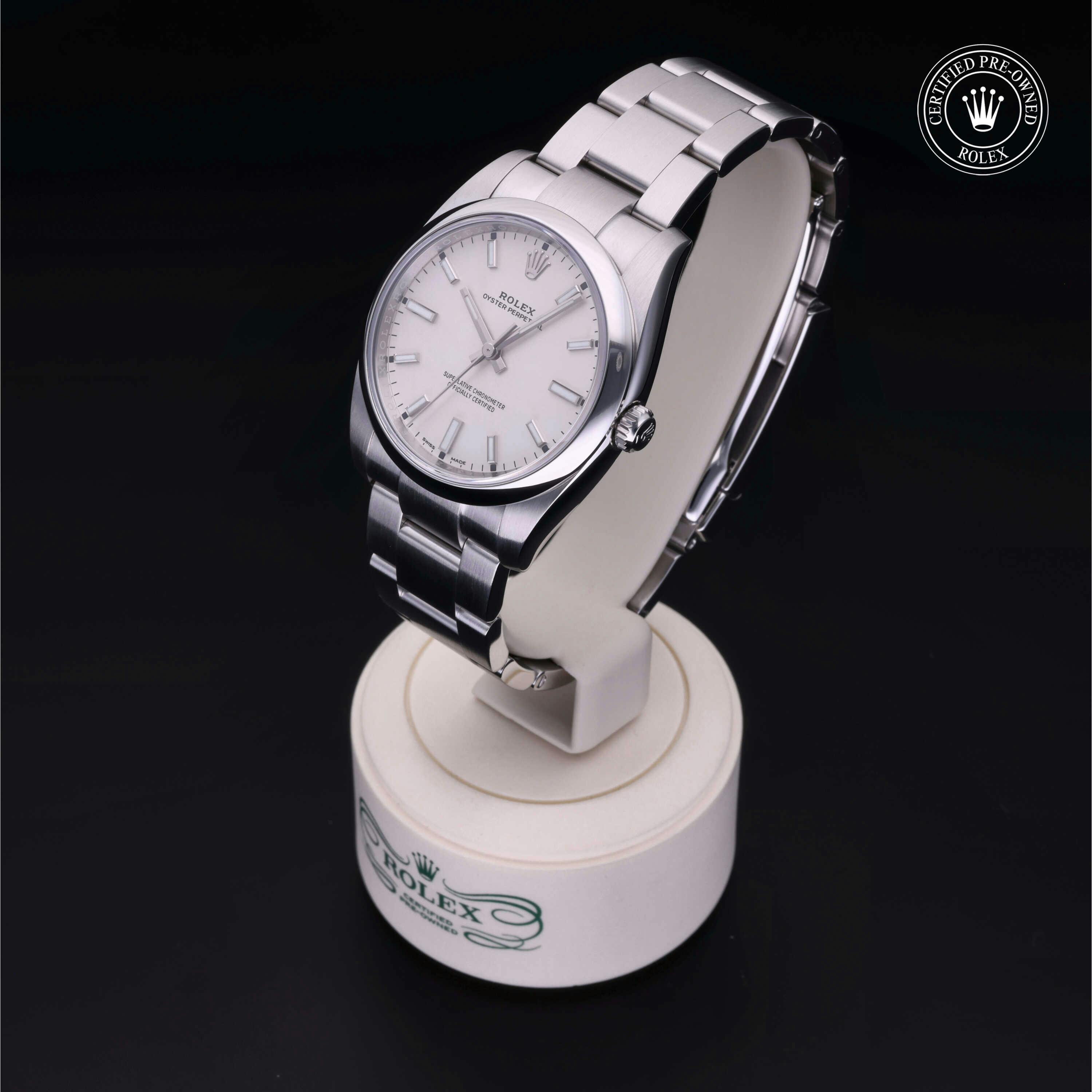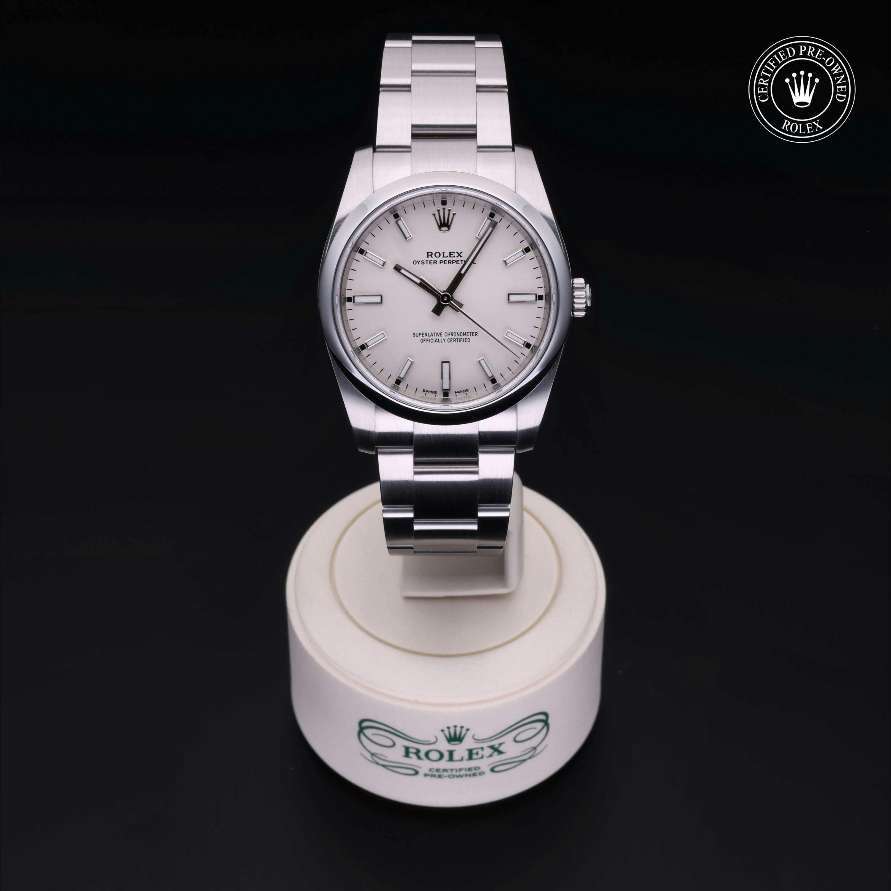 Rolex Certified Pre-Owned Oyster Perpetual (114200) self - winding automatic watch, features a 34mm stainless steel case and domed bezel surrounding a white dial on a stainless steel oyster bracelet. Functions include hours, minutes and seconds. This watch has received Rolex-authorized service and certification. It comes with the original box and papers, and includes a custom Rolex Certified Pre-Owned hang tag, travel pouch and RCPO international warranty card.