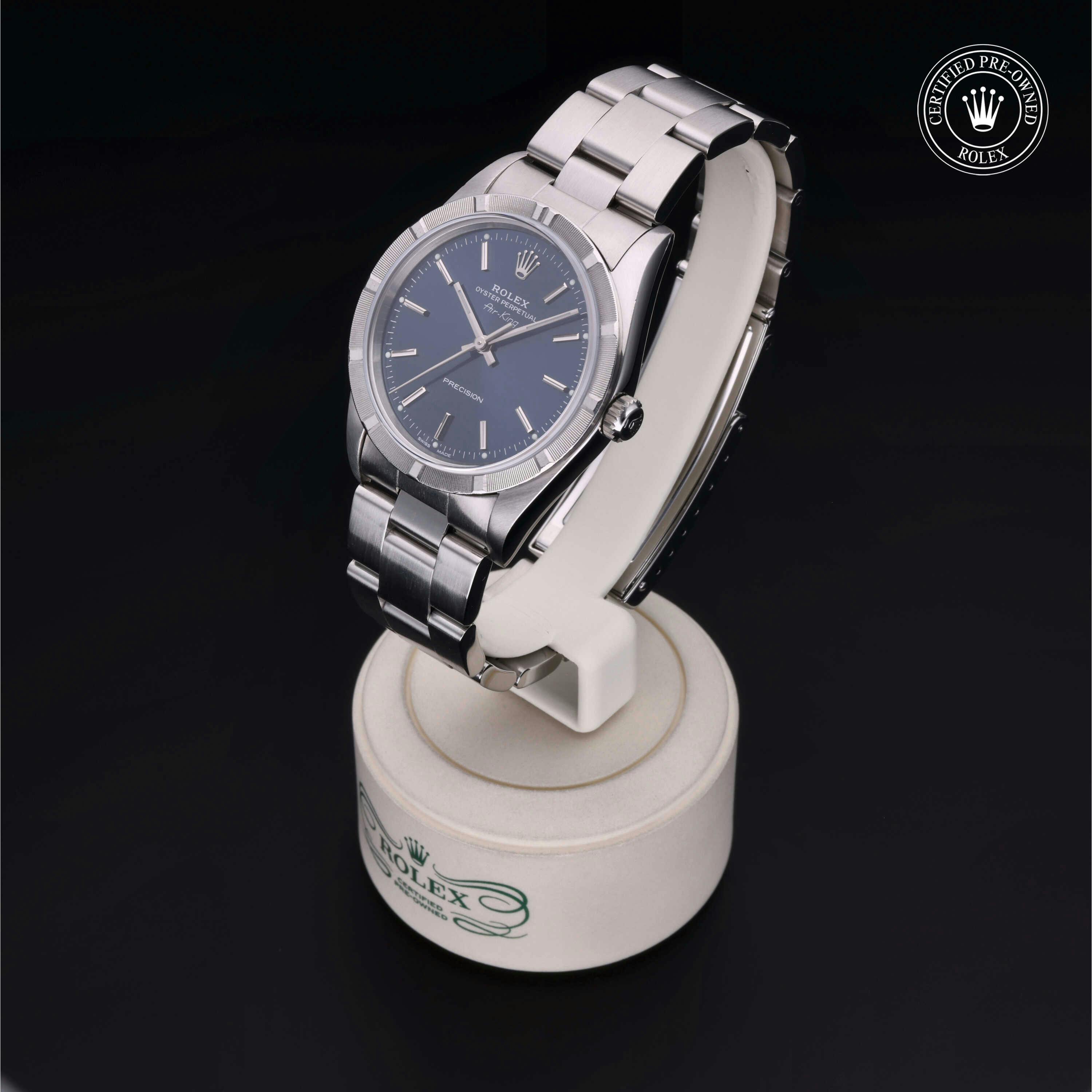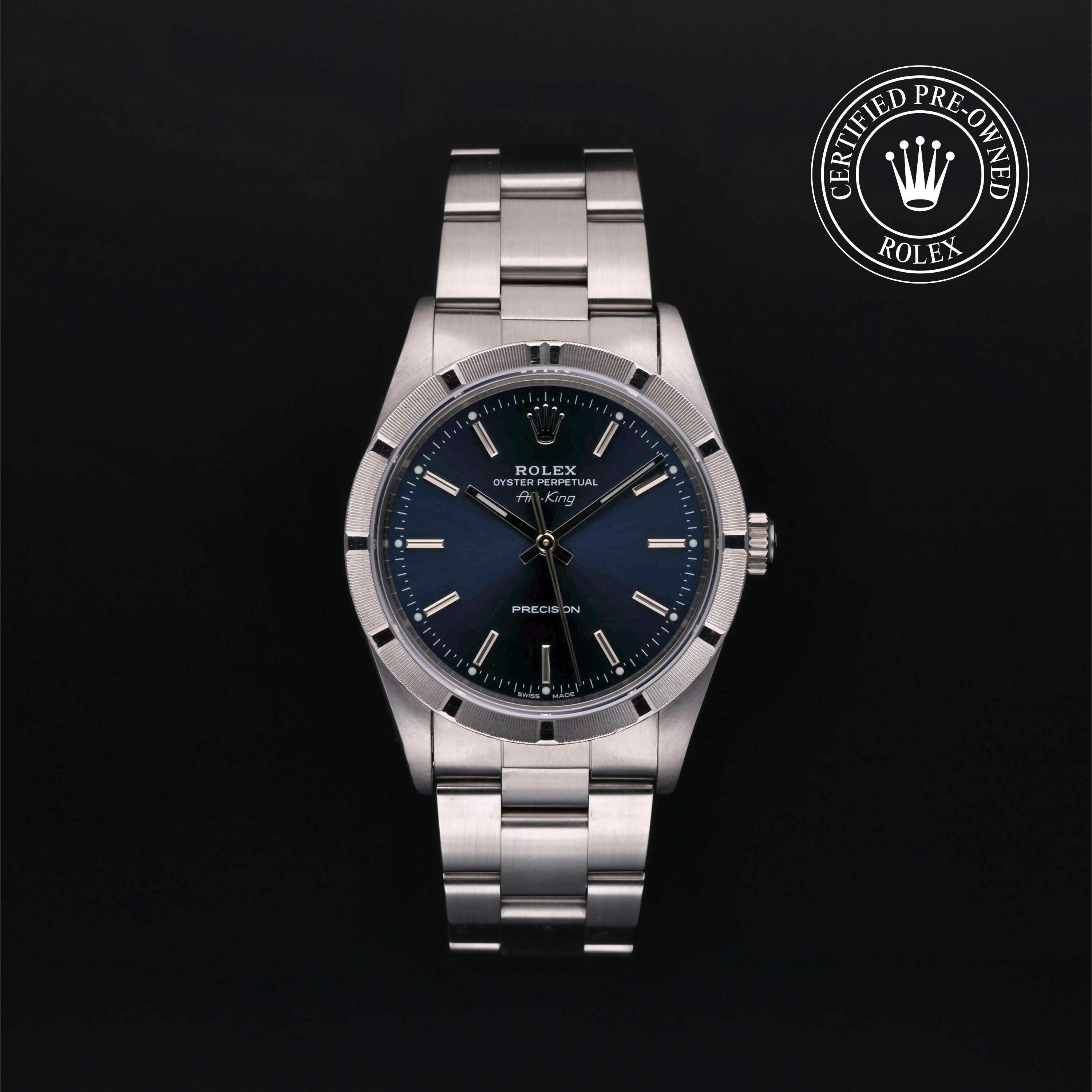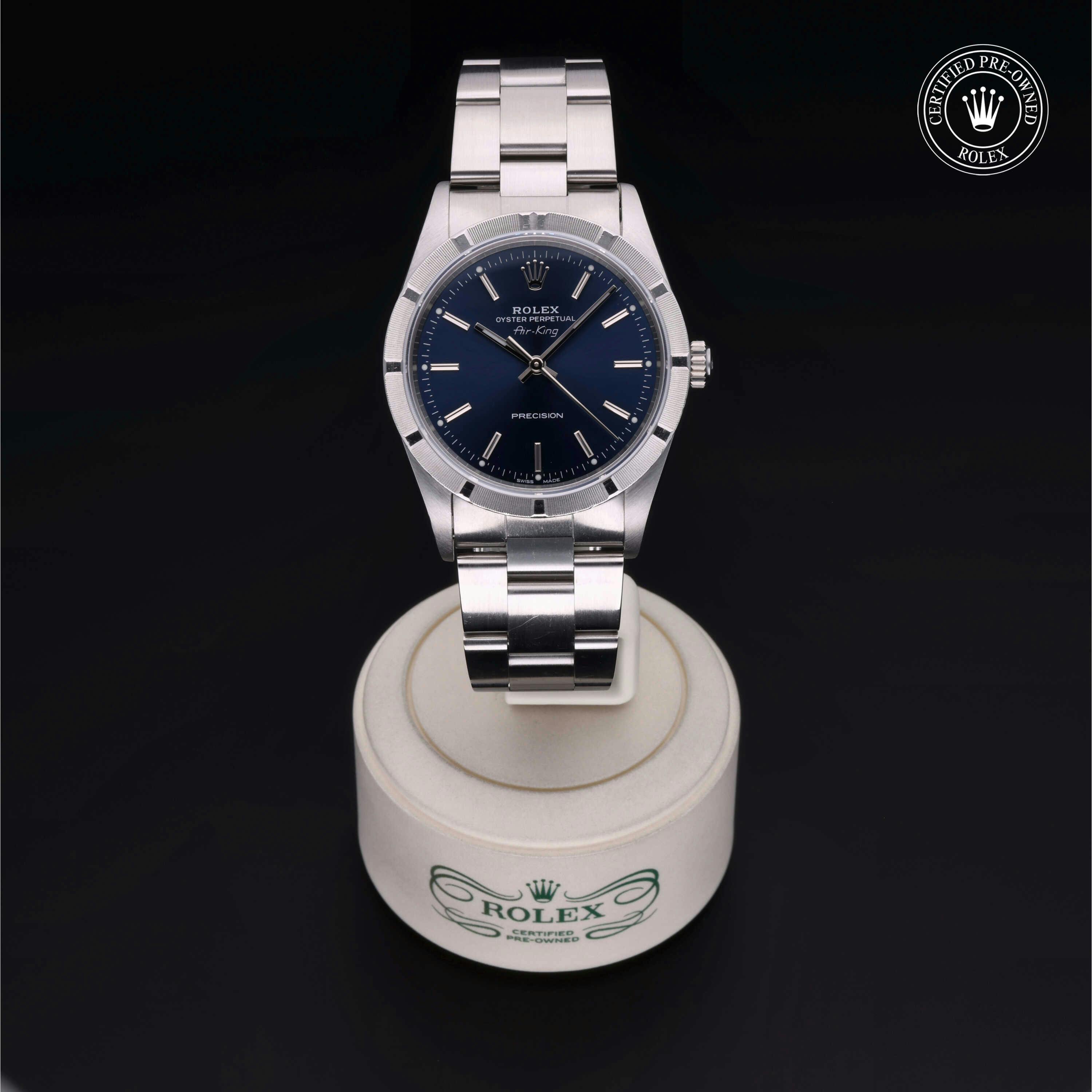 Rolex Certified Pre-Owned Air-King Precision (14010M) self - winding automatic watch, features a 34mm stainless steel case and engine-turned bezel surrounding a blue dial on a stainless steel oyster bracelet. Functions include hours, minutes and seconds. This watch has received Rolex-authorized service and certification. It does not come with the original box or papers, but includes a custom Rolex Certified Pre-Owned hang tag, travel pouch and RCPO international warranty card.
