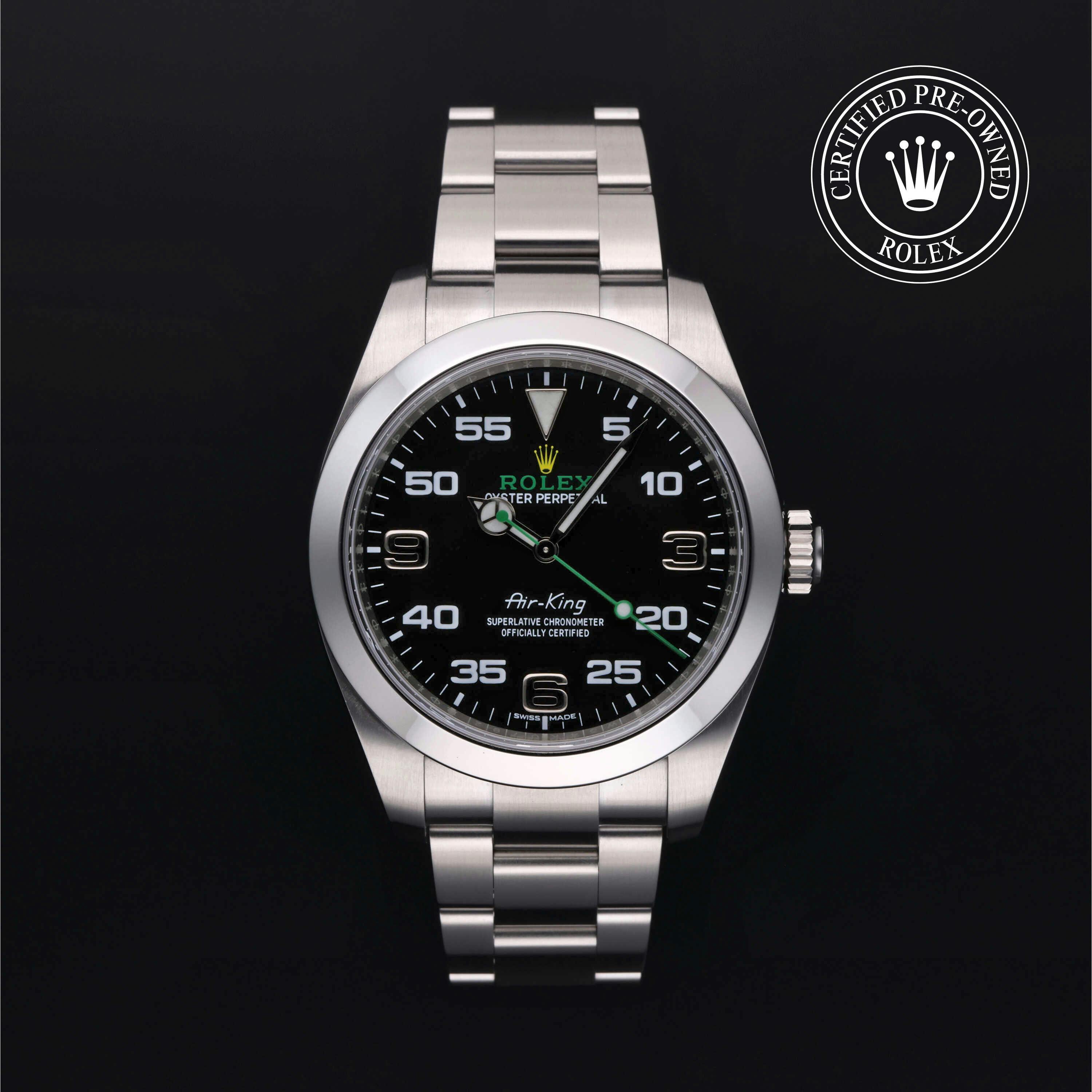 Rolex Certified Pre-Owned Air-King (116900) self - winding automatic watch, features a 40mm stainless steel case and smooth bezel surrounding a black dial on a stainless steel oyster bracelet. Functions include hours, minutes and seconds. This watch has received Rolex-authorized service and certification. It comes with the original box and papers, and includes a custom Rolex Certified Pre-Owned hang tag, travel pouch and RCPO international warranty card.