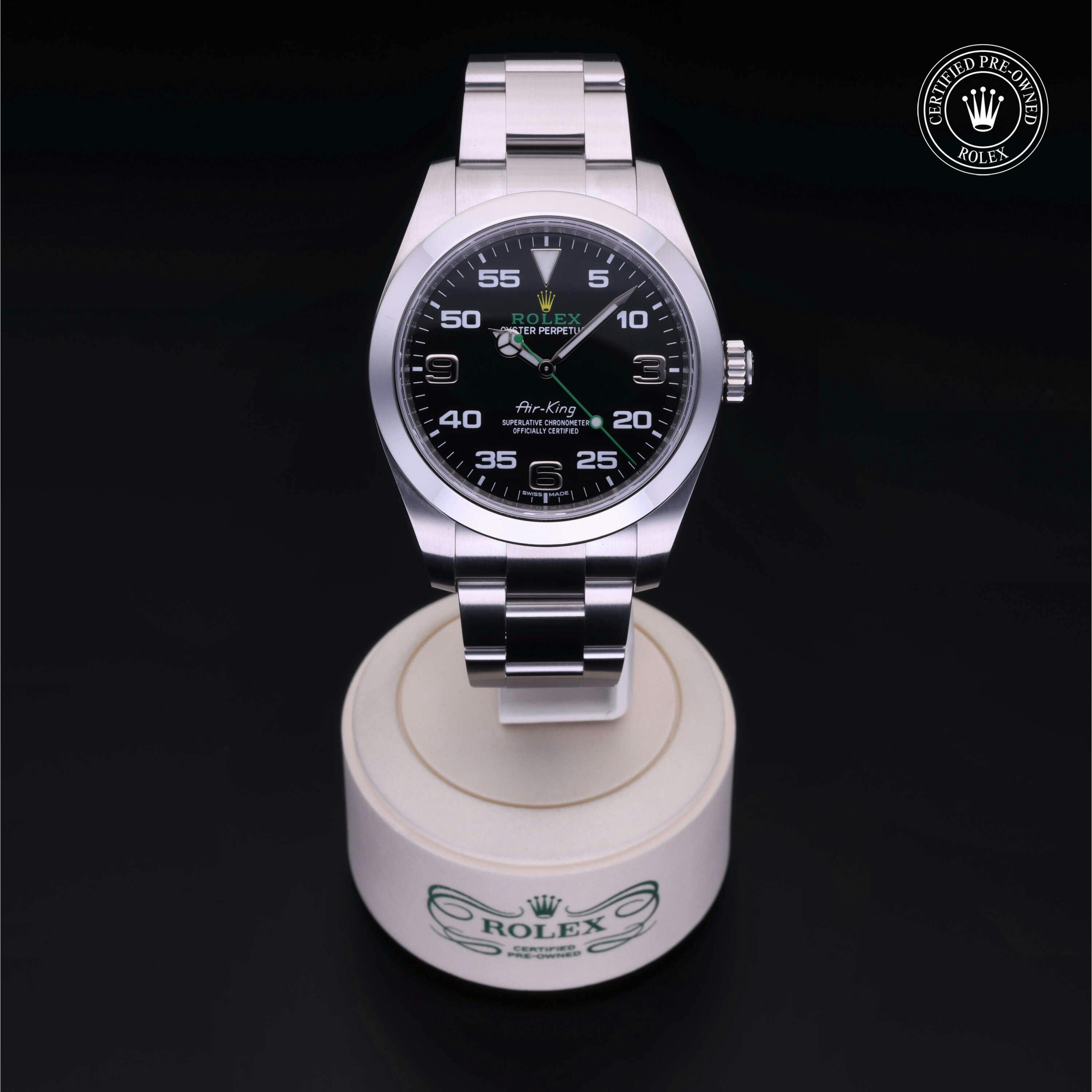 Rolex Certified Pre-Owned Air-King (116900) self - winding automatic watch, features a 40mm stainless steel case and smooth bezel surrounding a black dial on a stainless steel oyster bracelet. Functions include hours, minutes and seconds. This watch has received Rolex-authorized service and certification. It comes with the original box and papers, and includes a custom Rolex Certified Pre-Owned hang tag, travel pouch and RCPO international warranty card.