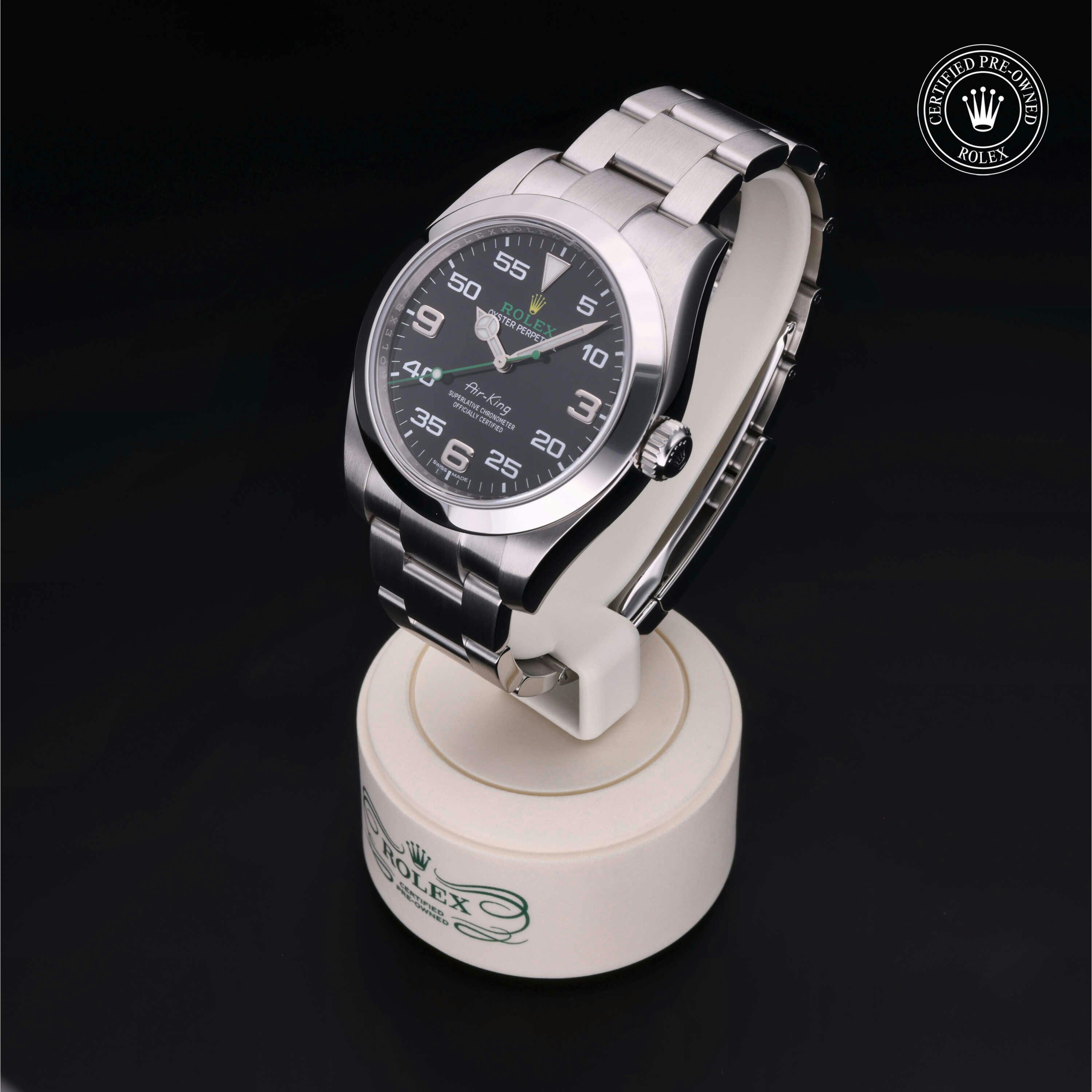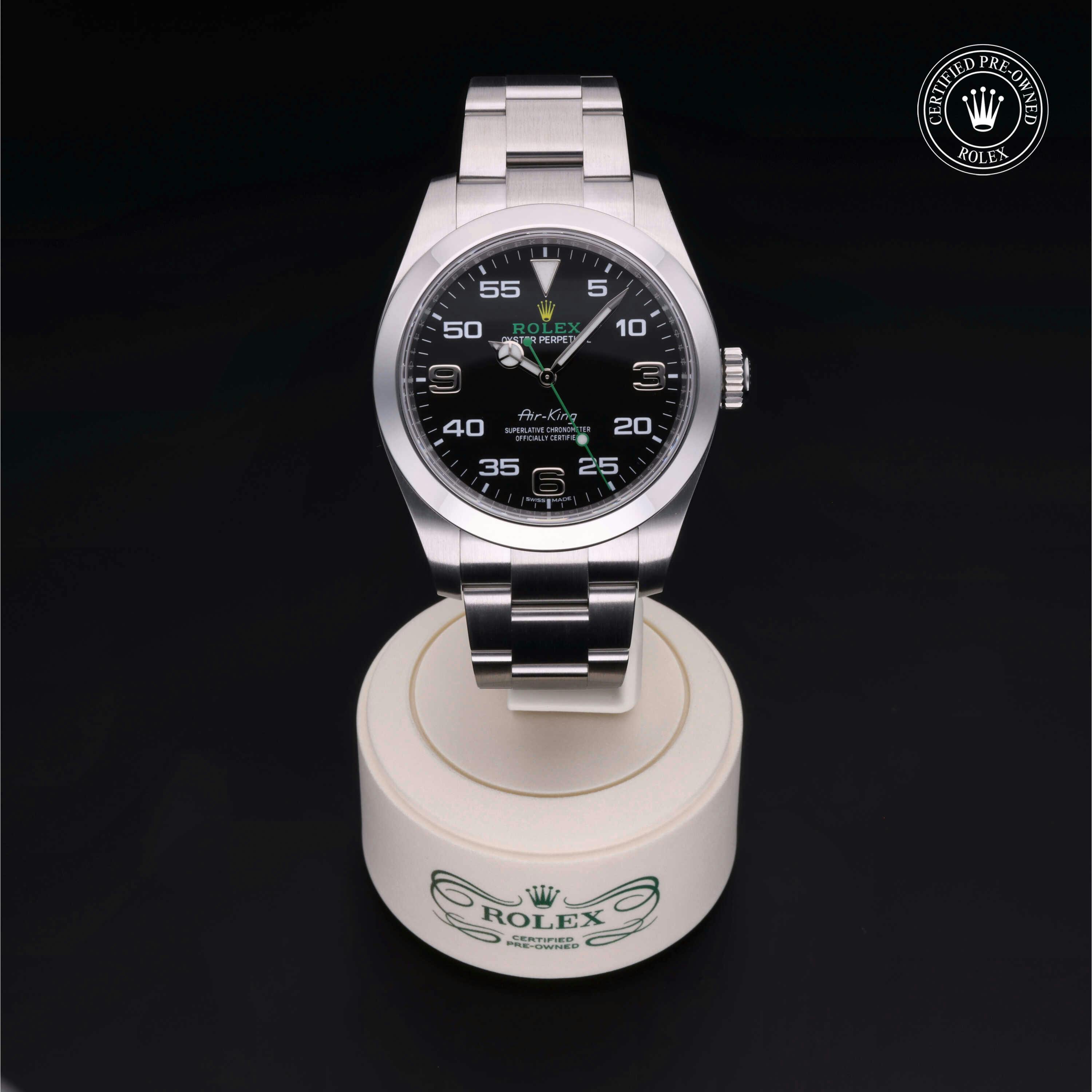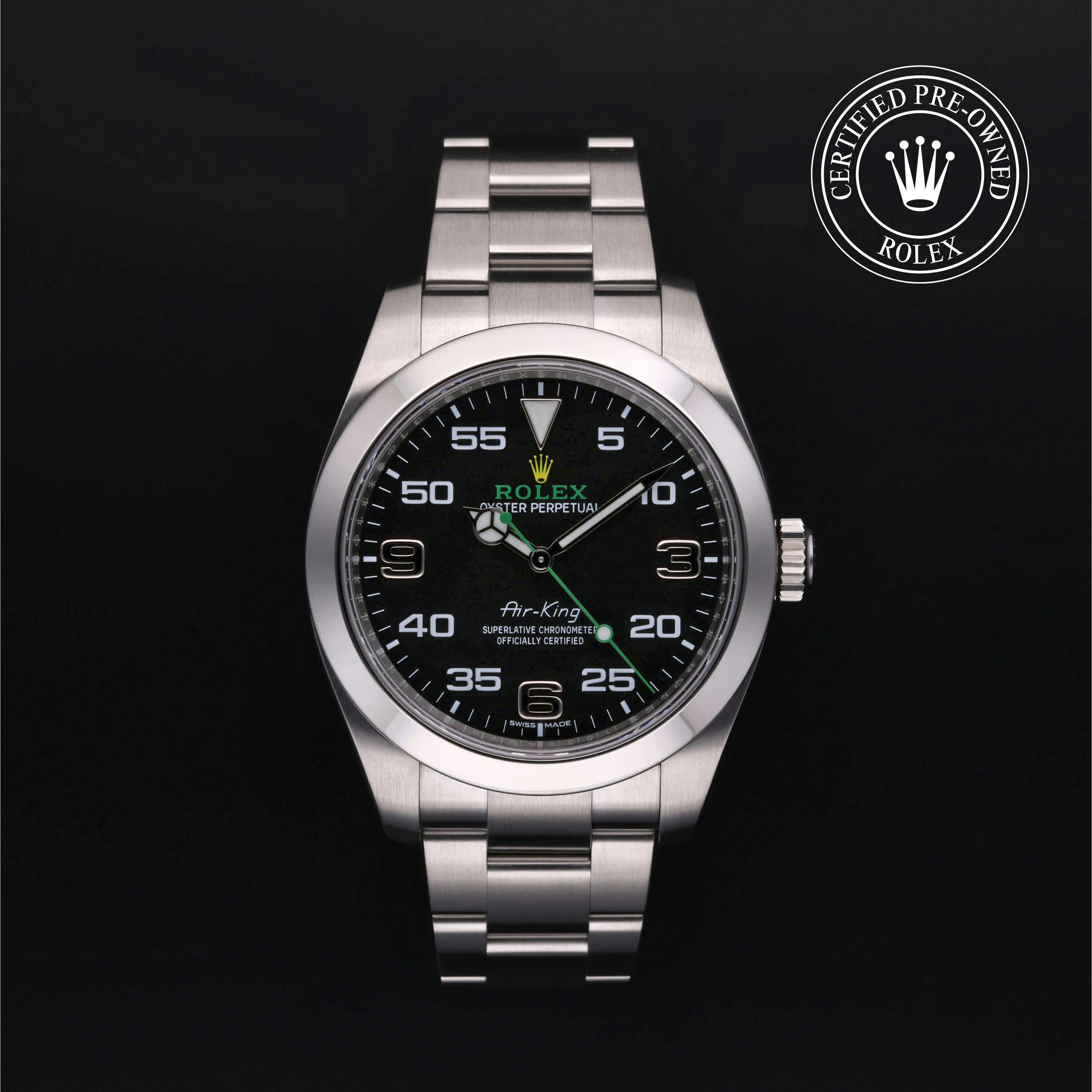 Rolex Certified Pre-Owned Air-King (116900) self - winding automatic watch, features a 40mm stainless steel case and smooth bezel surrounding a black dial on a stainless steel oyster bracelet. Functions include hours, minutes and seconds. This watch has received Rolex-authorized service and certification. It comes with the original papers, and includes a custom Rolex Certified Pre-Owned hang tag, travel pouch and RCPO international warranty card.