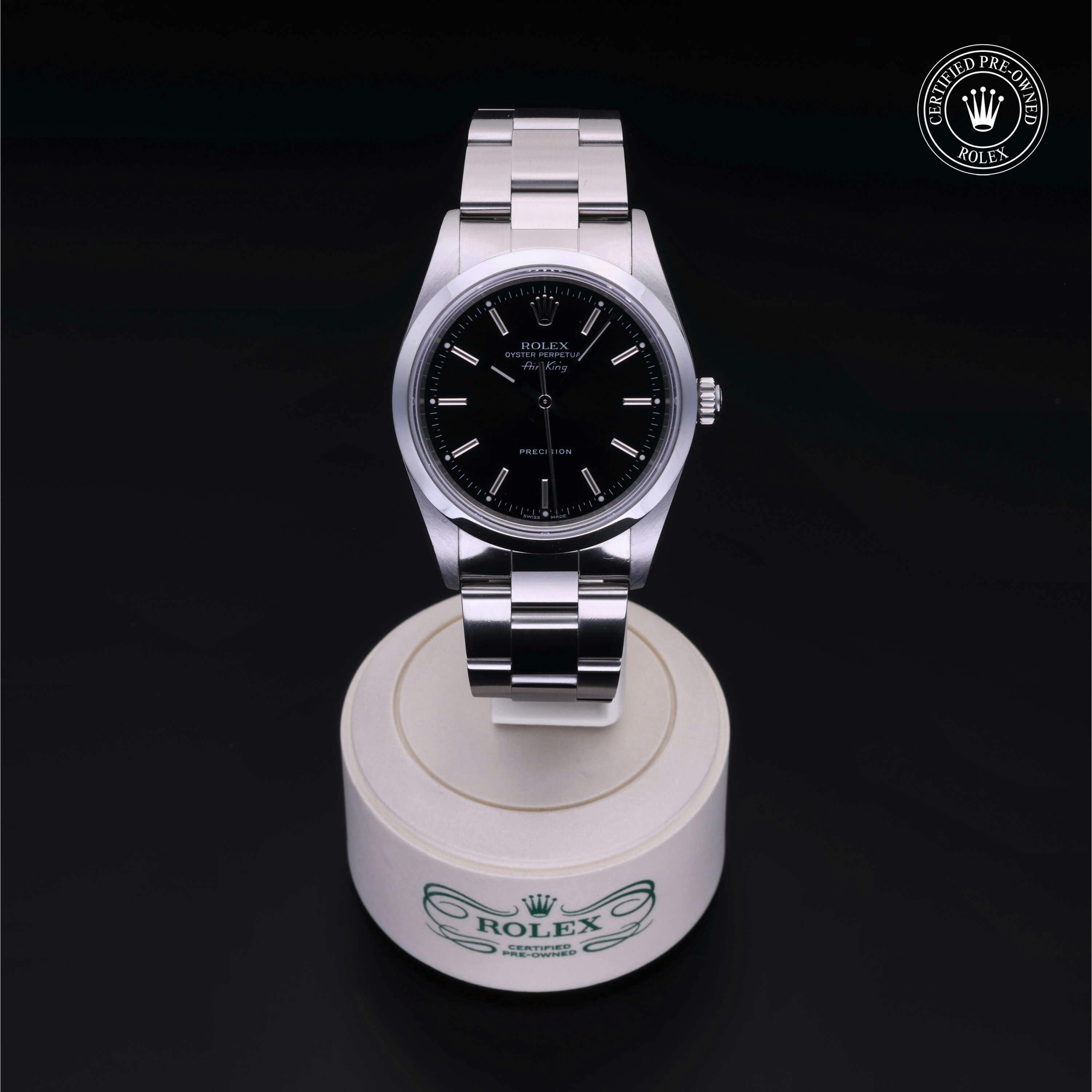 Rolex Certified Pre-Owned Air-King (14000) self - winding automatic watch, features a 34mm stainless steel case and smooth bezel surrounding a black dial on a stainless steel oyster bracelet. Functions include hours, minutes and seconds. This watch has received Rolex-authorized service and certification. It does not come with the original box or papers, but includes a custom Rolex Certified Pre-Owned hang tag, travel pouch and RCPO international warranty card.