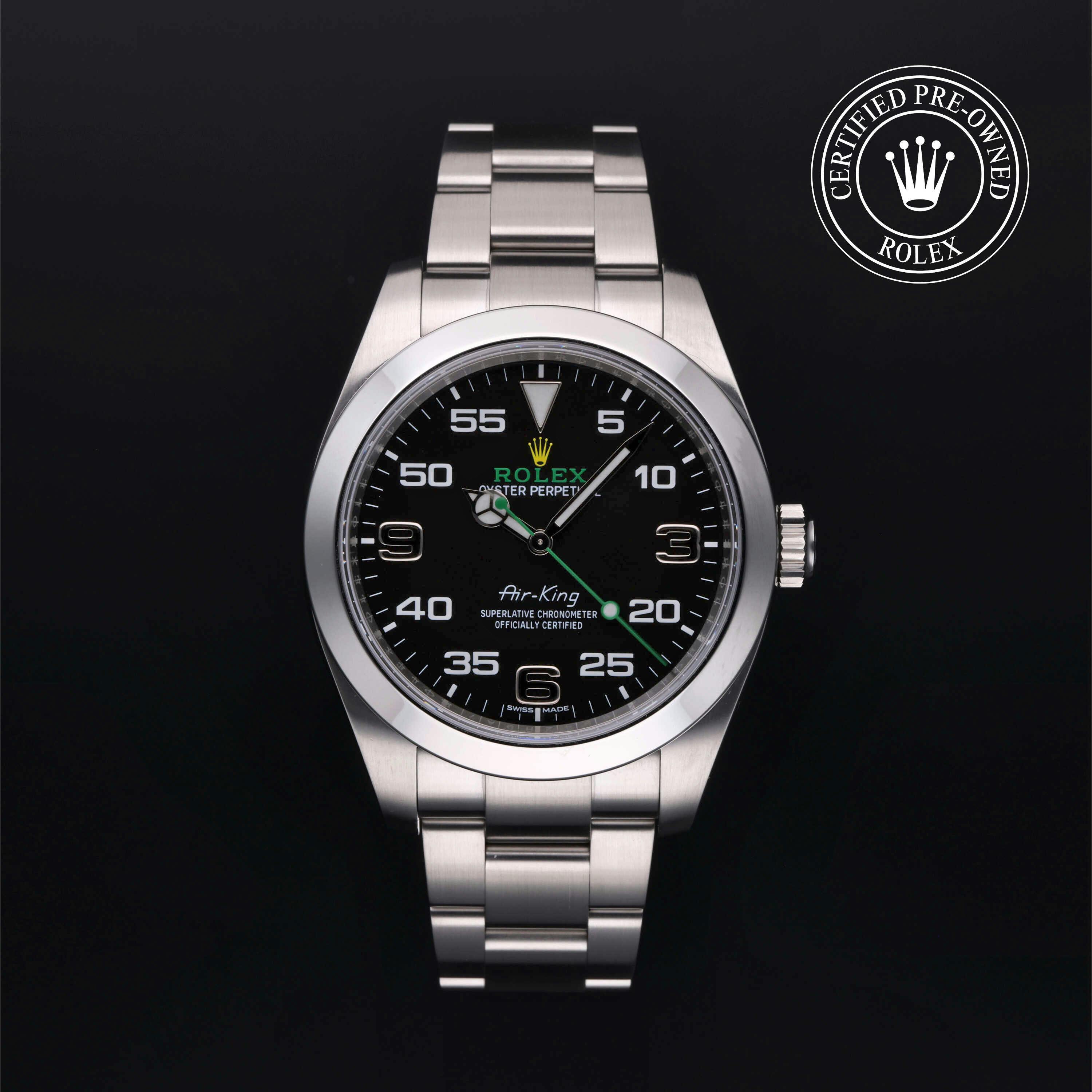 Rolex Certified Pre-Owned Air-King (116900) self - winding automatic watch, features a 40mm stainless steel case and smooth bezel surrounding a black dial on a stainless steel oyster bracelet. Functions include hours, minutes and seconds. This watch has received Rolex-authorized service and certification. It does not come with the original box or papers, but includes a custom Rolex Certified Pre-Owned hang tag, travel pouch and RCPO international warranty card.