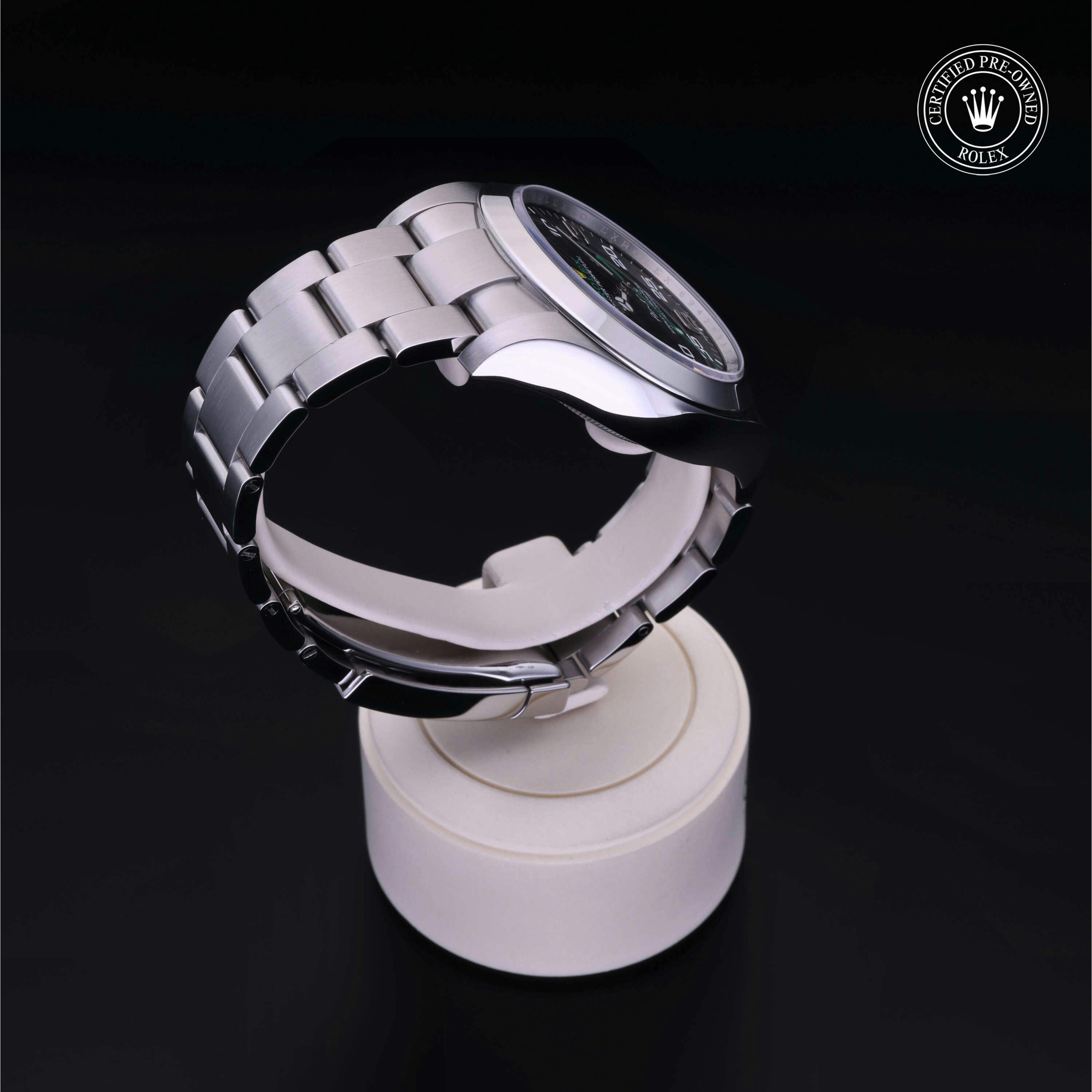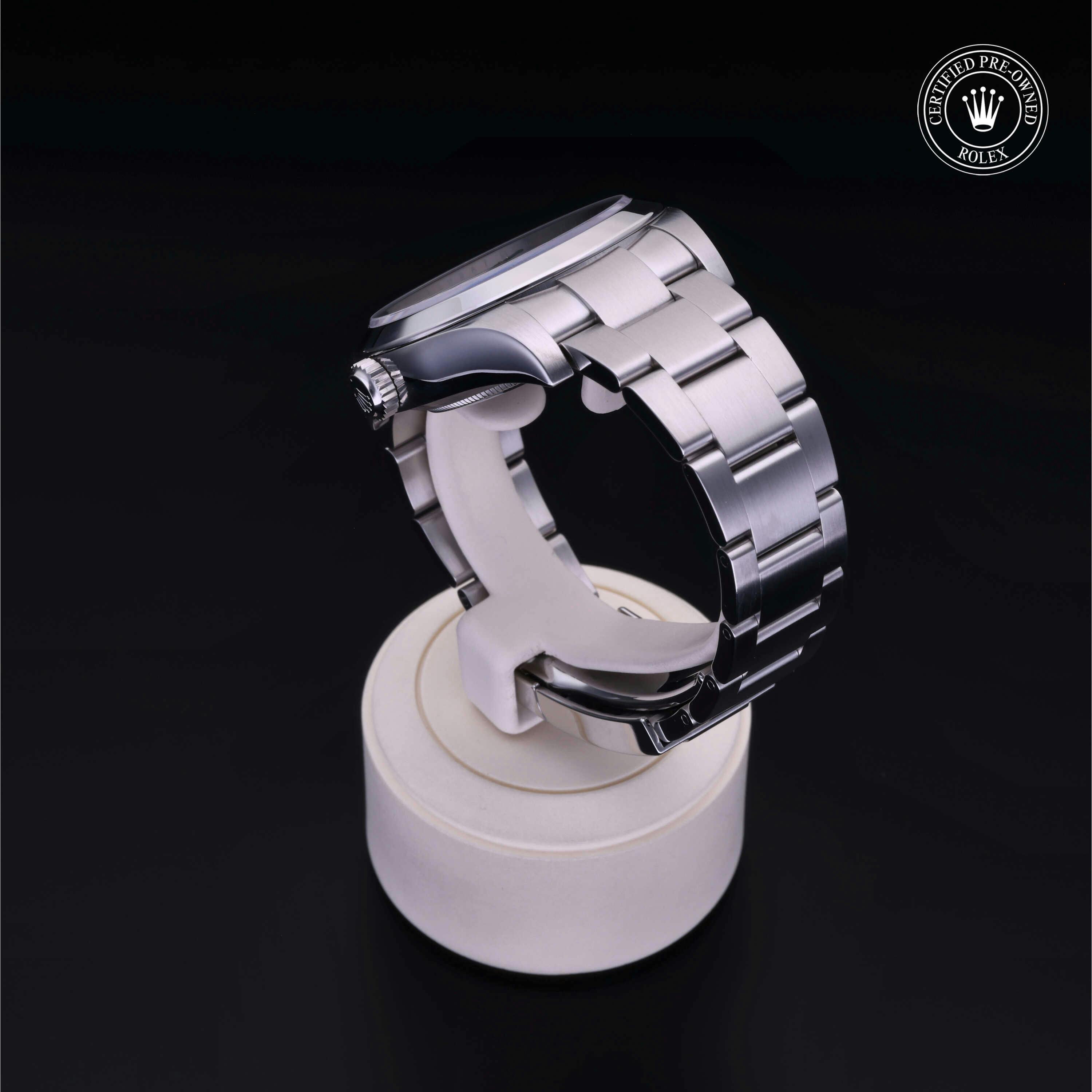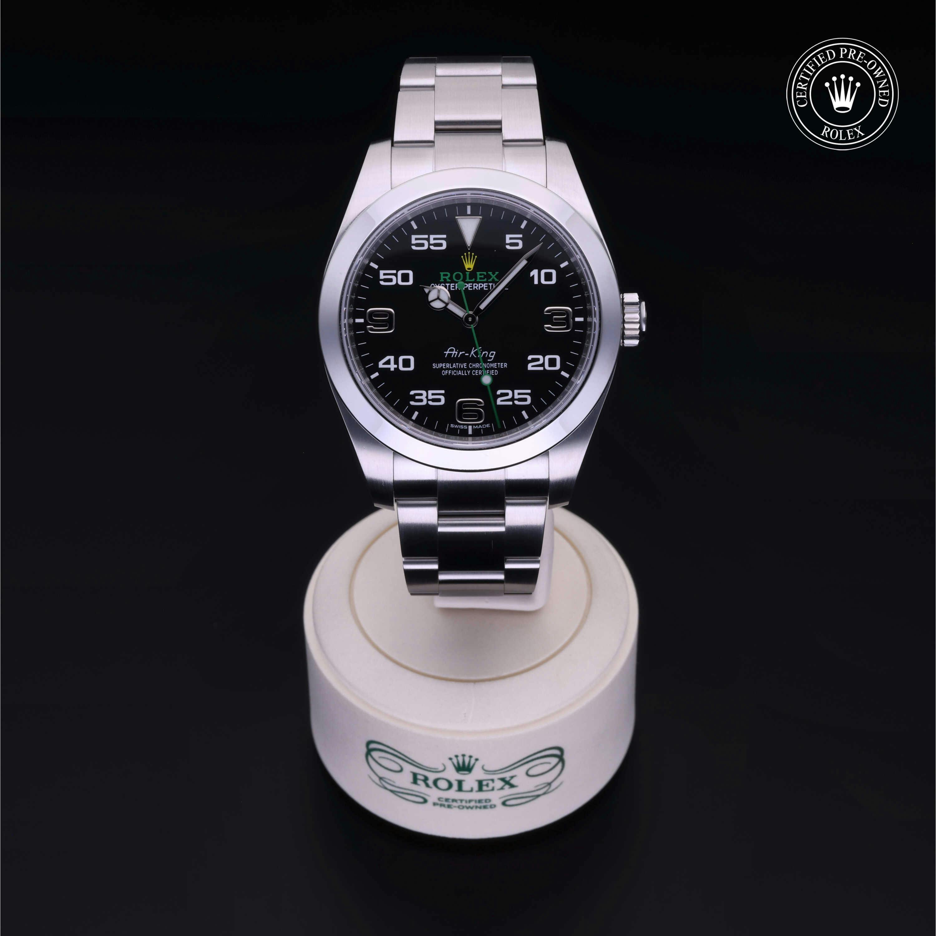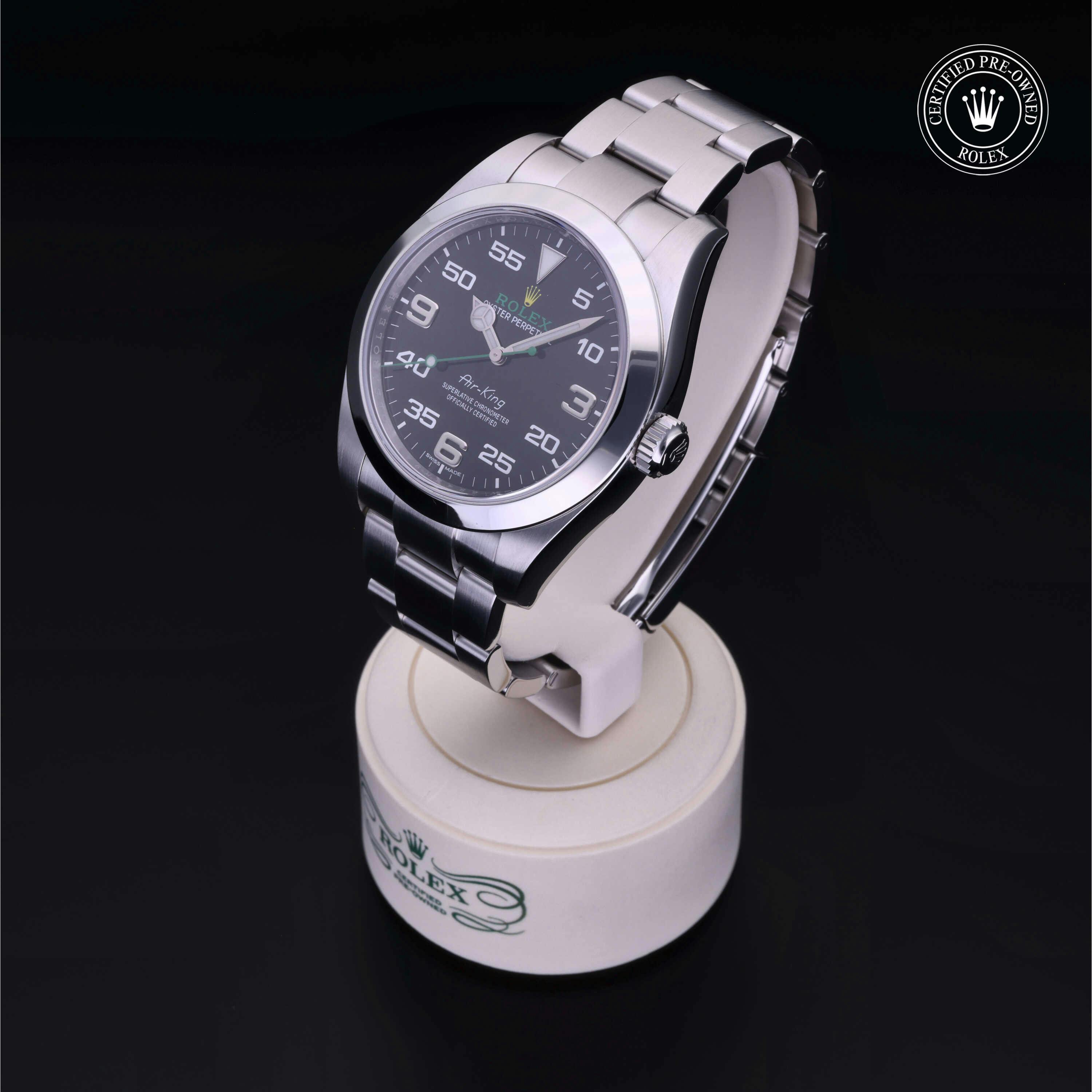 Rolex Certified Pre-Owned Air-King (116900) self - winding automatic watch, features a 40mm stainless steel case and smooth bezel surrounding a black dial on a stainless steel oyster bracelet. Functions include hours, minutes and seconds. This watch has received Rolex-authorized service and certification. It does not come with the original box or papers, but includes a custom Rolex Certified Pre-Owned hang tag, travel pouch and RCPO international warranty card.