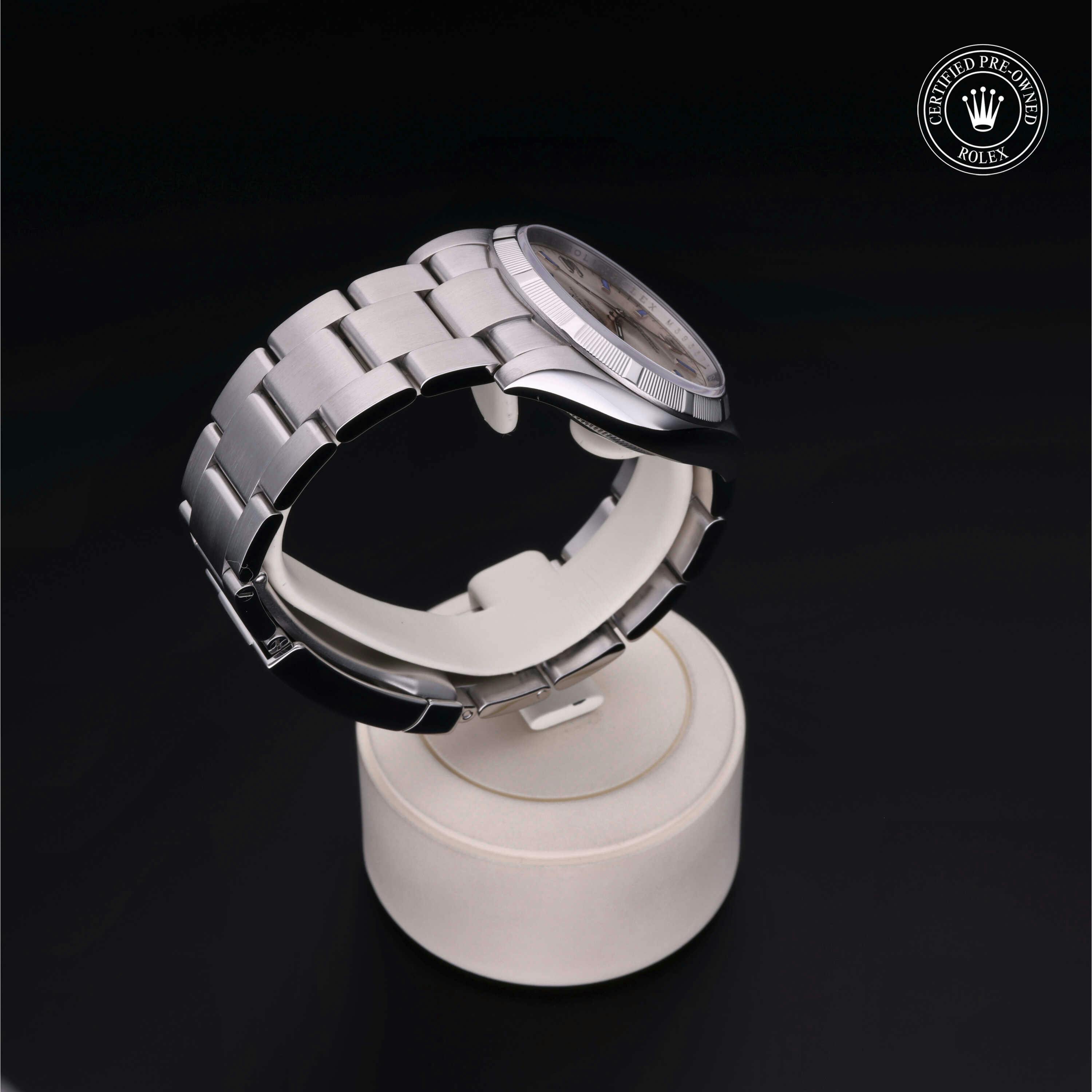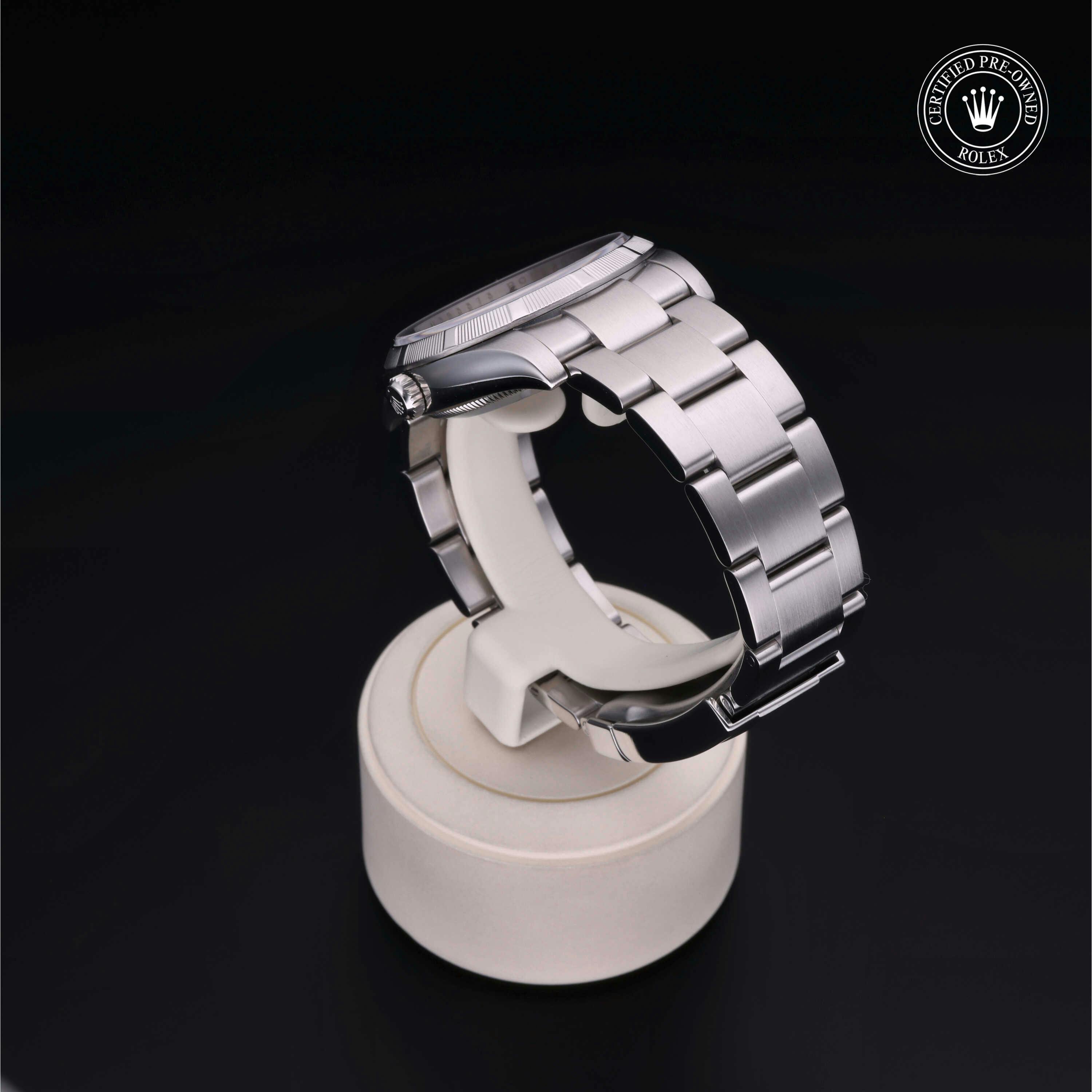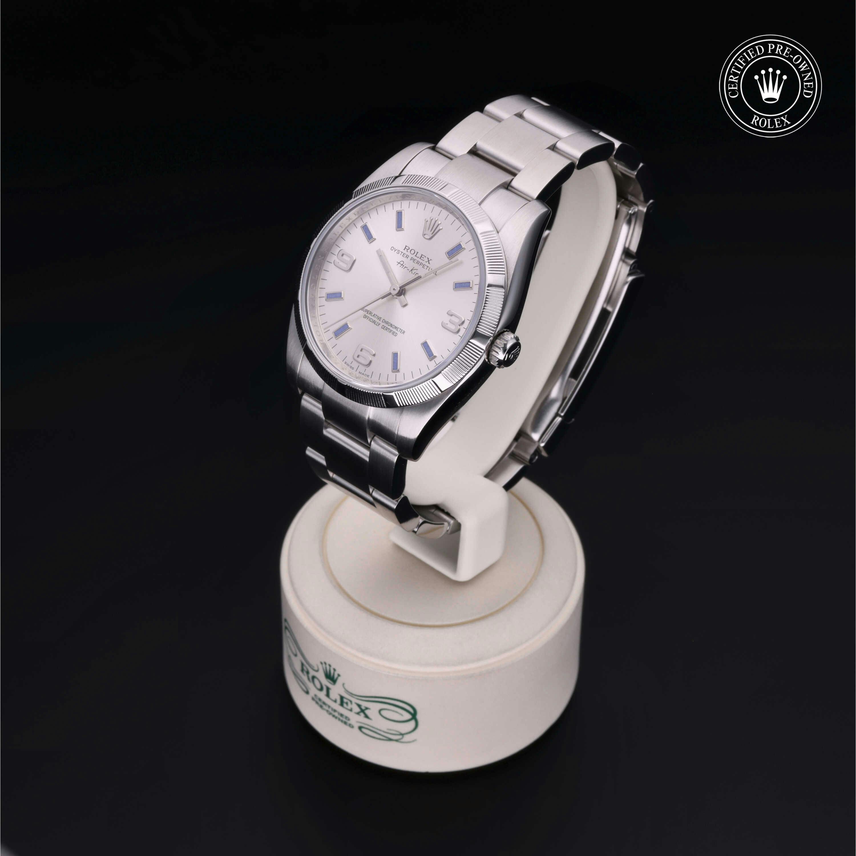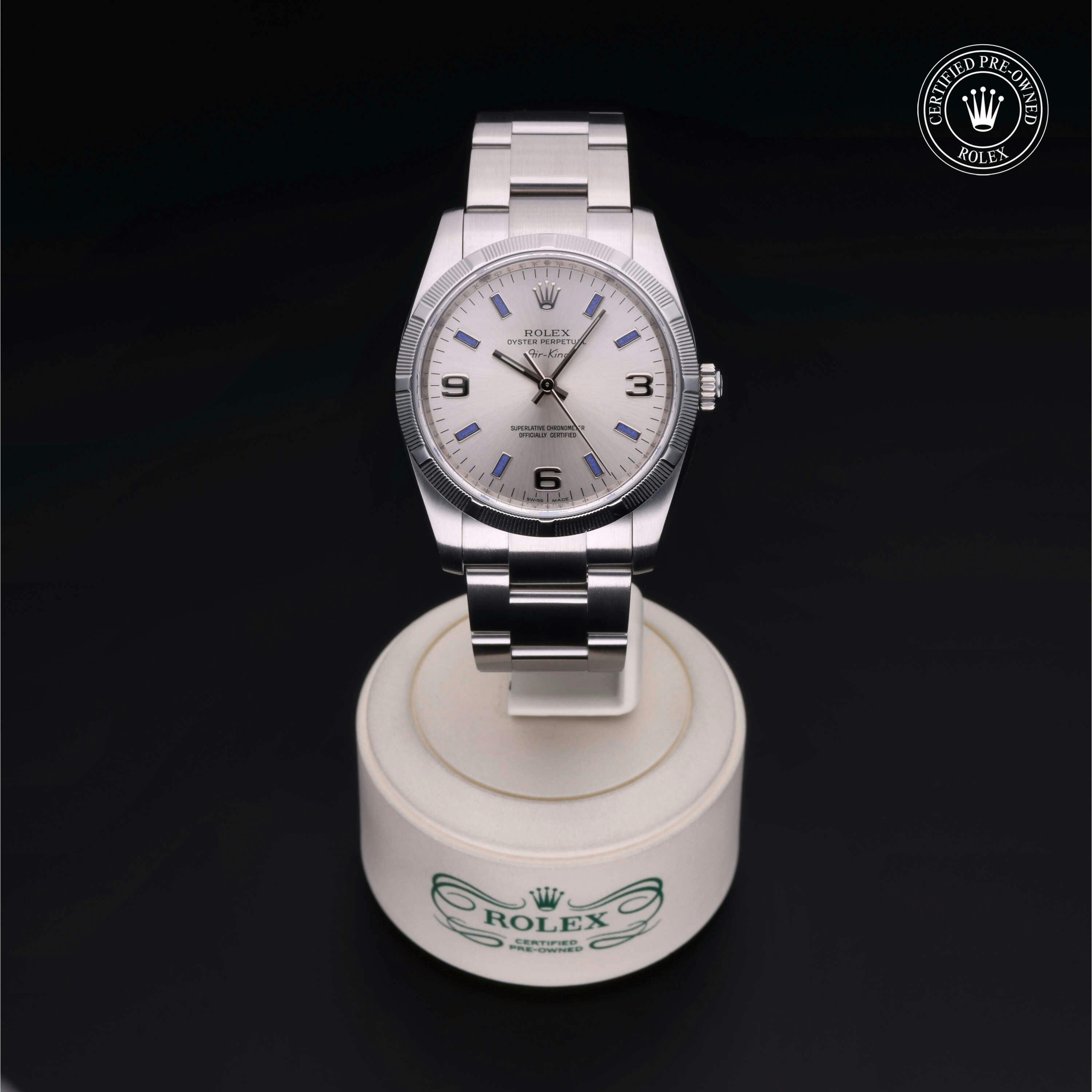 Rolex Certified Pre-Owned Air-King (114200) self - winding automatic watch, features a 34mm stainless steel case and engine-turned bezel surrounding a silver dial on a stainless steel oyster bracelet. Functions include hours, minutes and seconds. This watch has received Rolex-authorized service and certification. It does not come with the original box or papers, but includes a custom Rolex Certified Pre-Owned hang tag, travel pouch and RCPO international warranty card.