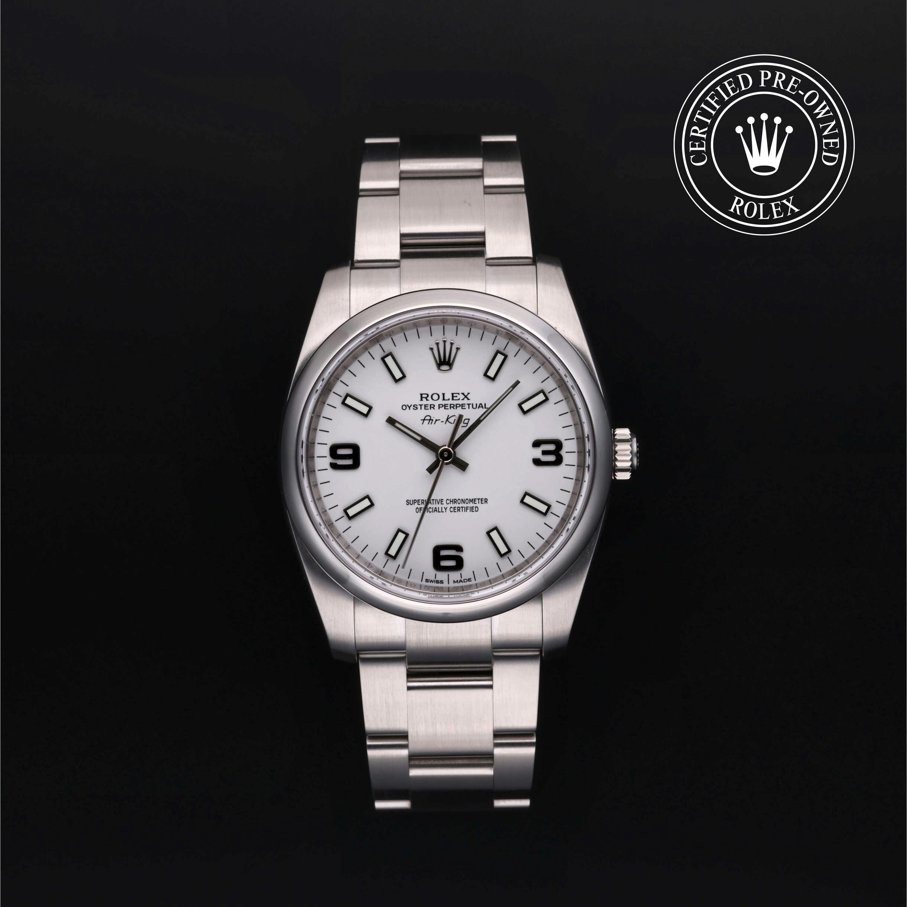 Rolex Certified Pre-Owned Oyster Perpetual Air-King (114200) self - winding automatic watch, features a 34mm stainless steel case with a domed bezel surrounding a white index and numeral dial. The watch is secured on a stainless steel Oyster bracelet complete with a folding buckle. Functions include hours, minutes and seconds. This watch has been serviced by an authorized service center and certified by Rolex. It does not come with the original box or papers, but includes a custom Rolex Certified Pre-Owned hang tag, travel pouch and international warranty card.