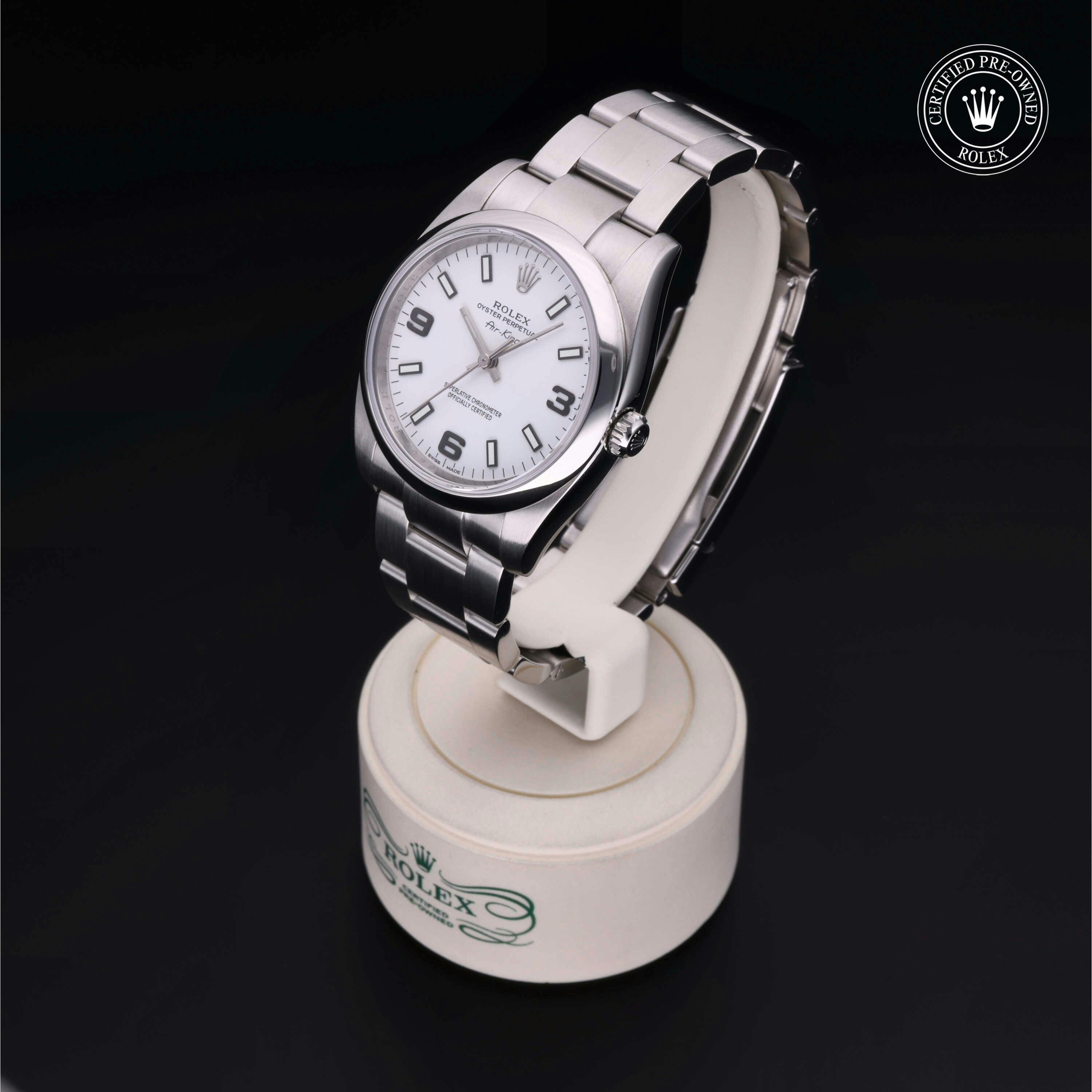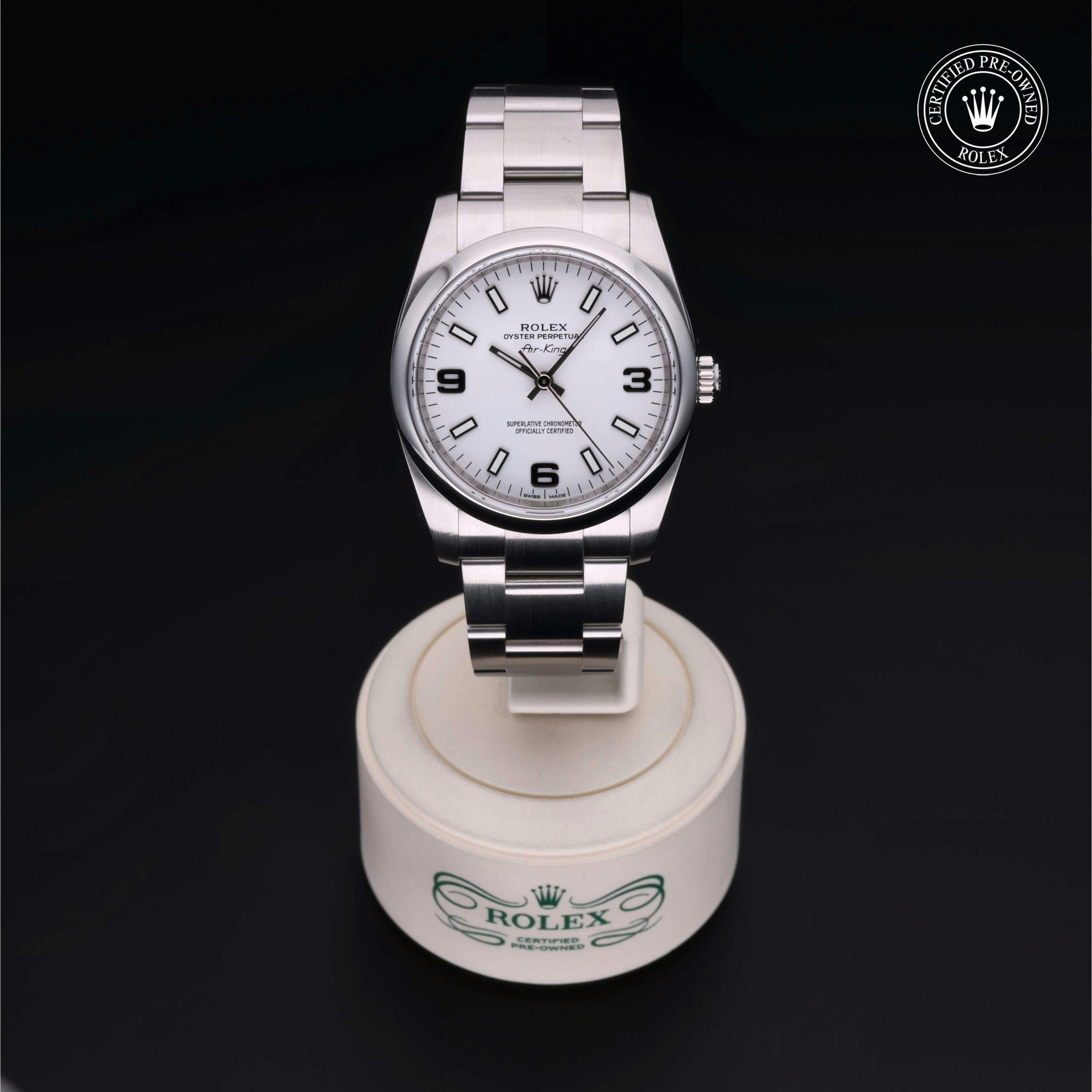 Rolex Certified Pre-Owned Oyster Perpetual Air-King (114200) self - winding automatic watch, features a 34mm stainless steel case with a domed bezel surrounding a white index and numeral dial. The watch is secured on a stainless steel Oyster bracelet complete with a folding buckle. Functions include hours, minutes and seconds. This watch has been serviced by an authorized service center and certified by Rolex. It does not come with the original box or papers, but includes a custom Rolex Certified Pre-Owned hang tag, travel pouch and international warranty card.
