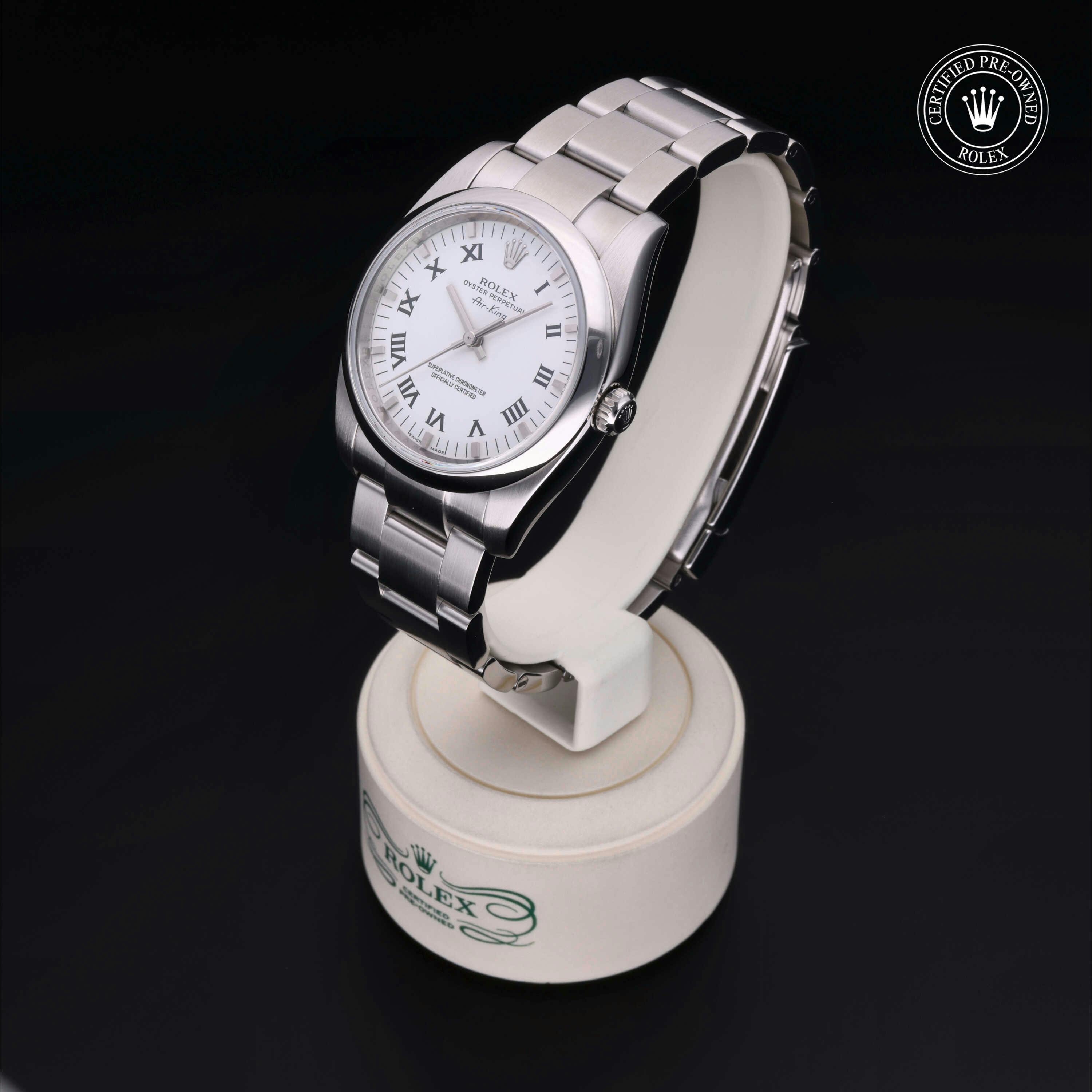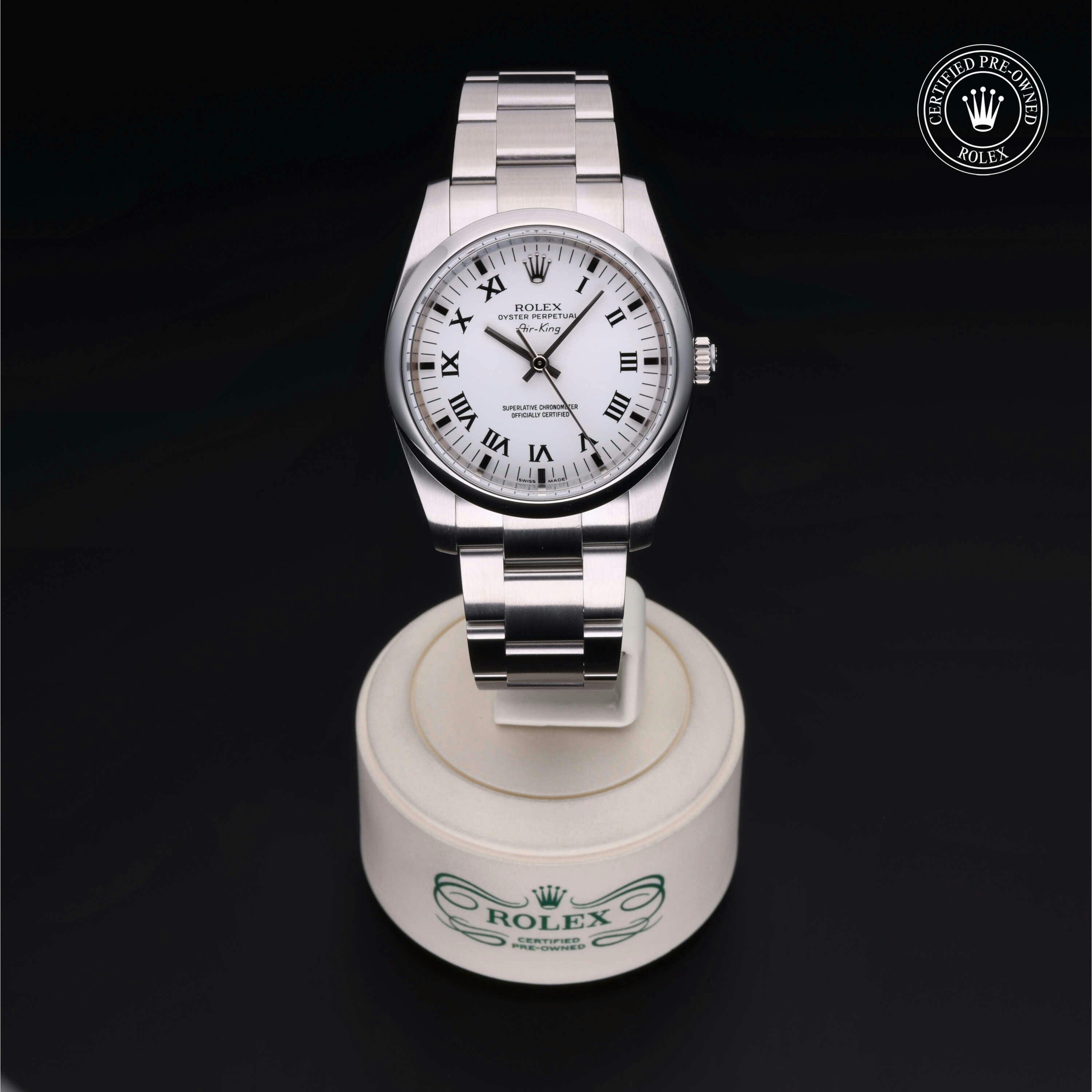 Rolex Certified Pre-Owned Air-King (114200) self - winding automatic watch, features a 34mm stainless steel case and domed bezel surrounding a white dial on a stainless steel oyster bracelet. Functions include hours, minutes and seconds. This watch has received Rolex-authorized service and certification. It comes with the original papers, and includes a custom Rolex Certified Pre-Owned hang tag, travel pouch and RCPO international warranty card.