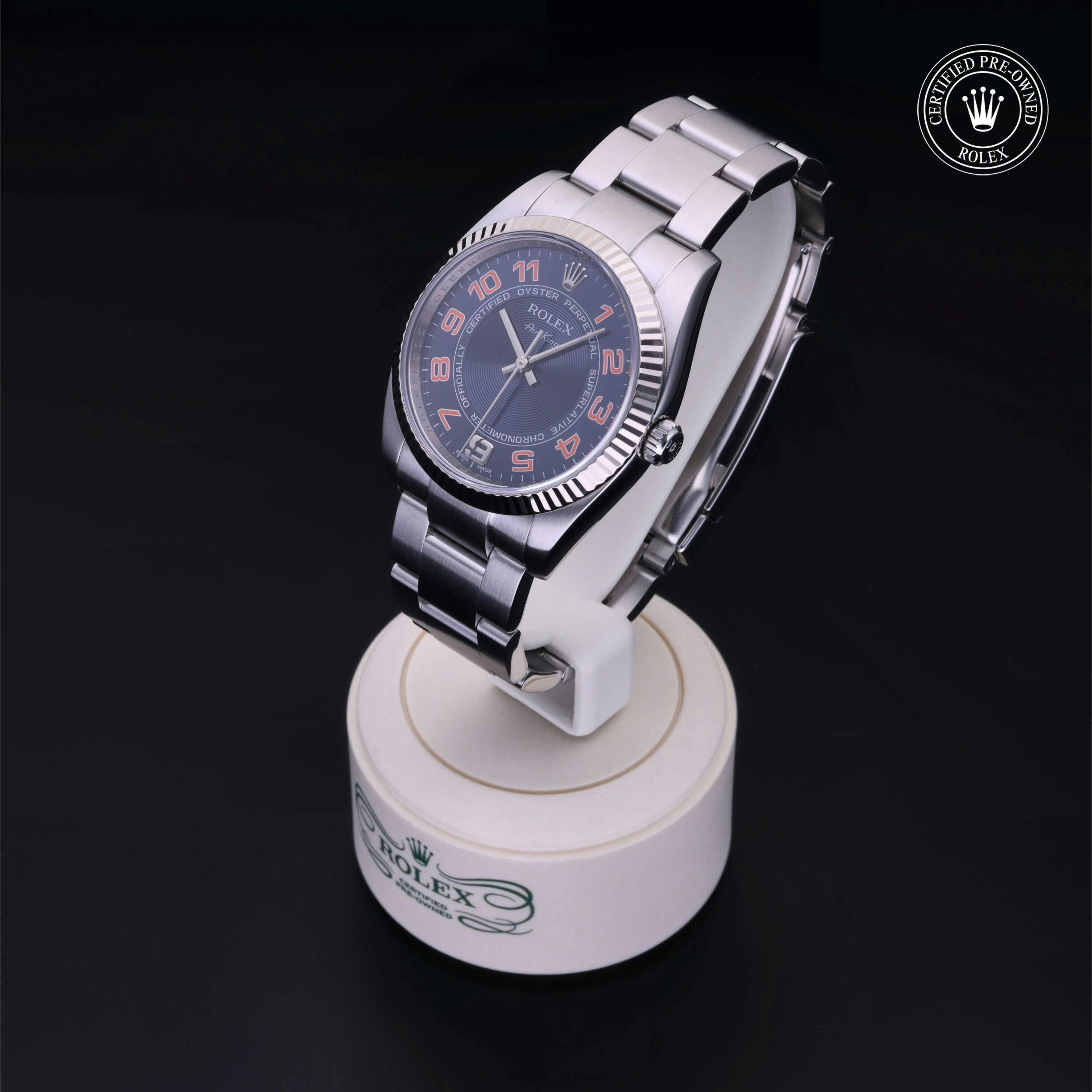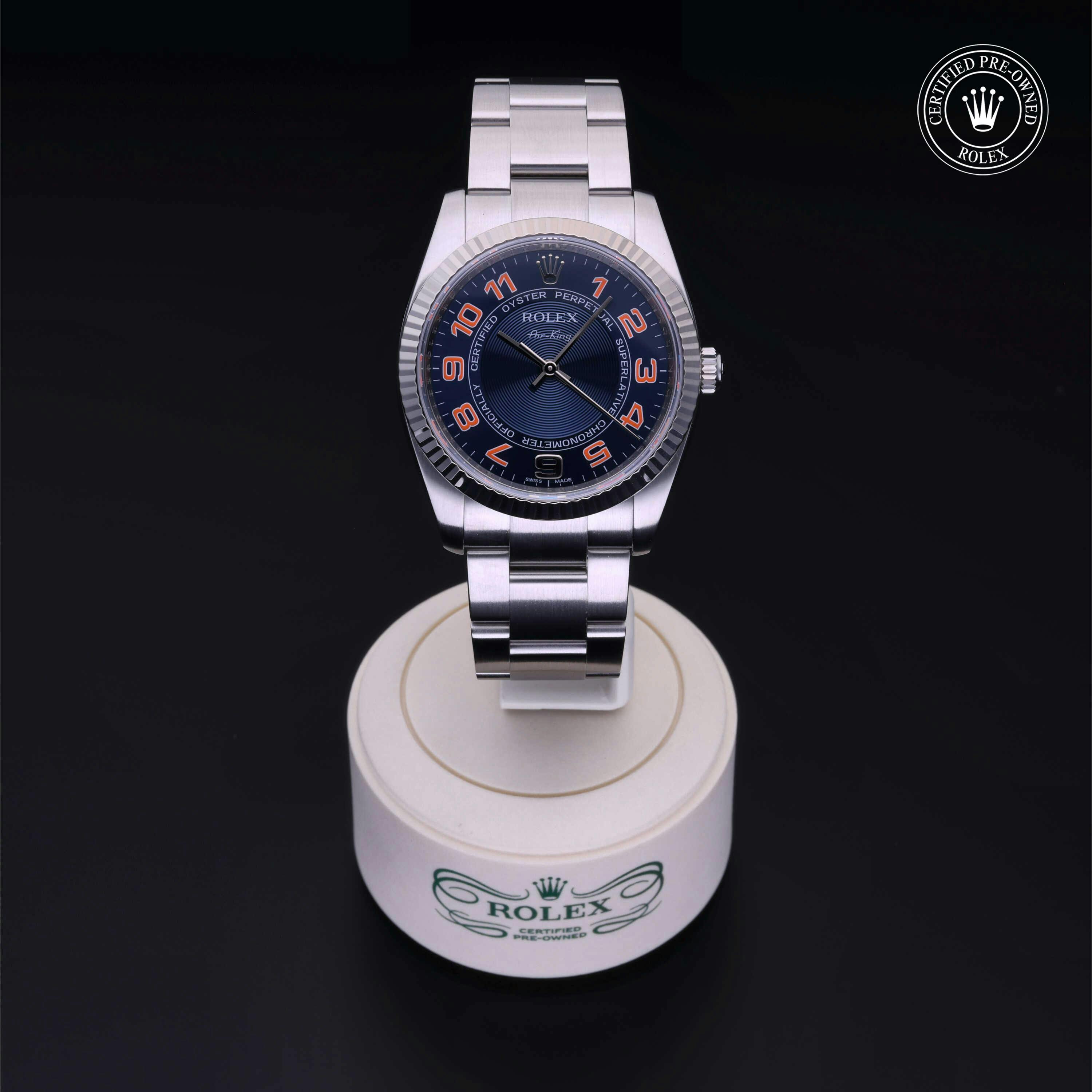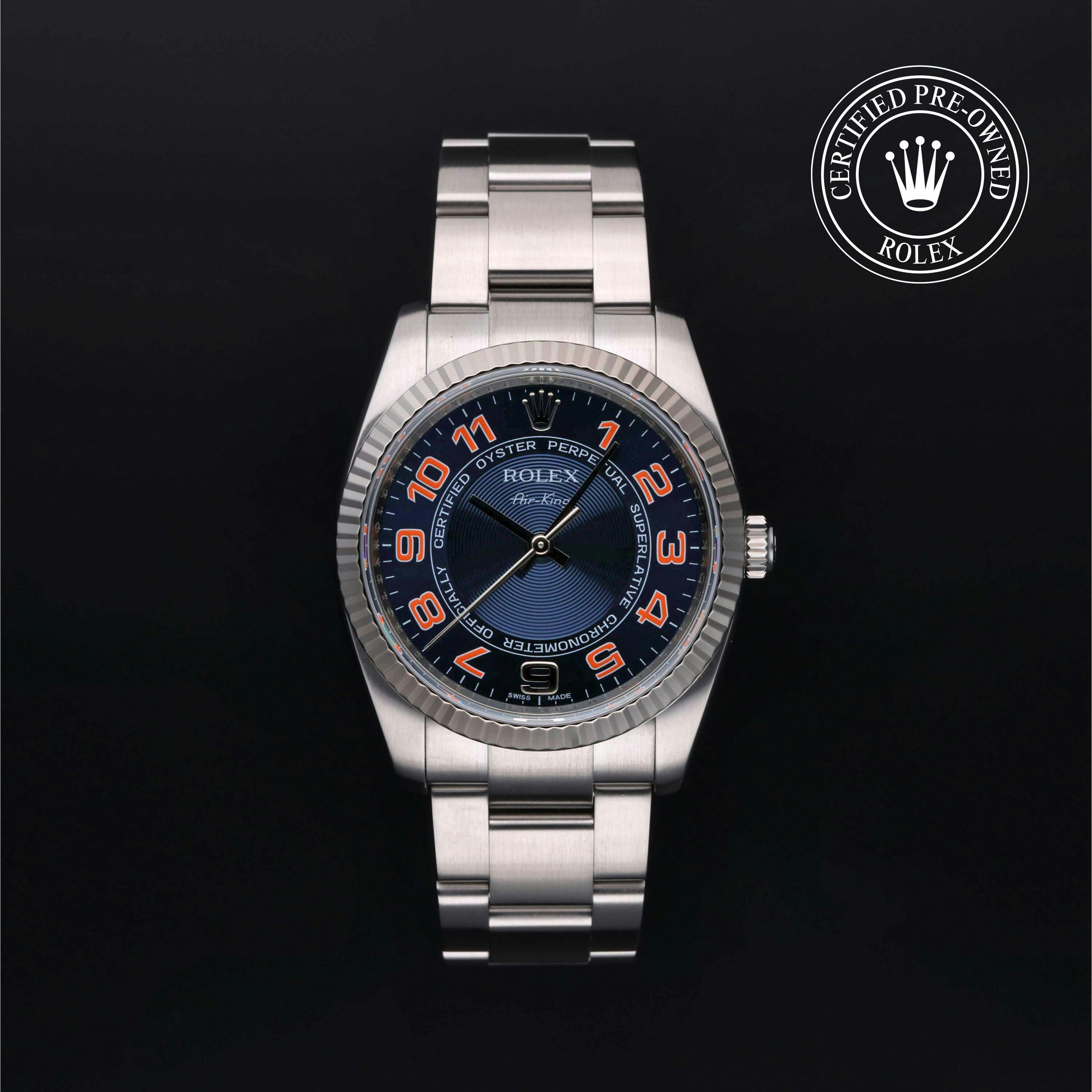 Rolex Certified Pre-Owned Air-King (114234) self - winding automatic watch, features a 34mm stainless steel case with an 18k white gold fluted bezel surrounding a blue and orange concentric dial on a stainless steel oyster bracelet. Functions include hours, minutes, seconds and date. This watch has received Rolex-authorized service and certification. It does not come with the original box or papers, but includes a custom Rolex Certified Pre-Owned hang tag, travel pouch and RCPO international warranty card.