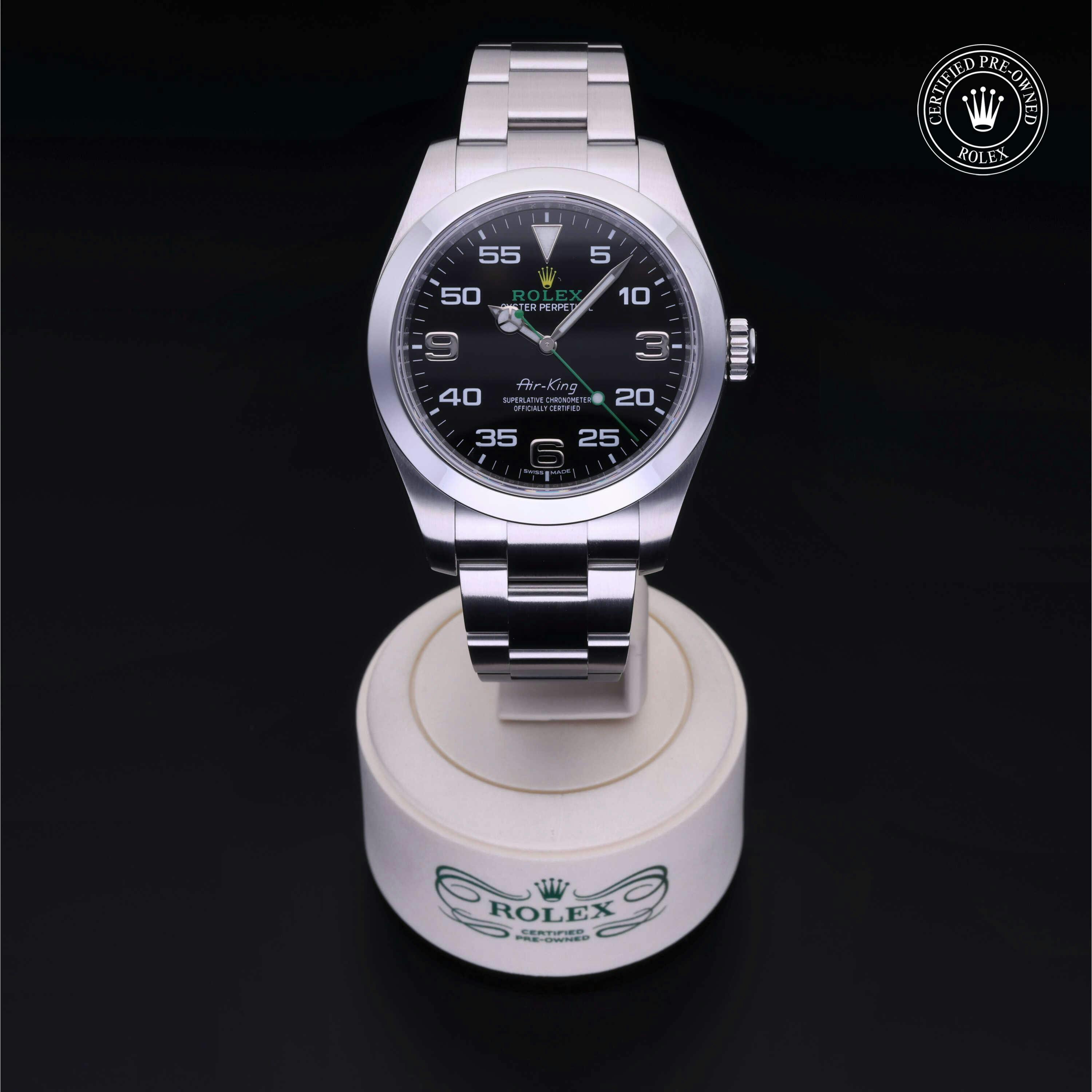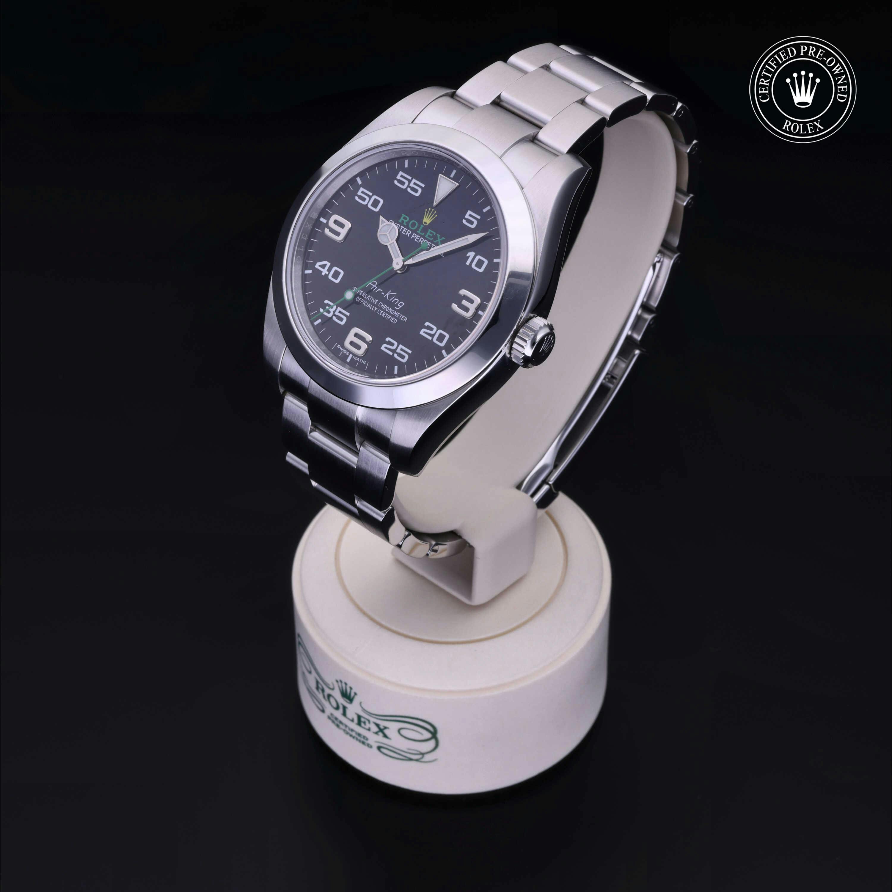 Rolex Certified Pre-Owned Air-King (116900) self - winding automatic watch, features a 40mm stainless steel case and smooth bezel surrounding a black dial on a stainless steel oyster bracelet. Functions include hours, minutes and seconds. This watch has received Rolex-authorized service and certification. It comes with the original papers, and includes a custom Rolex Certified Pre-Owned hang tag, travel pouch and RCPO international warranty card.