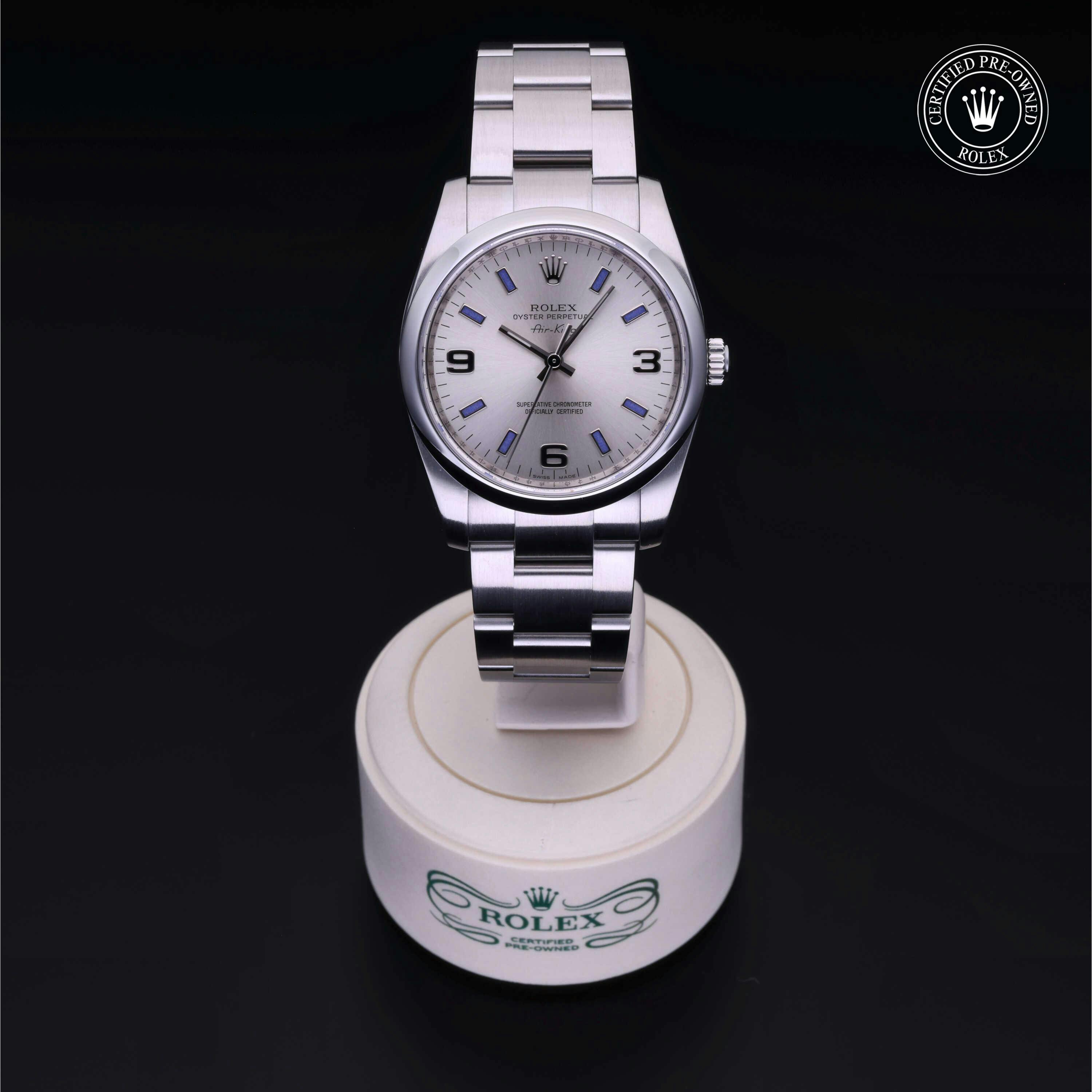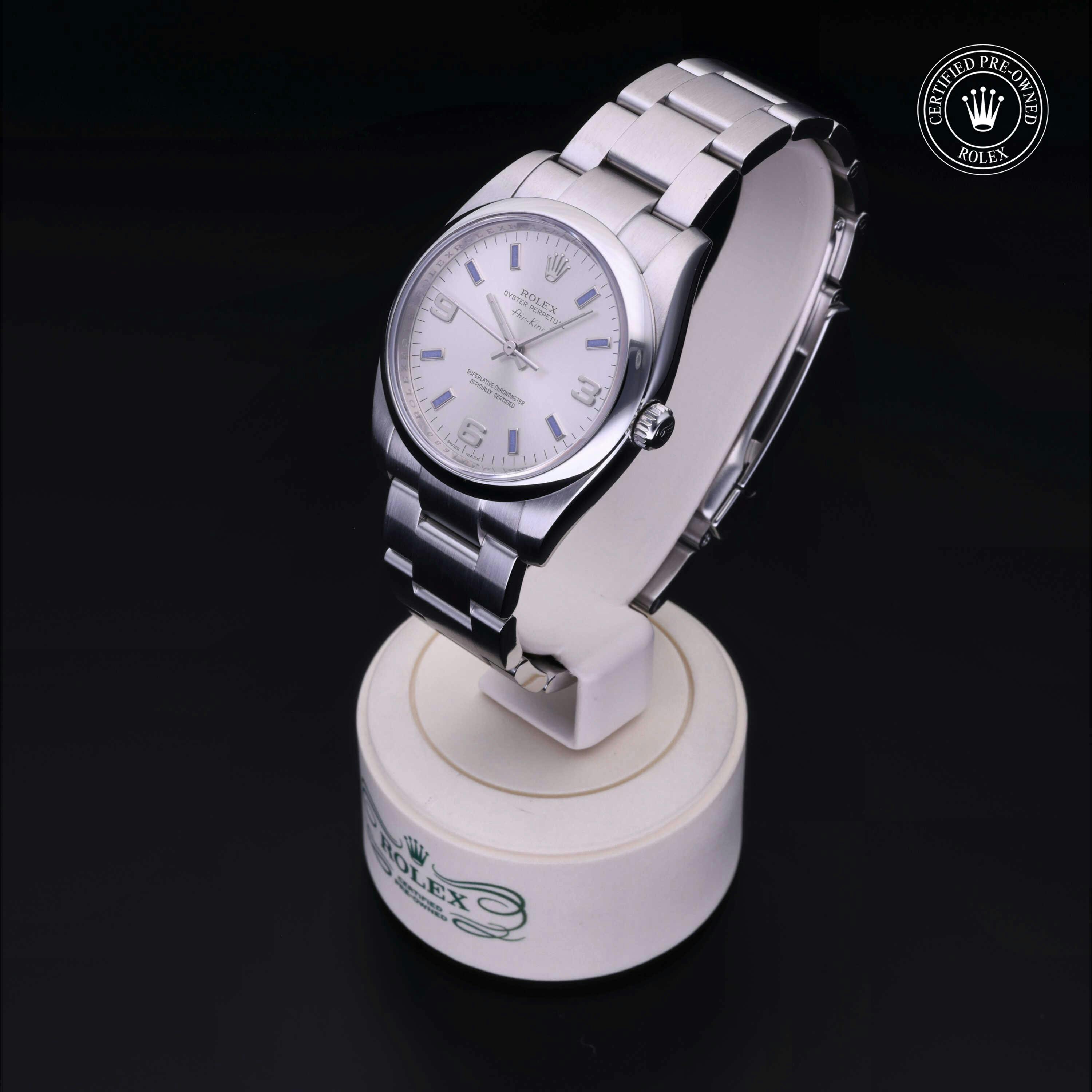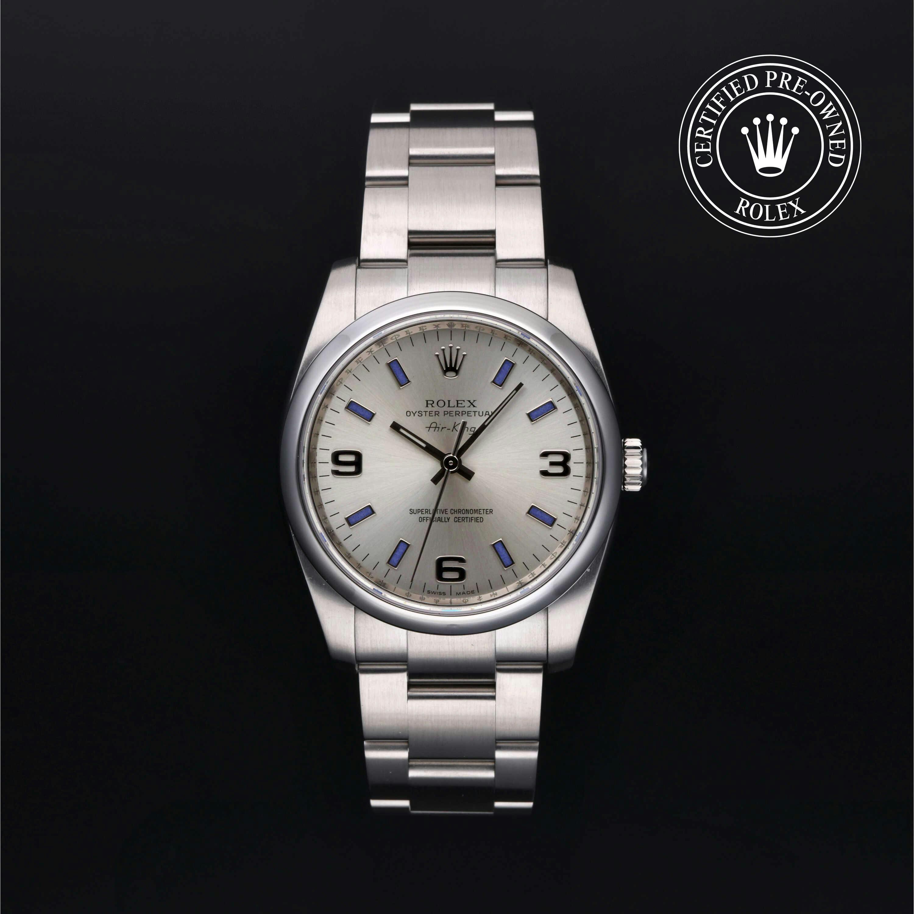 Rolex Certified Pre-Owned Air-King (114200) self - winding automatic watch, features a 34mm stainless steel case and domed bezel surrounding a silver dial on a stainless steel oyster bracelet. Functions include hours, minutes and seconds. This watch has received Rolex-authorized service and certification. It comes with the original papers, and includes a custom Rolex Certified Pre-Owned hang tag, travel pouch and RCPO international warranty card.
