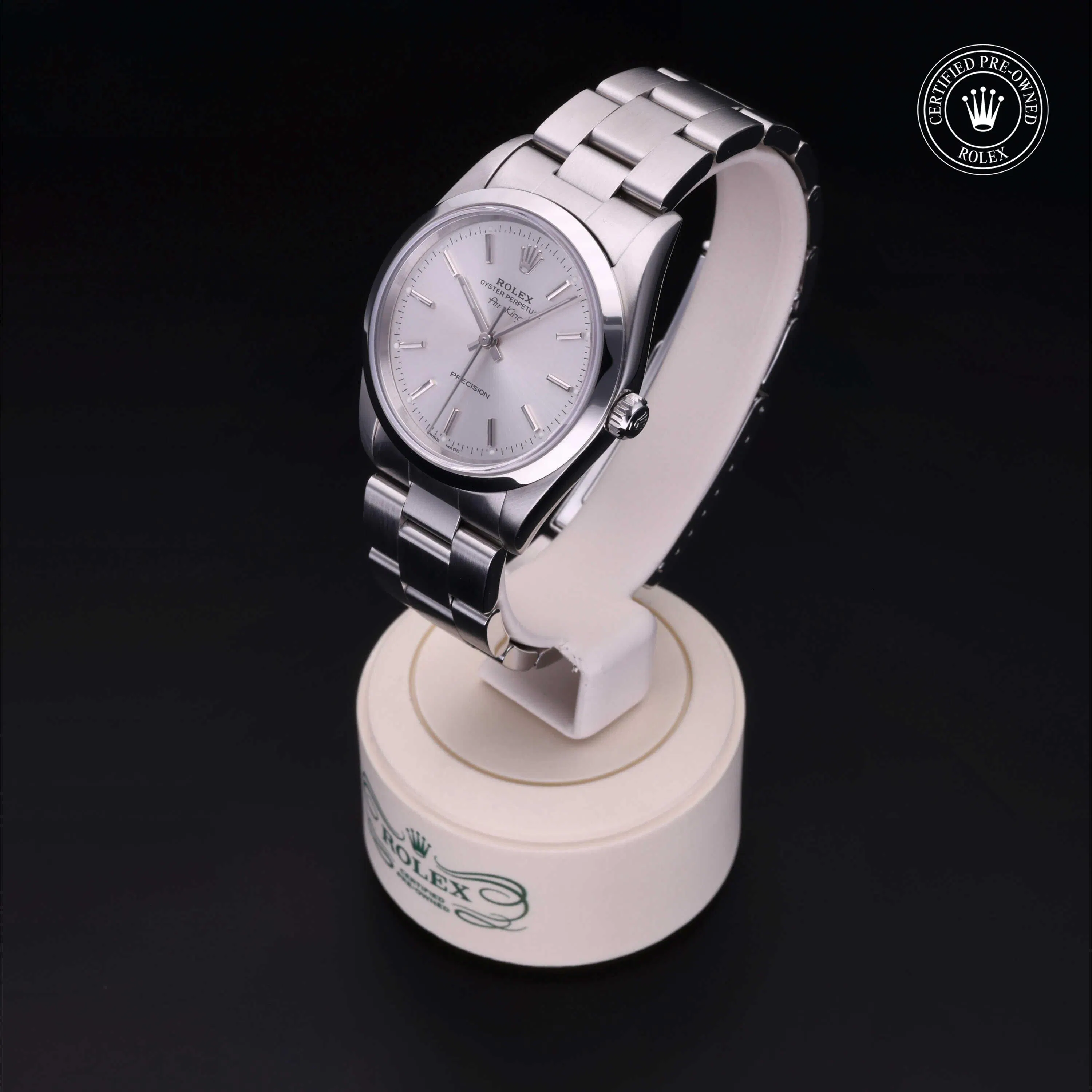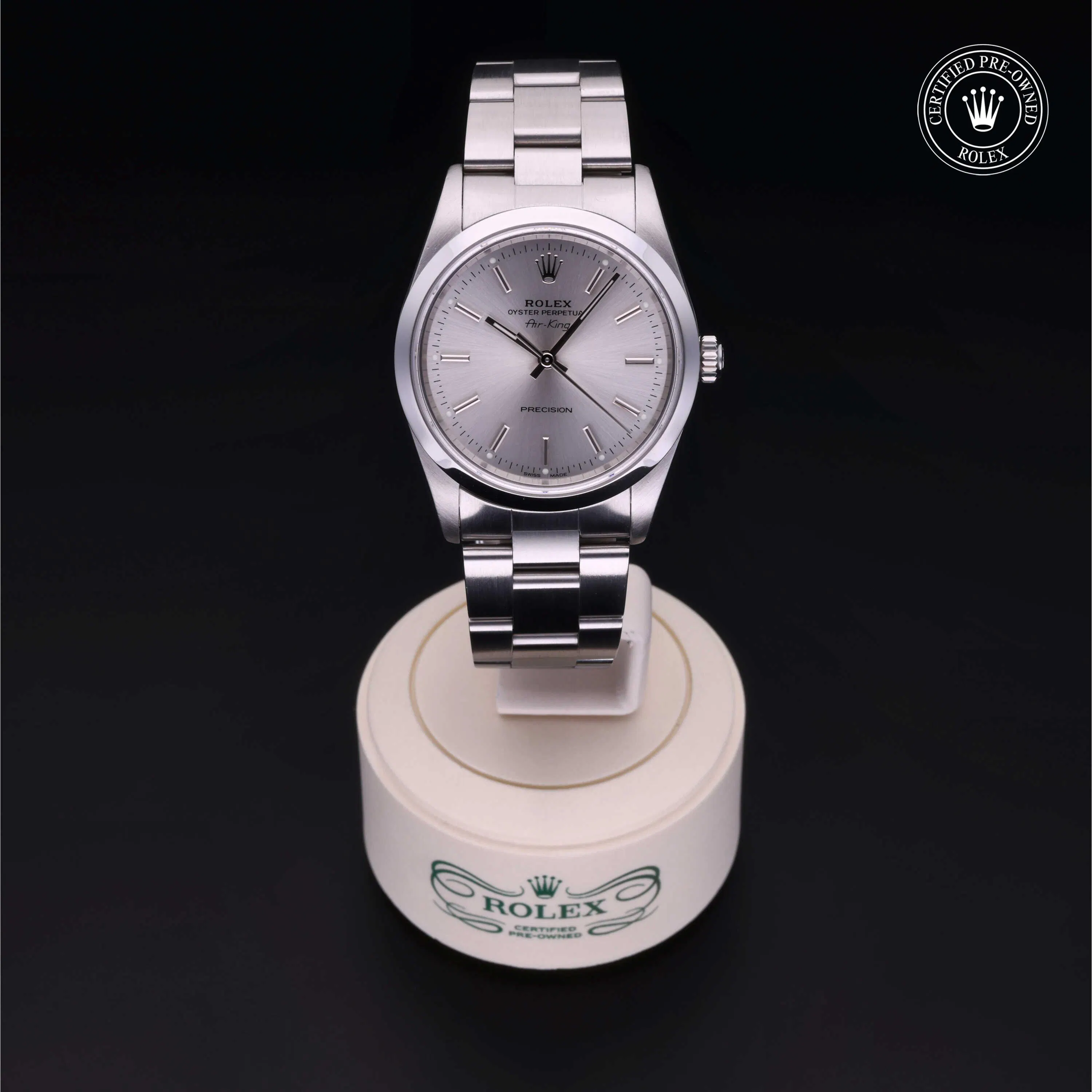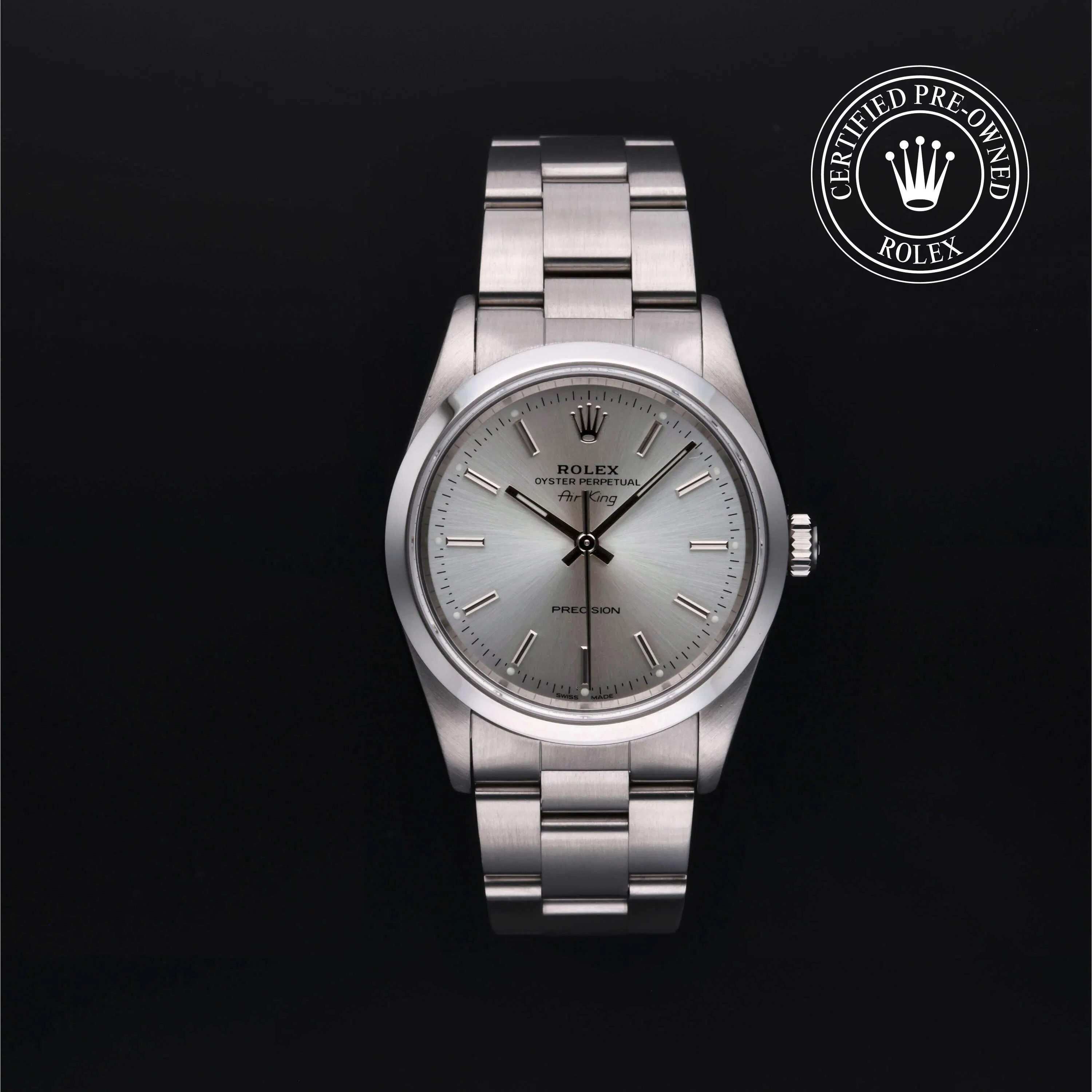 Rolex Certified Pre-Owned Air-King (14000) self - winding automatic watch, features a 34mm stainless steel case and smooth bezel surrounding a silver dial on a stainless steel oyster bracelet. Functions include hours, minutes and seconds. This watch has received Rolex-authorized service and certification. It does not come with the original box or papers, but includes a custom Rolex Certified Pre-Owned hang tag, travel pouch and RCPO international warranty card.