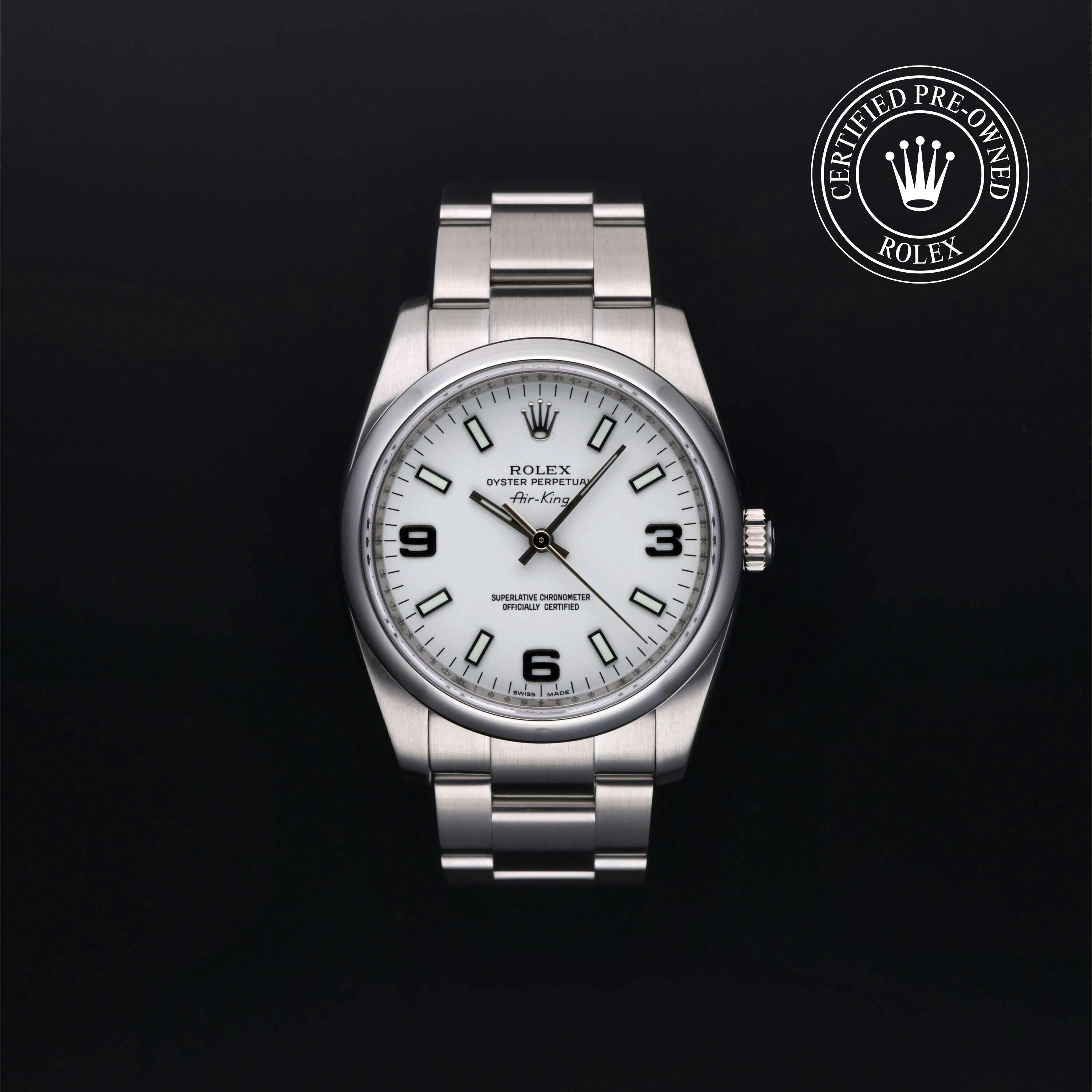 Rolex Certified Pre-Owned Oyster Perpetual Air-King (114200) self - winding automatic watch, features a 34mm stainless steel case and domed bezel surrounding a white dial on a stainless steel oyster bracelet. Functions include hours, minutes and seconds. This watch has received Rolex-authorized service and certification. It does not come with the original box or papers, but includes a custom Rolex Certified Pre-Owned hang tag, travel pouch and RCPO international warranty card.