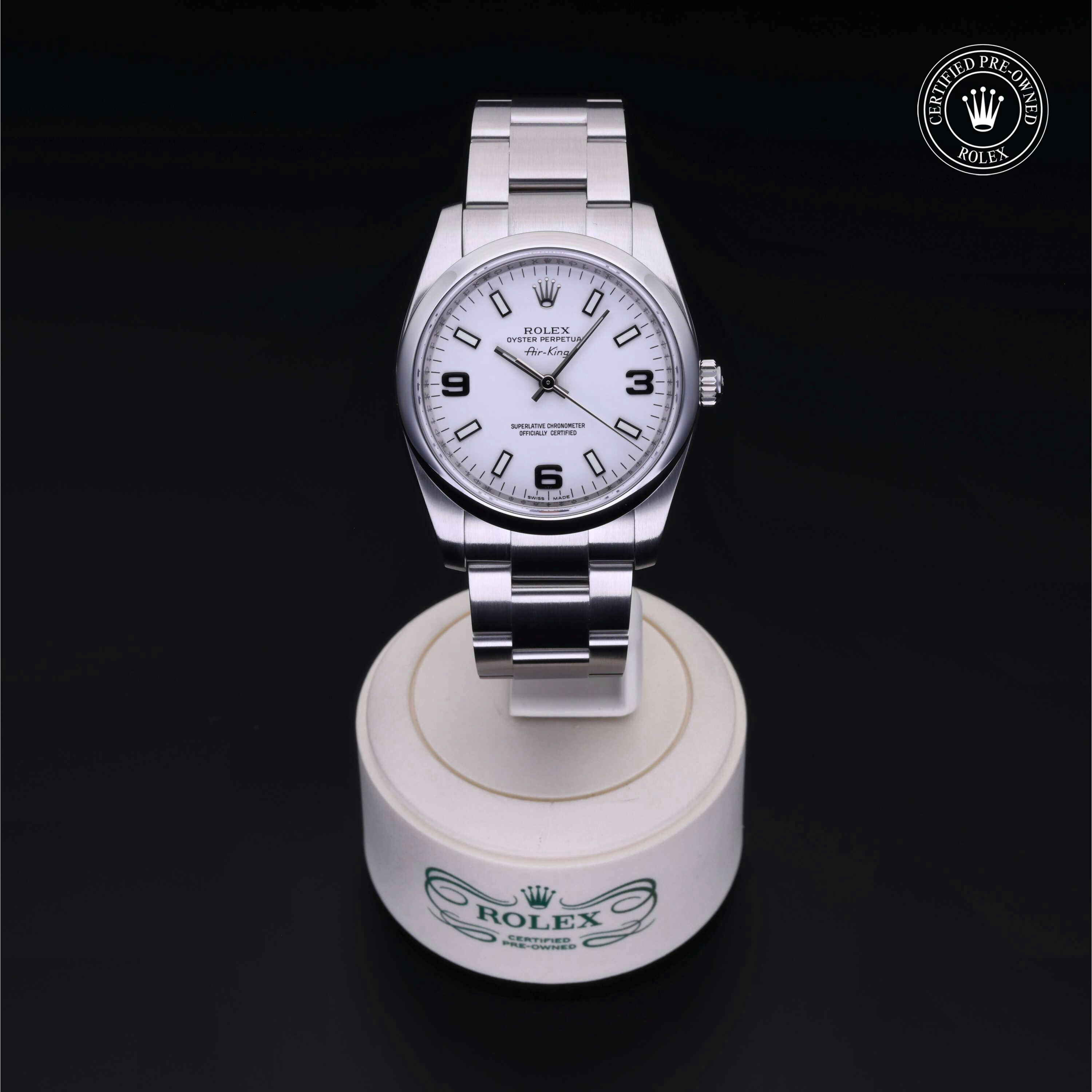 Rolex Certified Pre-Owned Oyster Perpetual Air-King (114200) self - winding automatic watch, features a 34mm stainless steel case and domed bezel surrounding a white dial on a stainless steel oyster bracelet. Functions include hours, minutes and seconds. This watch has received Rolex-authorized service and certification. It does not come with the original box or papers, but includes a custom Rolex Certified Pre-Owned hang tag, travel pouch and RCPO international warranty card.