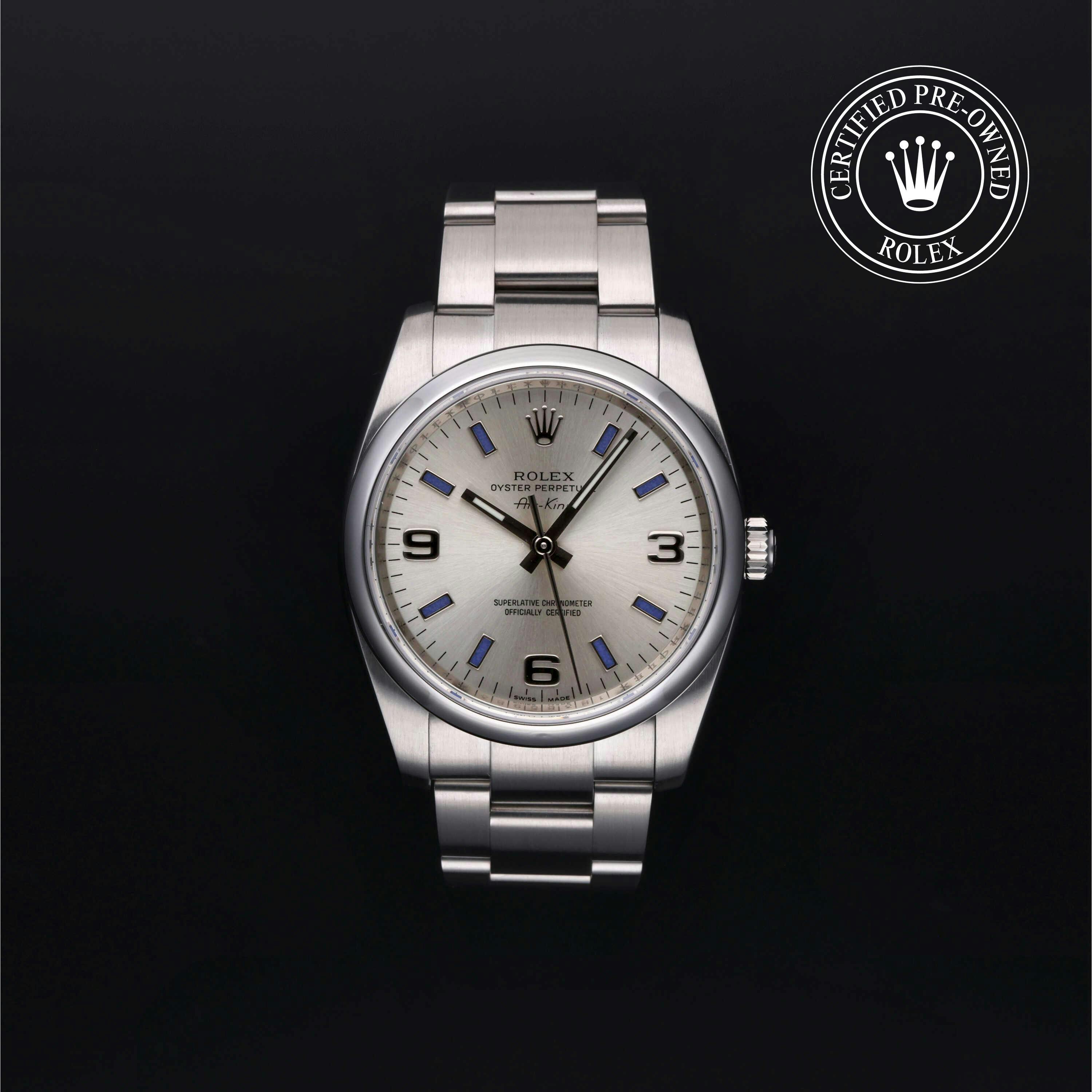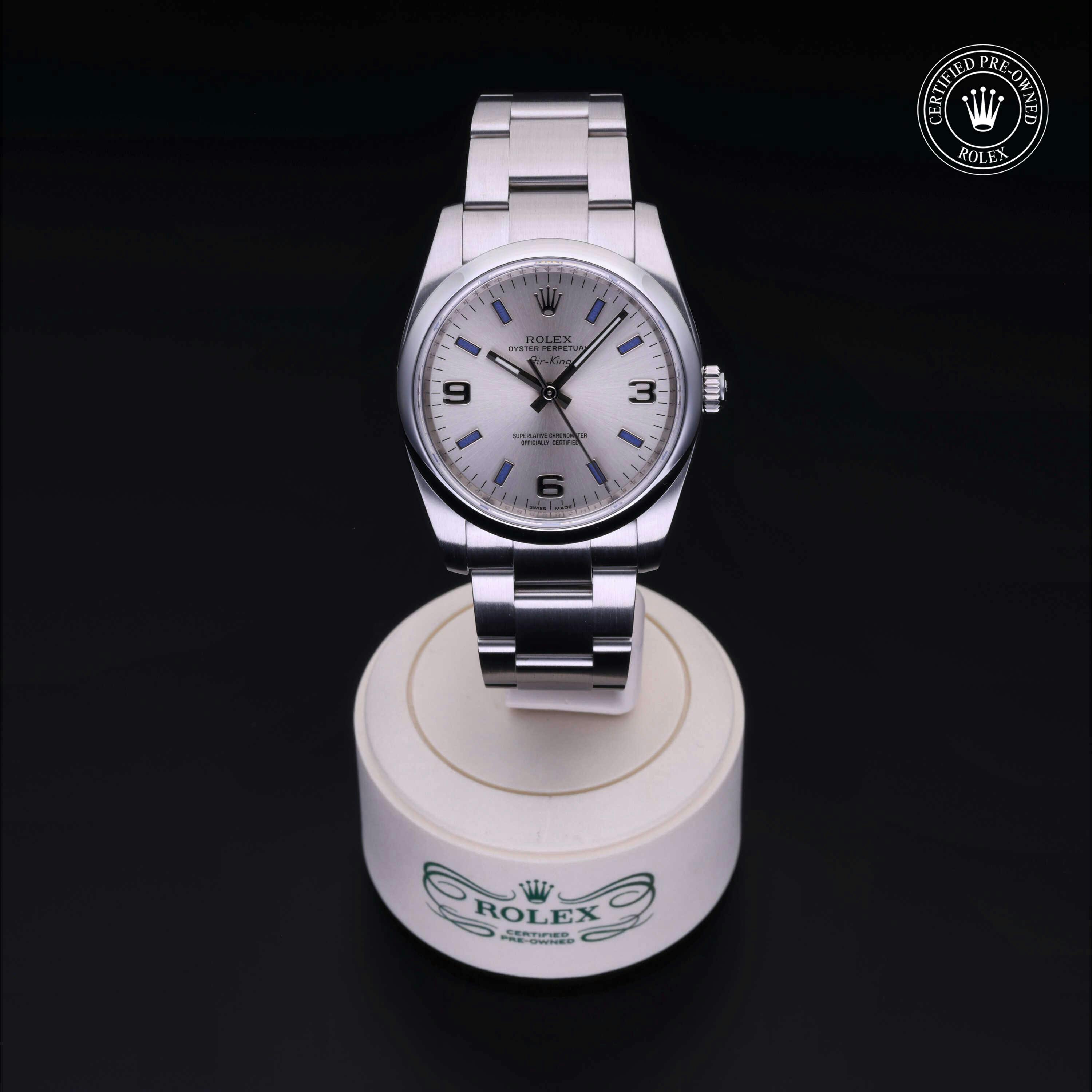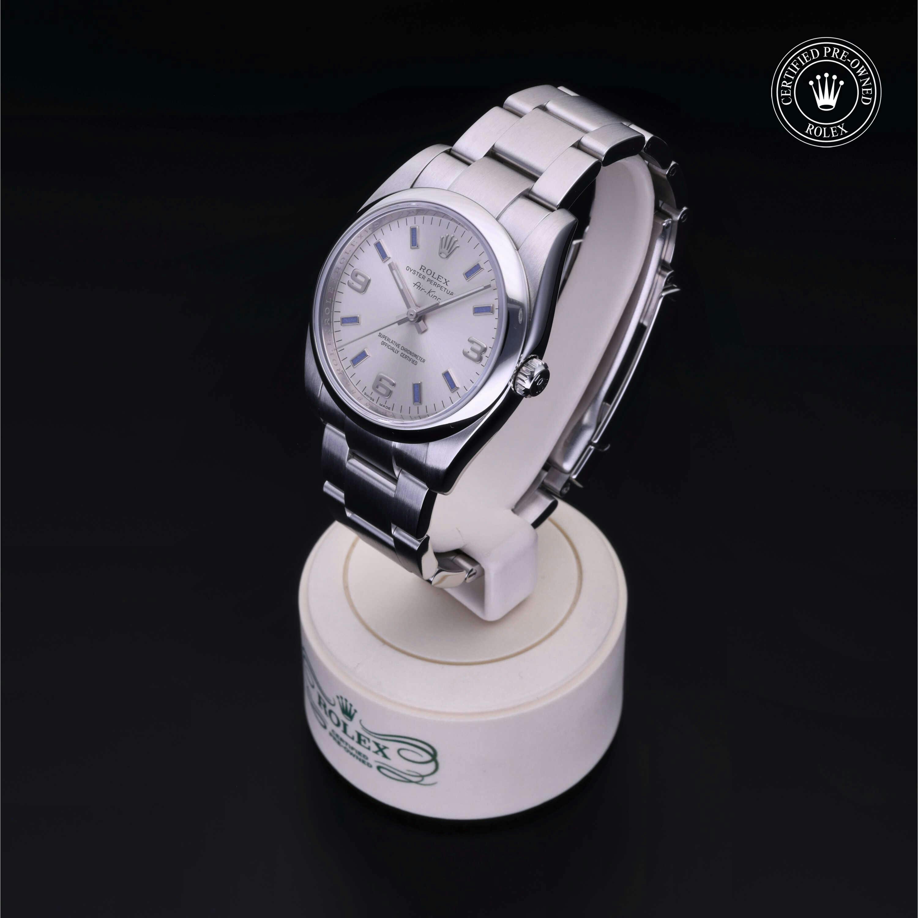 Rolex Certified Pre-Owned Air-King (114200) self - winding automatic watch, features a 34mm stainless steel case and domed bezel surrounding a silver dial on a stainless steel oyster bracelet. Functions include hours, minutes and seconds. This watch has received Rolex-authorized service and certification. It does not come with the original box or papers, but includes a custom Rolex Certified Pre-Owned hang tag, travel pouch and RCPO international warranty card.