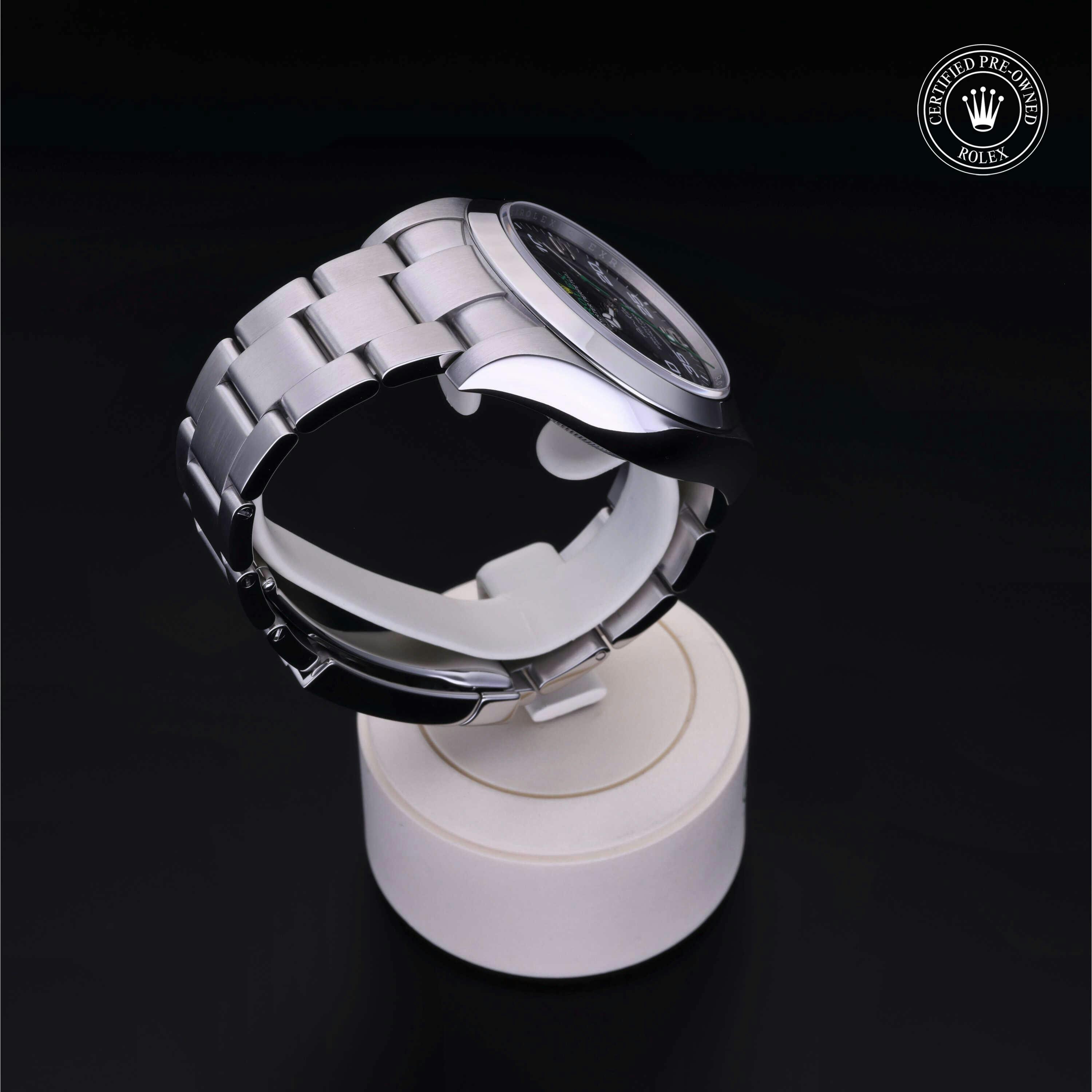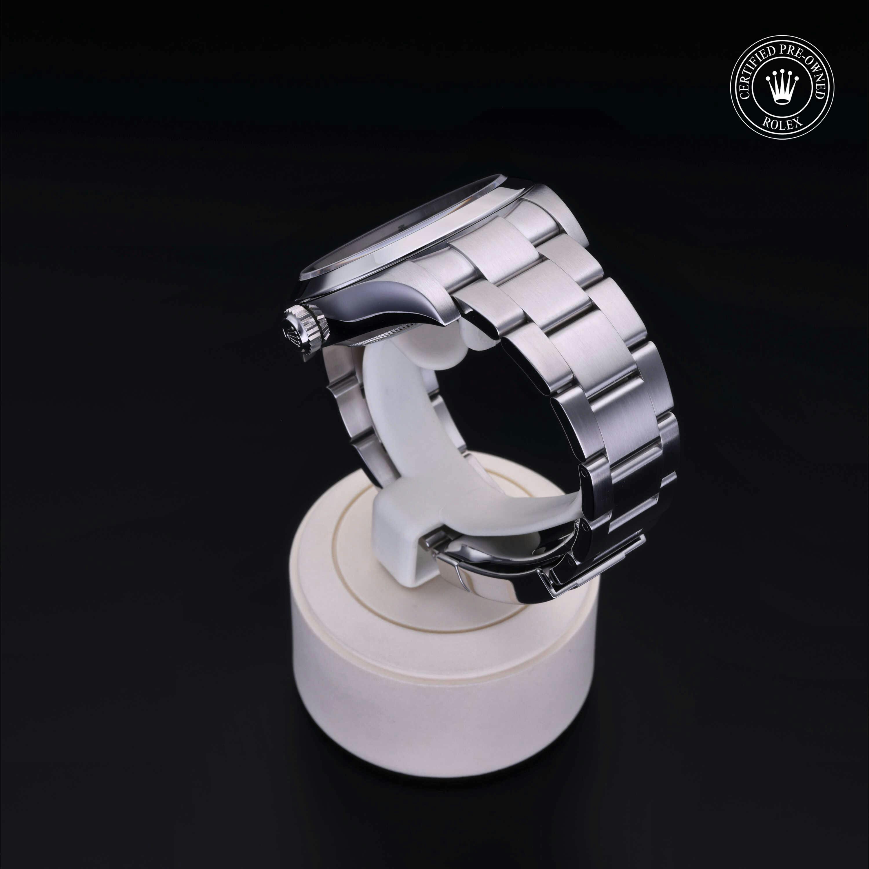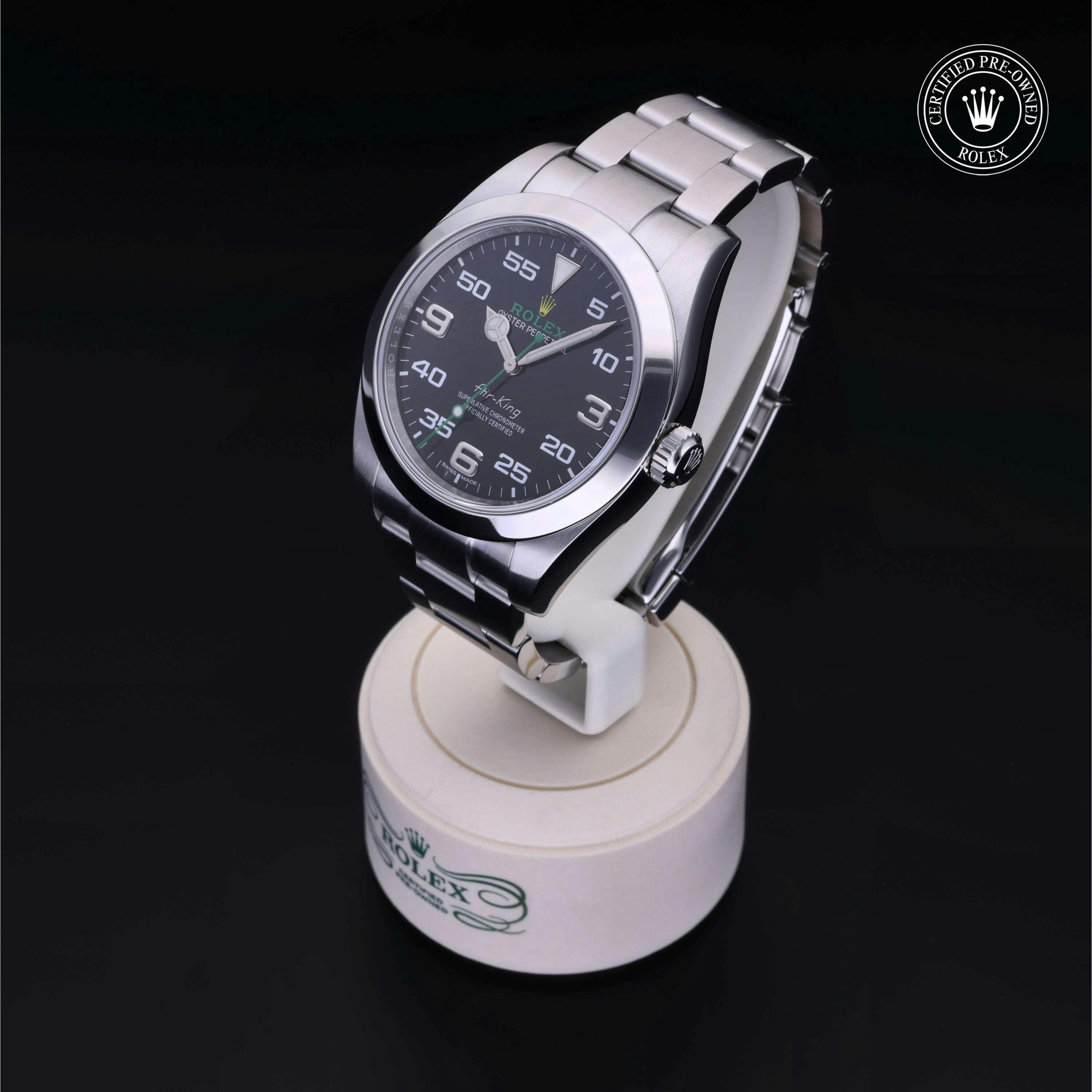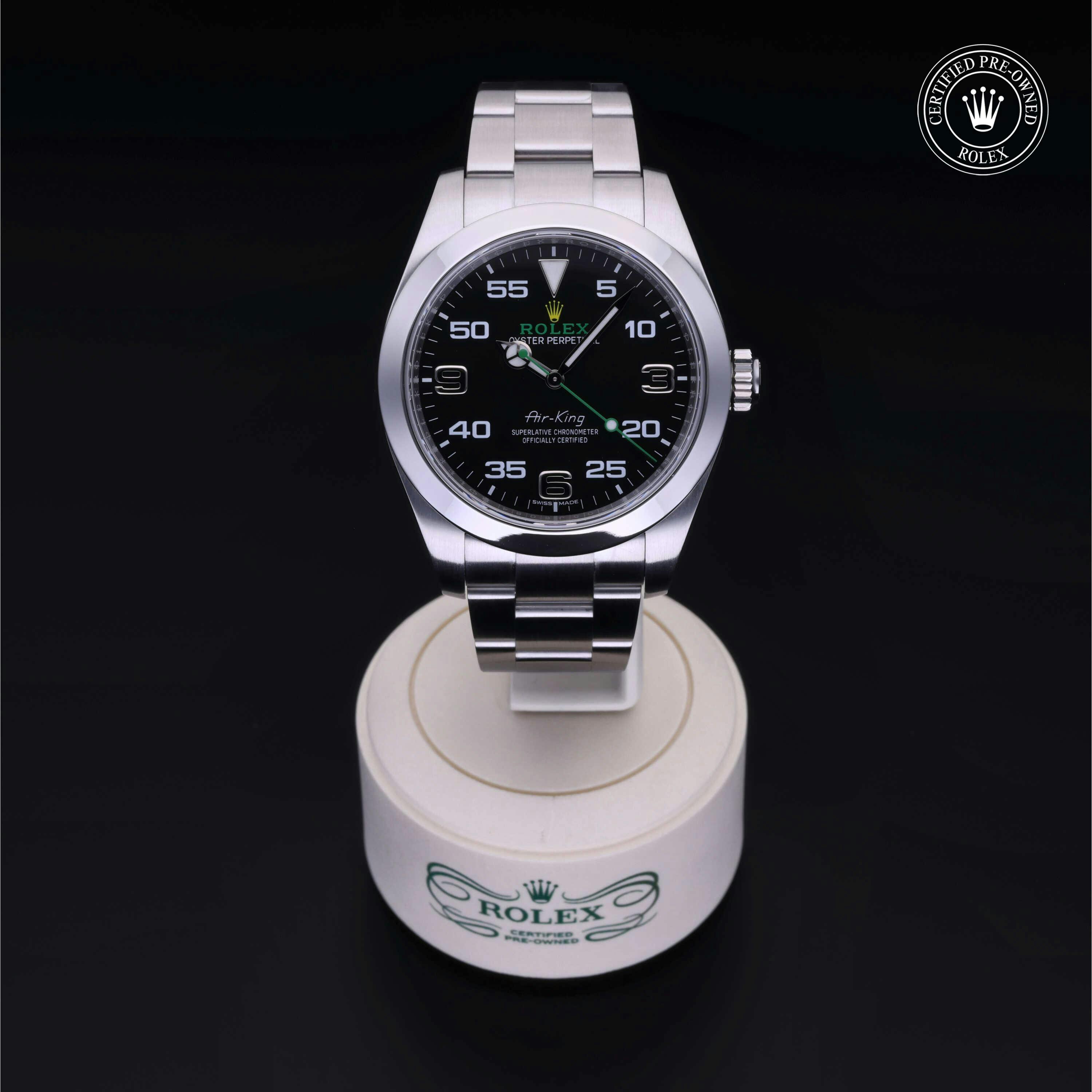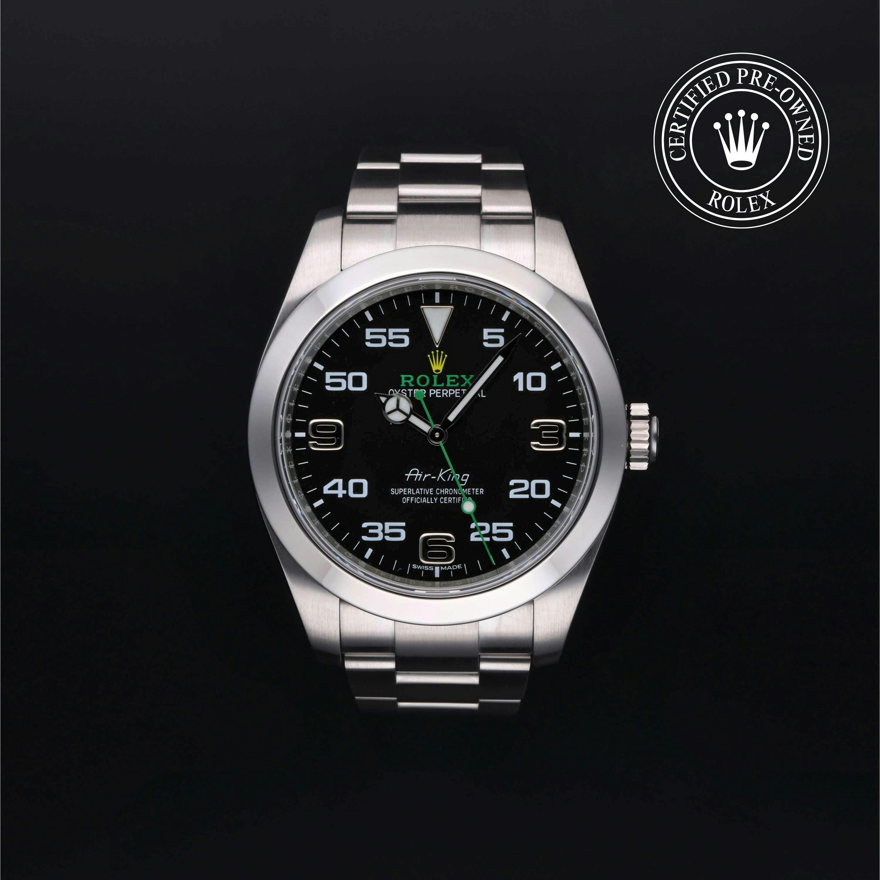 Rolex Certified Pre-Owned Air-King (116900) self - winding automatic watch, features a 40mm stainless steel case and smooth bezel surrounding a black dial on a stainless steel oyster bracelet. Functions include hours, minutes and seconds. This watch has received Rolex-authorized service and certification. It does not come with the original box or papers, but includes a custom Rolex Certified Pre-Owned hang tag, travel pouch and RCPO international warranty card.