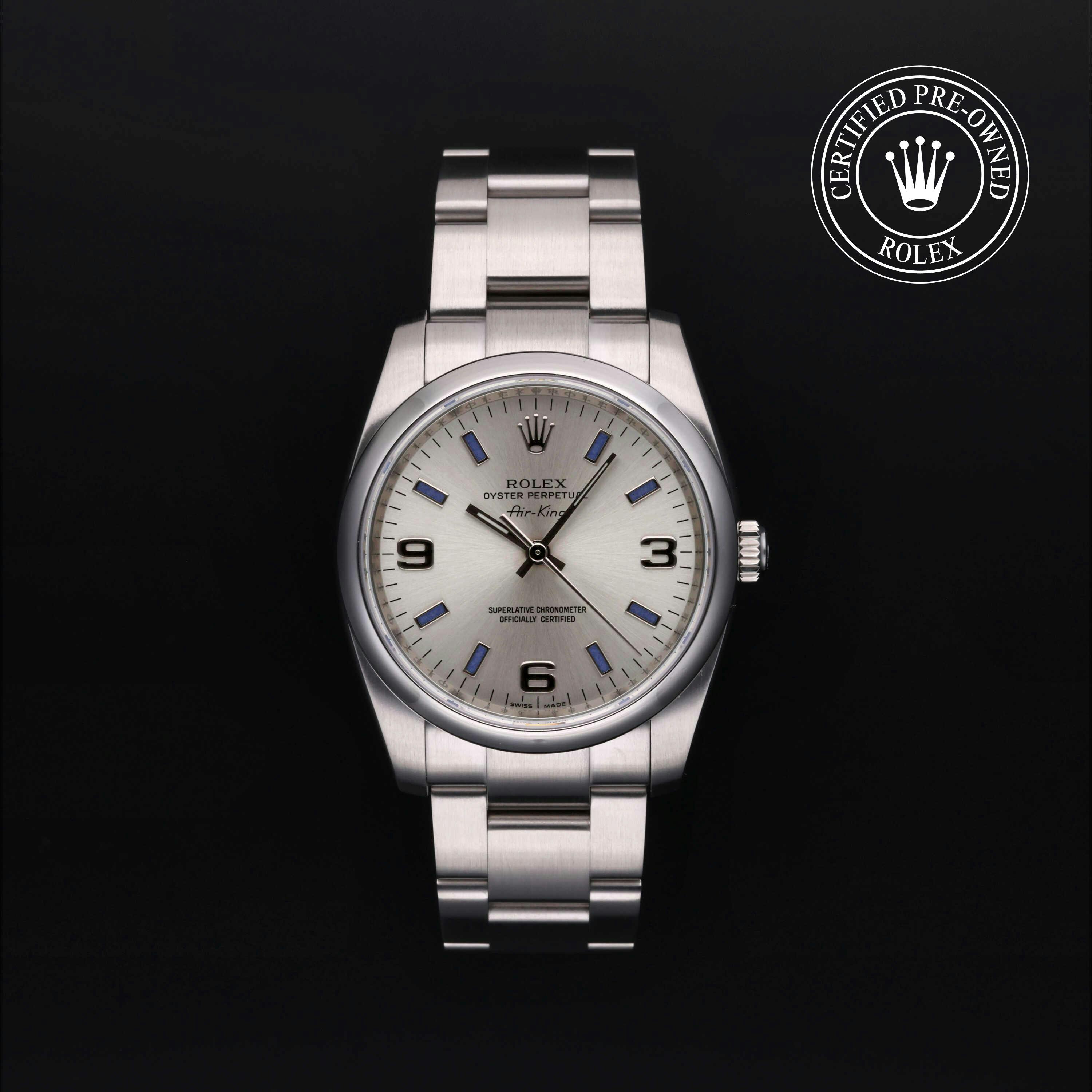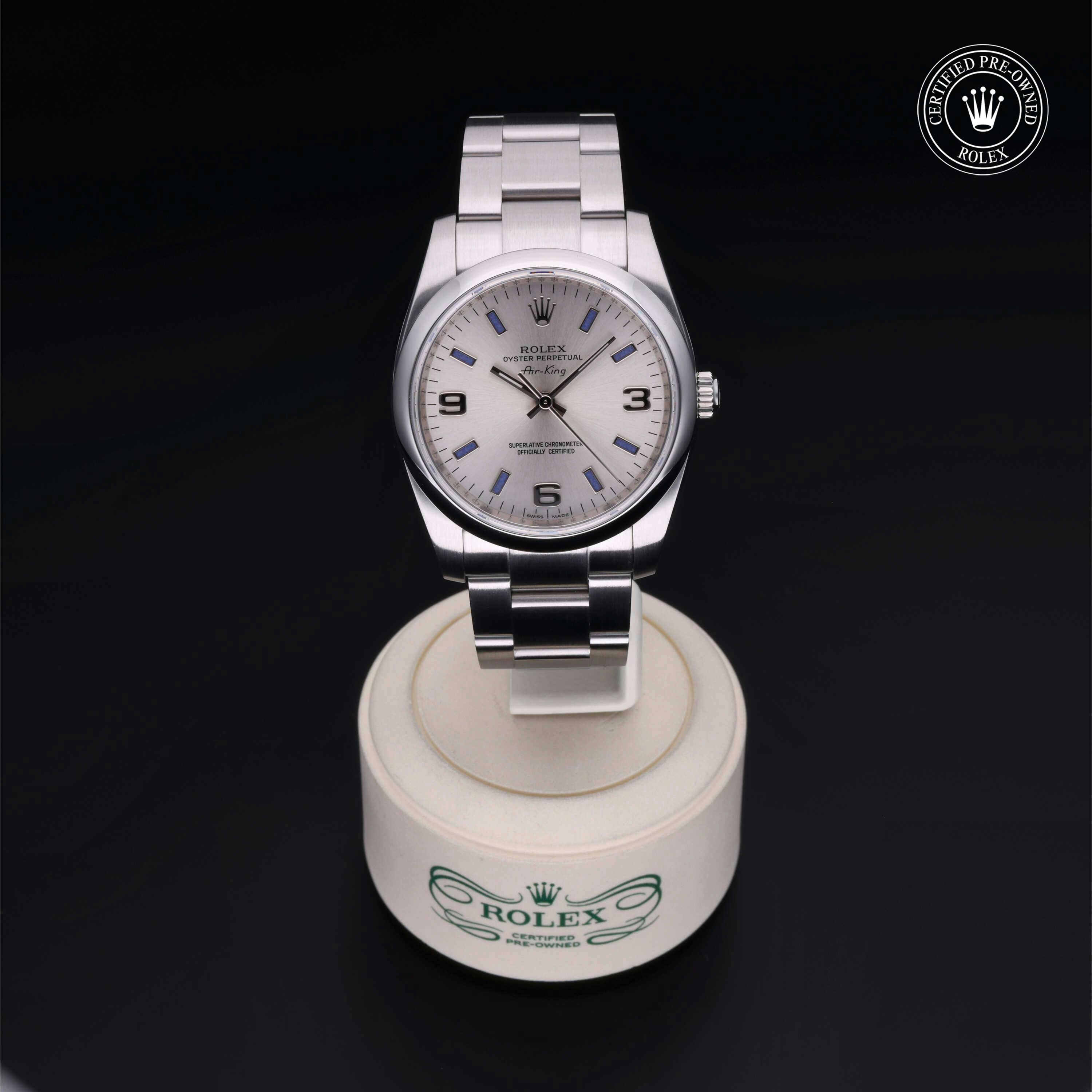 Rolex Certified Pre-Owned Oyster Perpetual Air-King (114200) self - winding automatic watch, features a 34mm stainless steel case and domed bezel surrounding a silver dial on a stainless steel oyster bracelet. Functions include hours, minutes and seconds. This watch has received Rolex-authorized service and certification. It does not come with the original box or papers, but includes a custom Rolex Certified Pre-Owned hang tag, travel pouch and RCPO international warranty card.